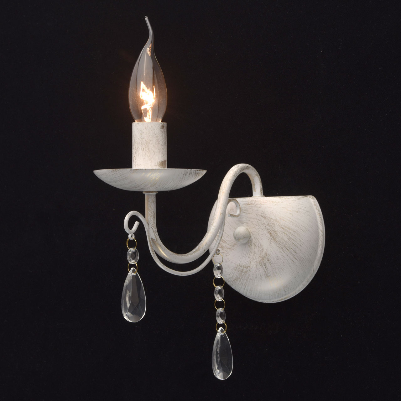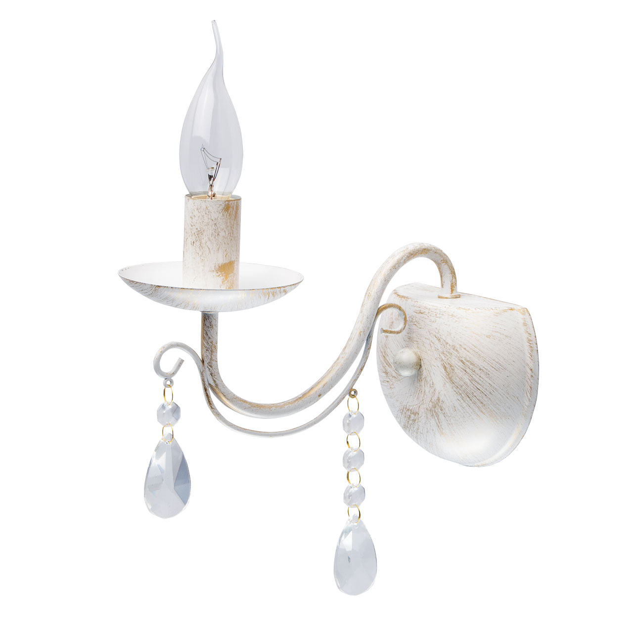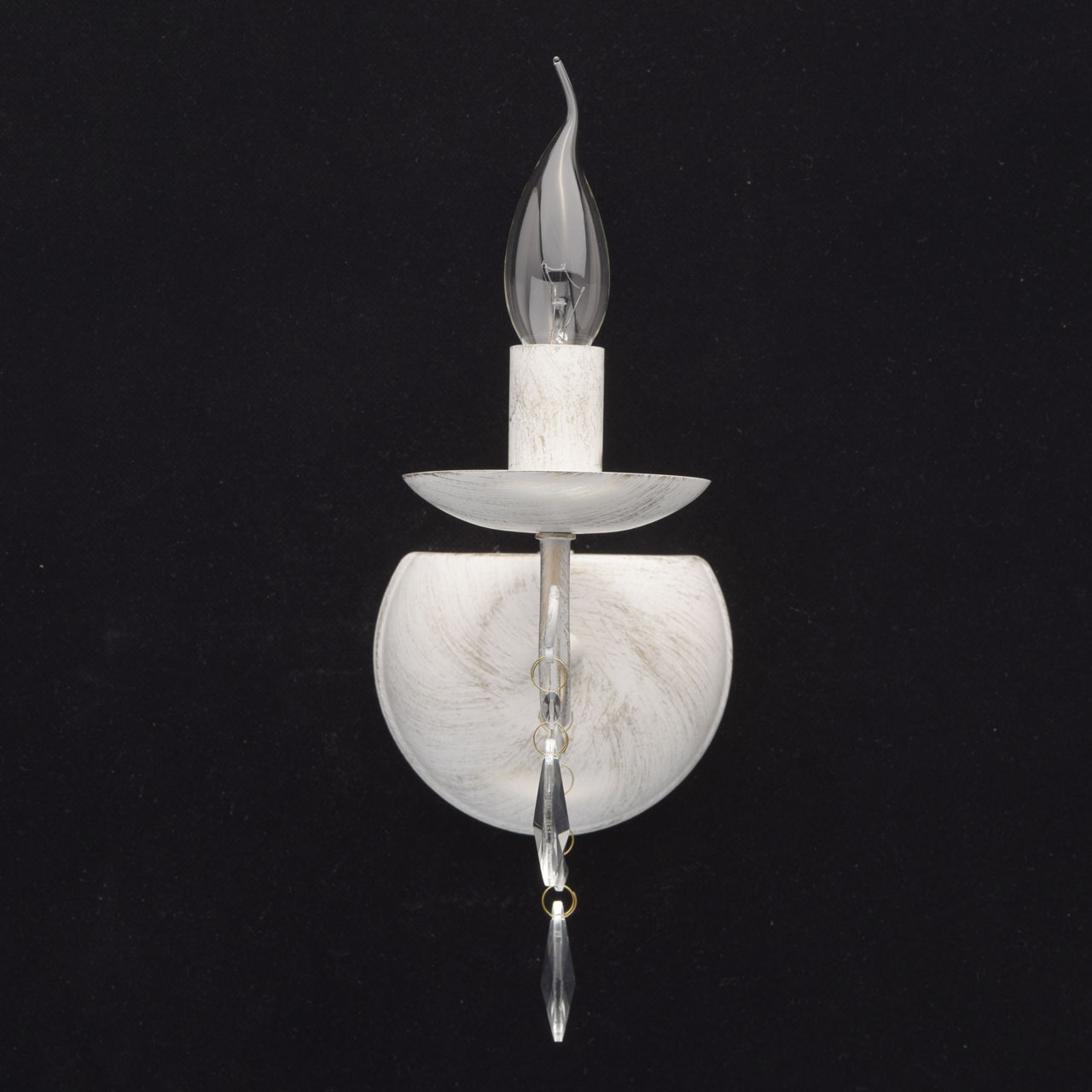 Основание из металла, окрашена по технологии хай-лайт, основной слой белого матового цвета, декоративный слой цвета золота.Декоративные элементы изготовлены из металла по технологии проката на роликовом станке, розетки — технология токарной обработки.Декор: подвески из декоративного прозрачного стекла