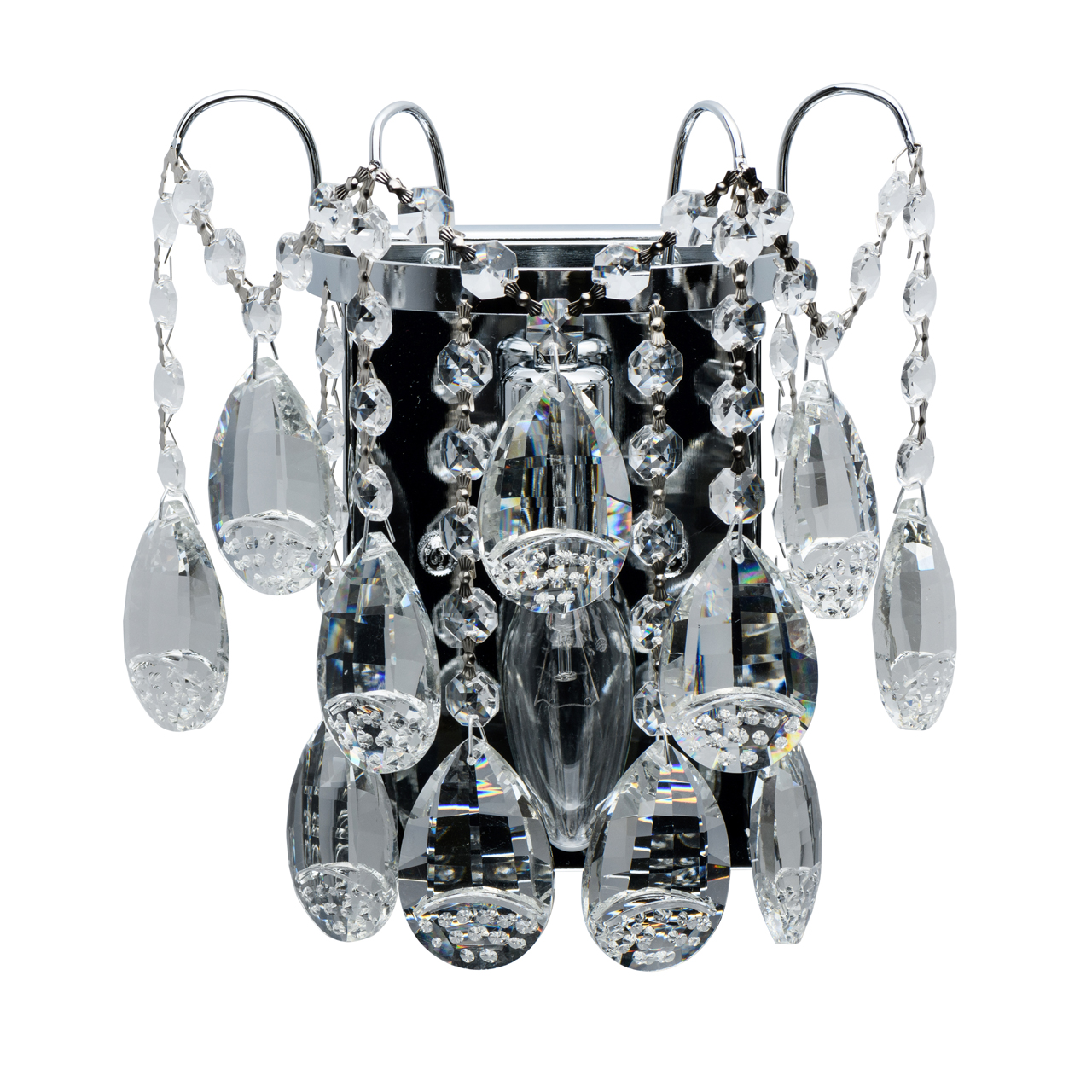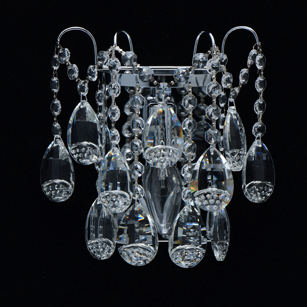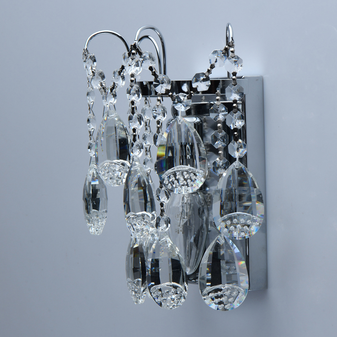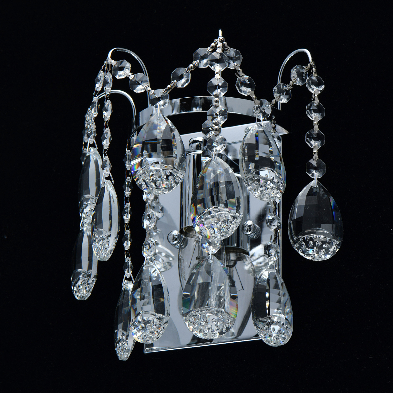 Основание светильника выполнено из металла и гальванизировано в цвет хрома. Светильник декорирован прозрачным хрусталем формы октагон и миндаль с насечками, выполненными алмазным резцом.