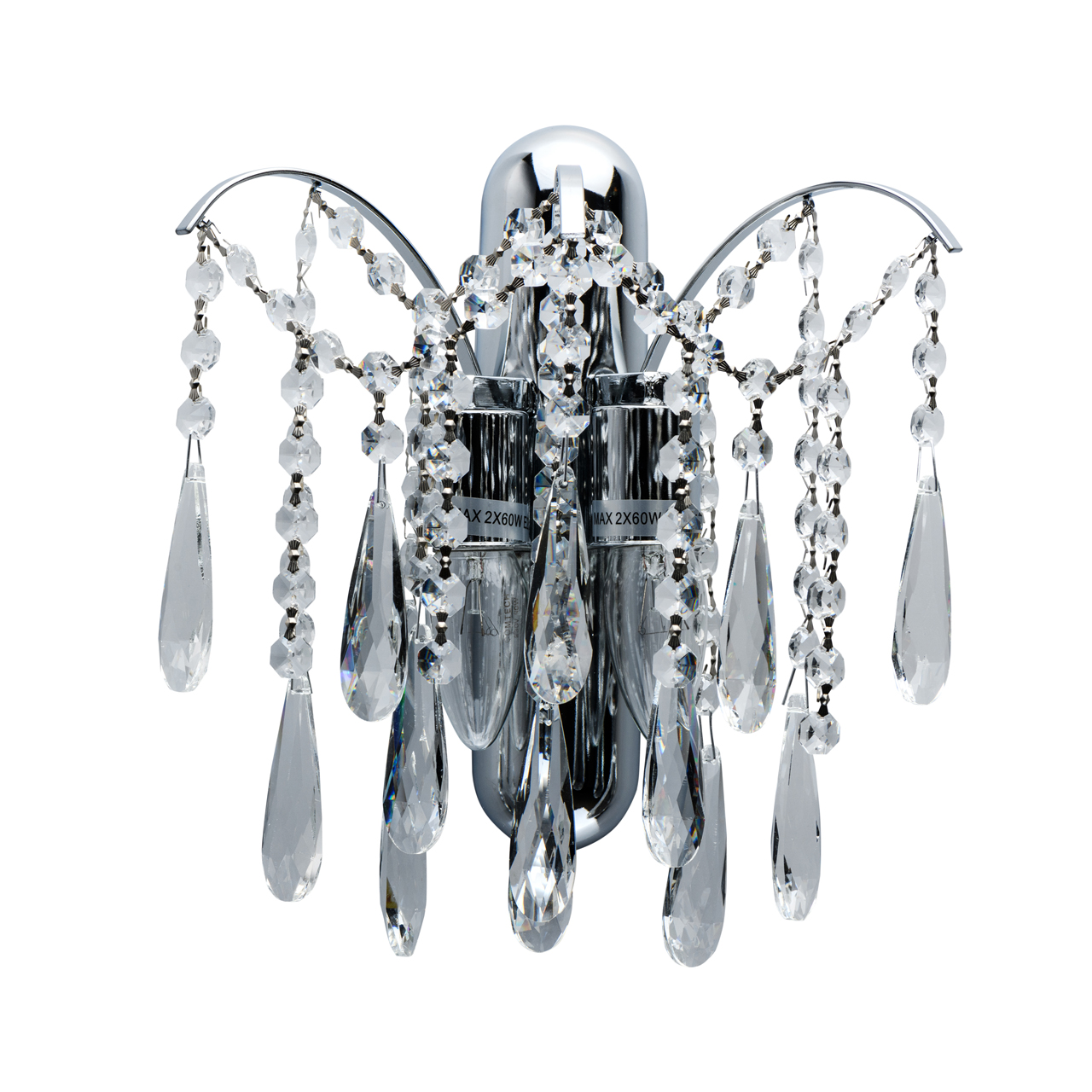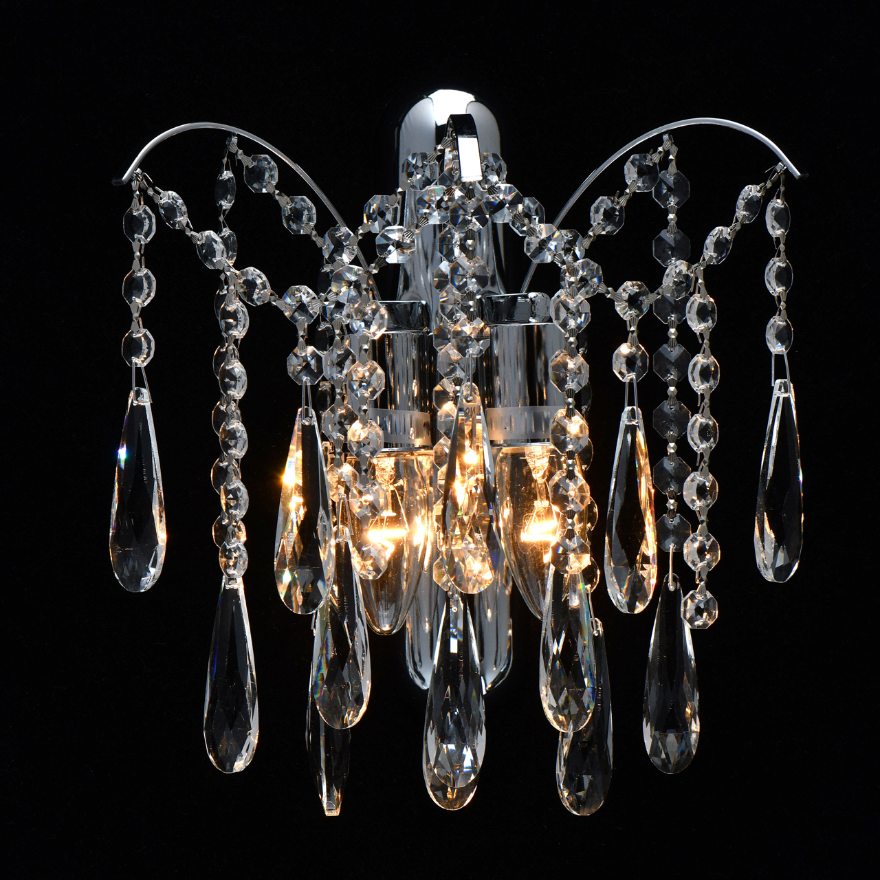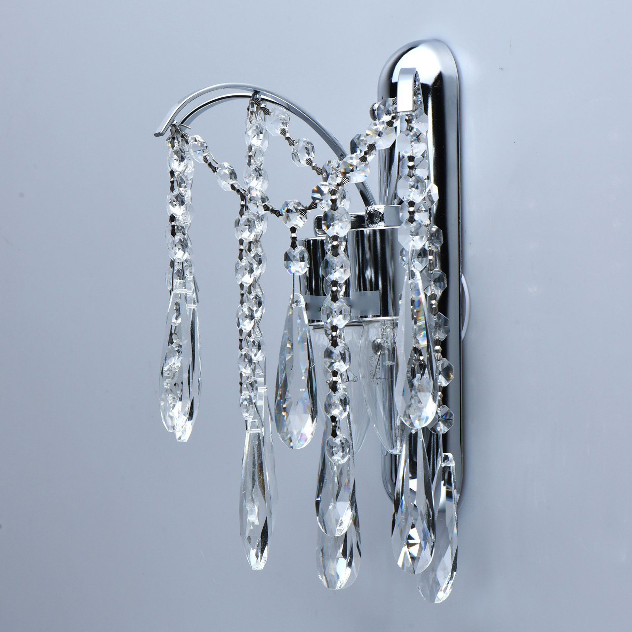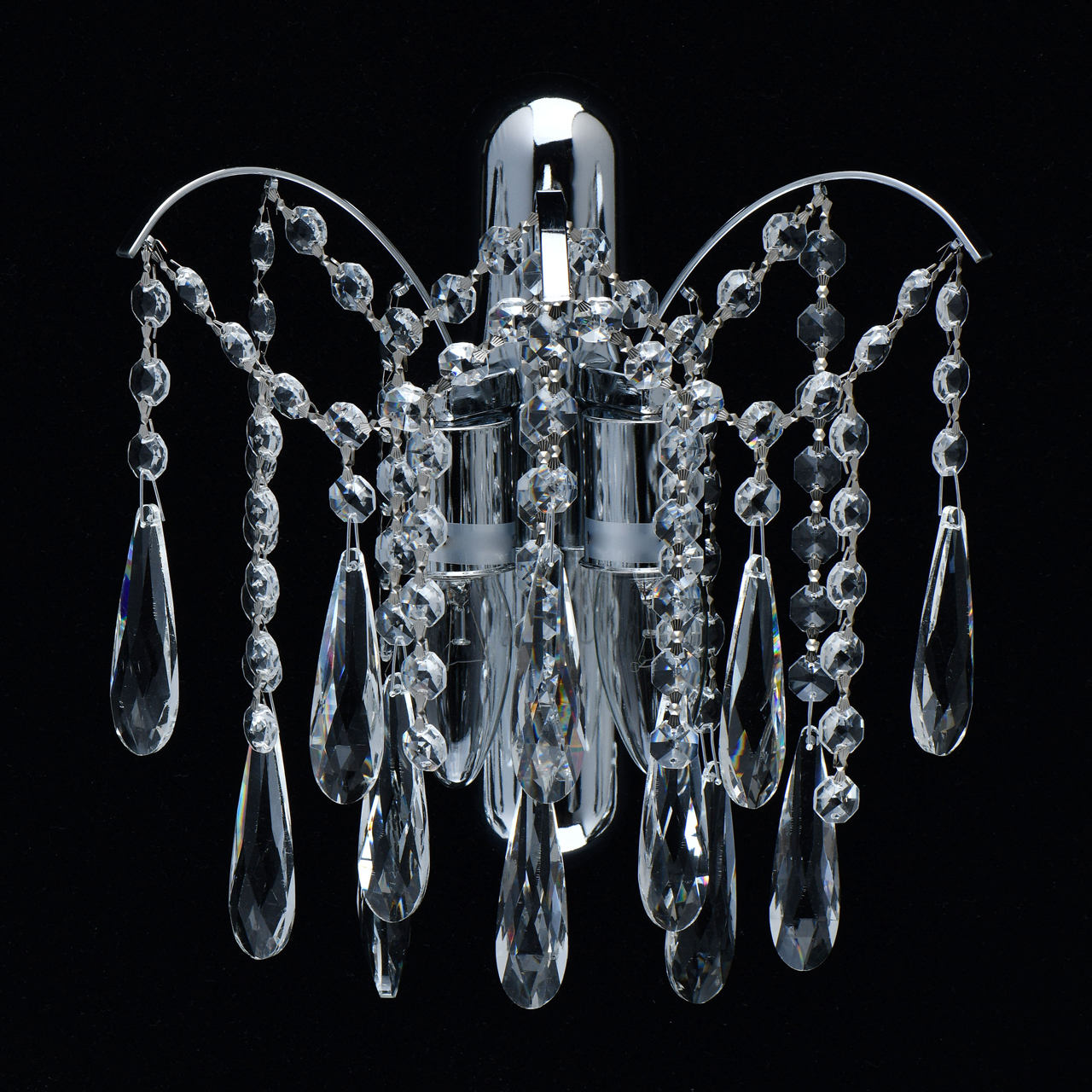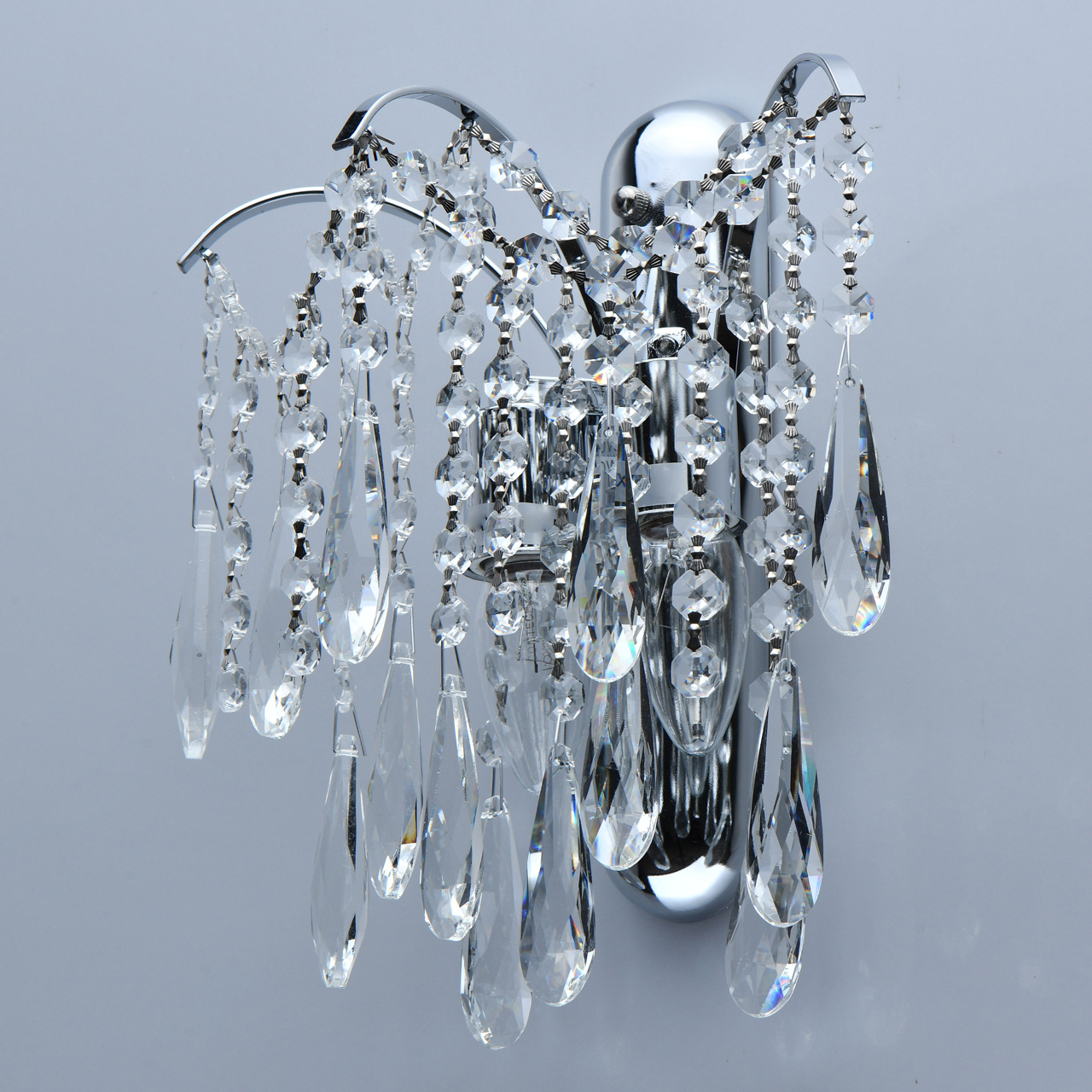 Основание светильника выполнено из металла и гальванизировано в цвет хрома. Светильник декорирован прозрачным хрусталем формы октагон и капля.