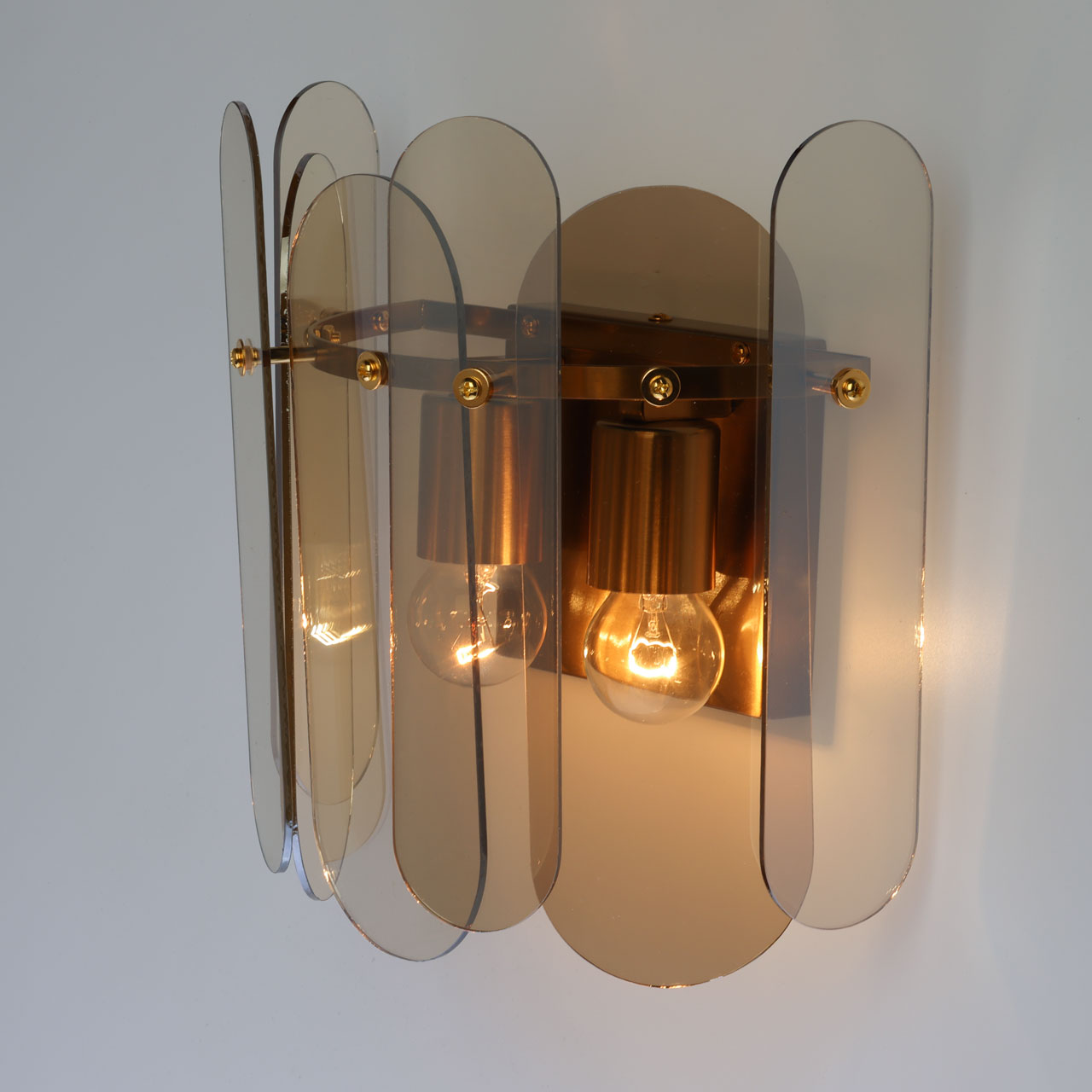 Металлическое основание настенного бра гальванизировано в цвет бронзы. Вертикальное бра декорировано стеклом овальной формы, гальванизированным в цвет топаз.