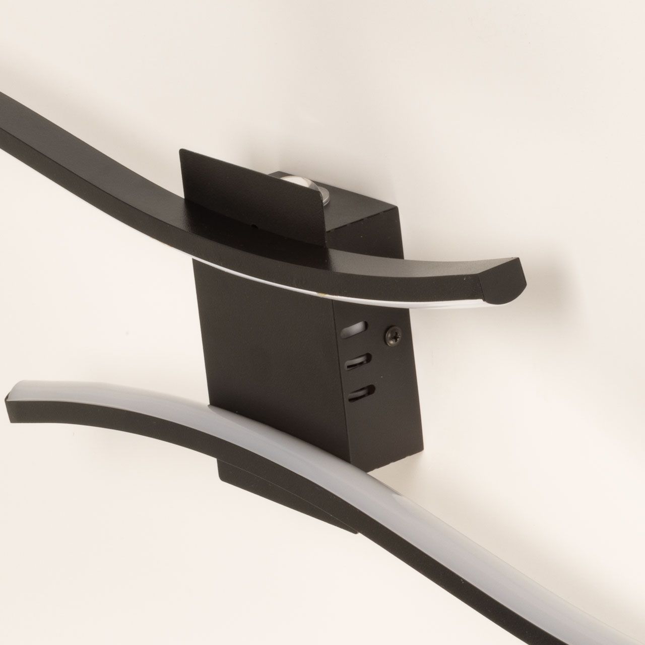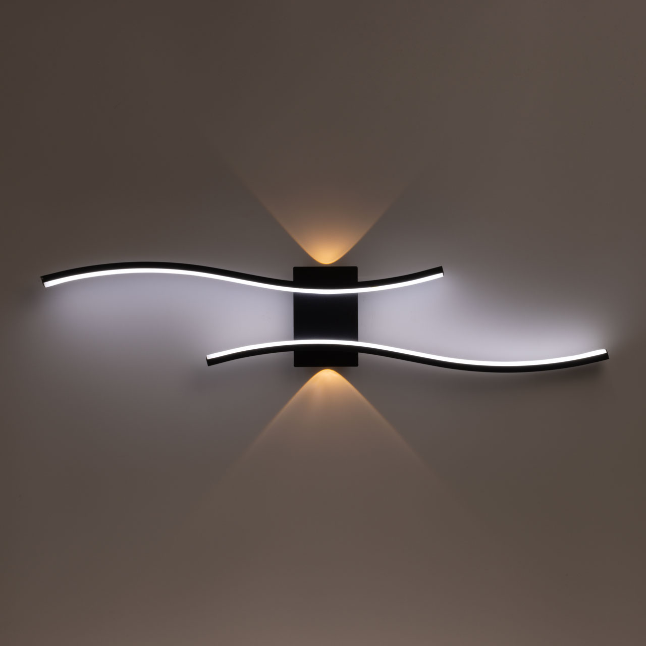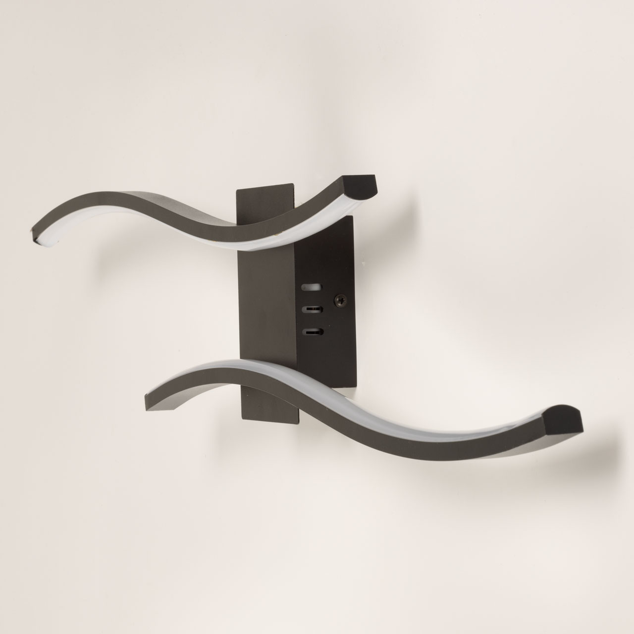 Металлическое основание настенного бра окрашено в черный цвет. Плафоны выполнены из сплава алюминия и окрашены в черный цвет. Светодиодные источники света закрыты белым матовым силиконом и прозрачным акрилом.