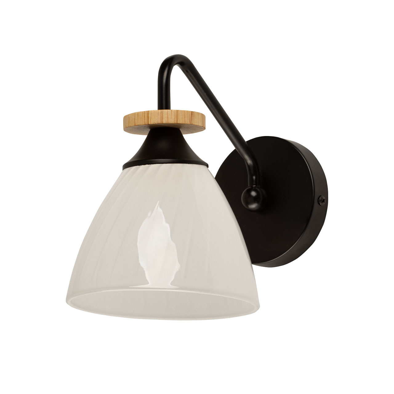 Металлическое основание бра окрашено в черный цвет. Стеклянный плафон отлит в форму и окрашен в белый цвет с внутренней стороны. Светильник декорирован элементом из натурального светлого дерева.