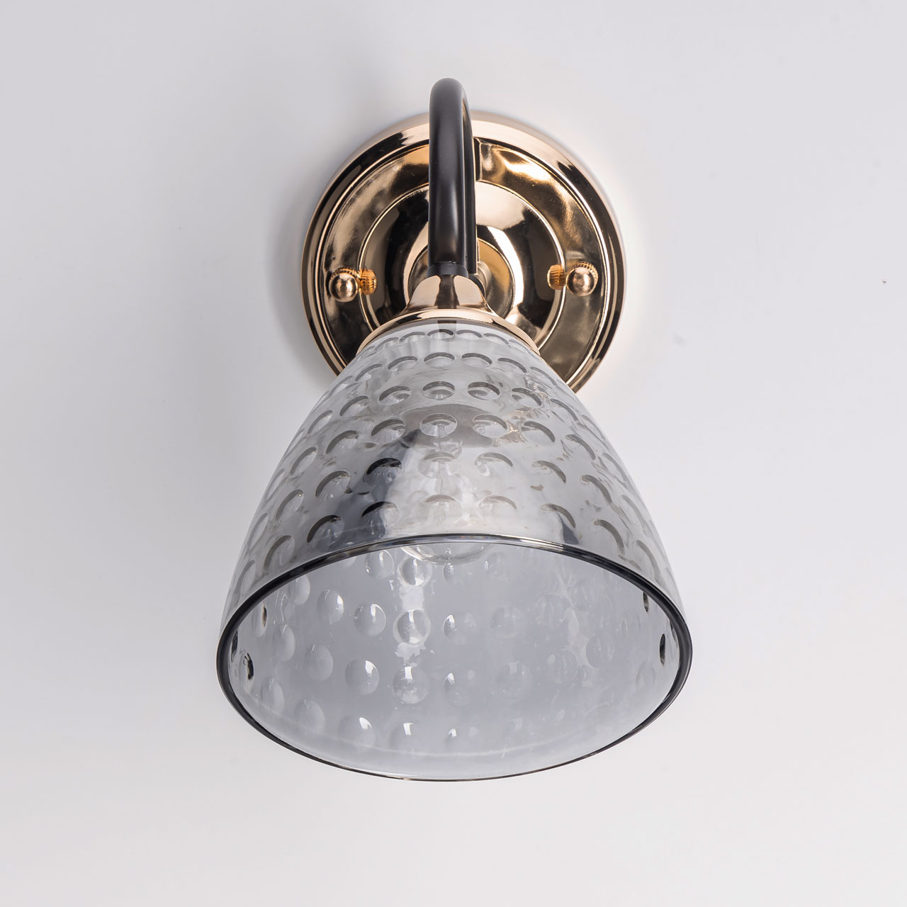 Металлическое основание настенного бра гальванизировано в цвет золота. Отдельные элементы окрашены в цвет кофе. Светильник декорирован выдувным в форму стеклянным плафоном, гальванизированными в дымчатый цвет.