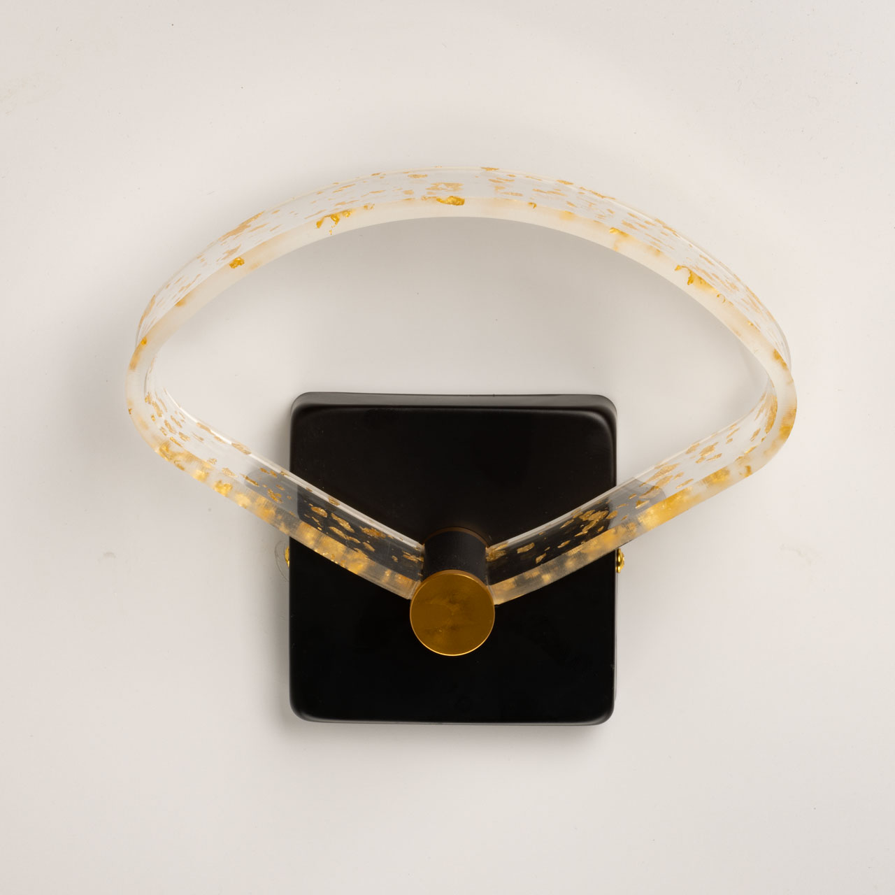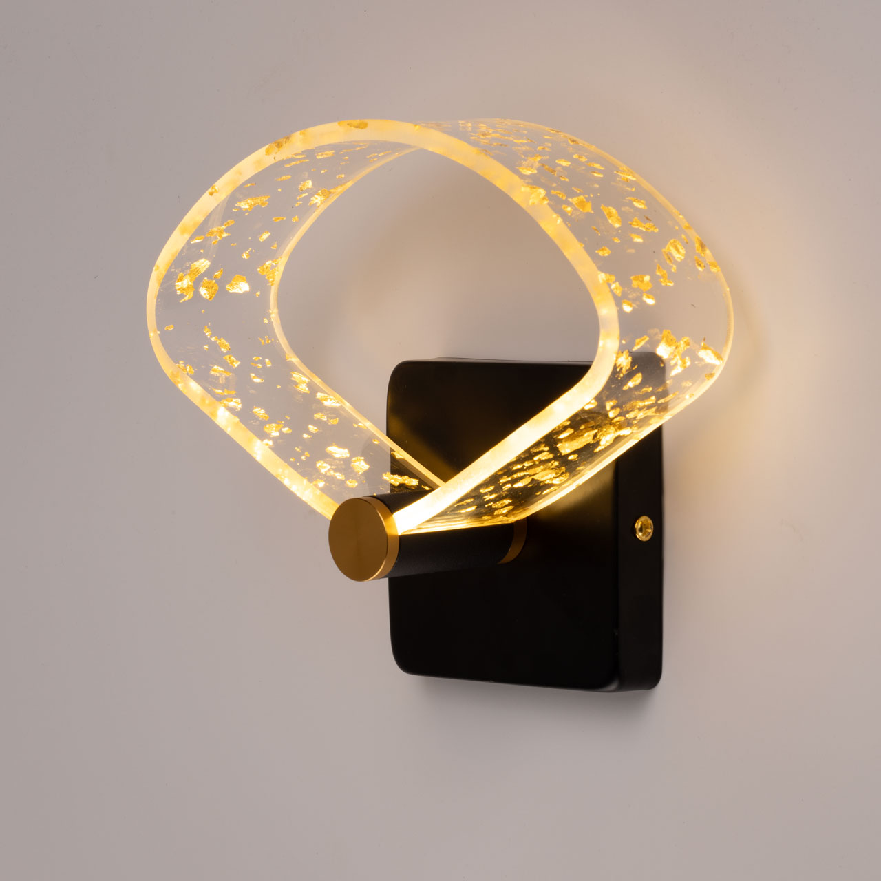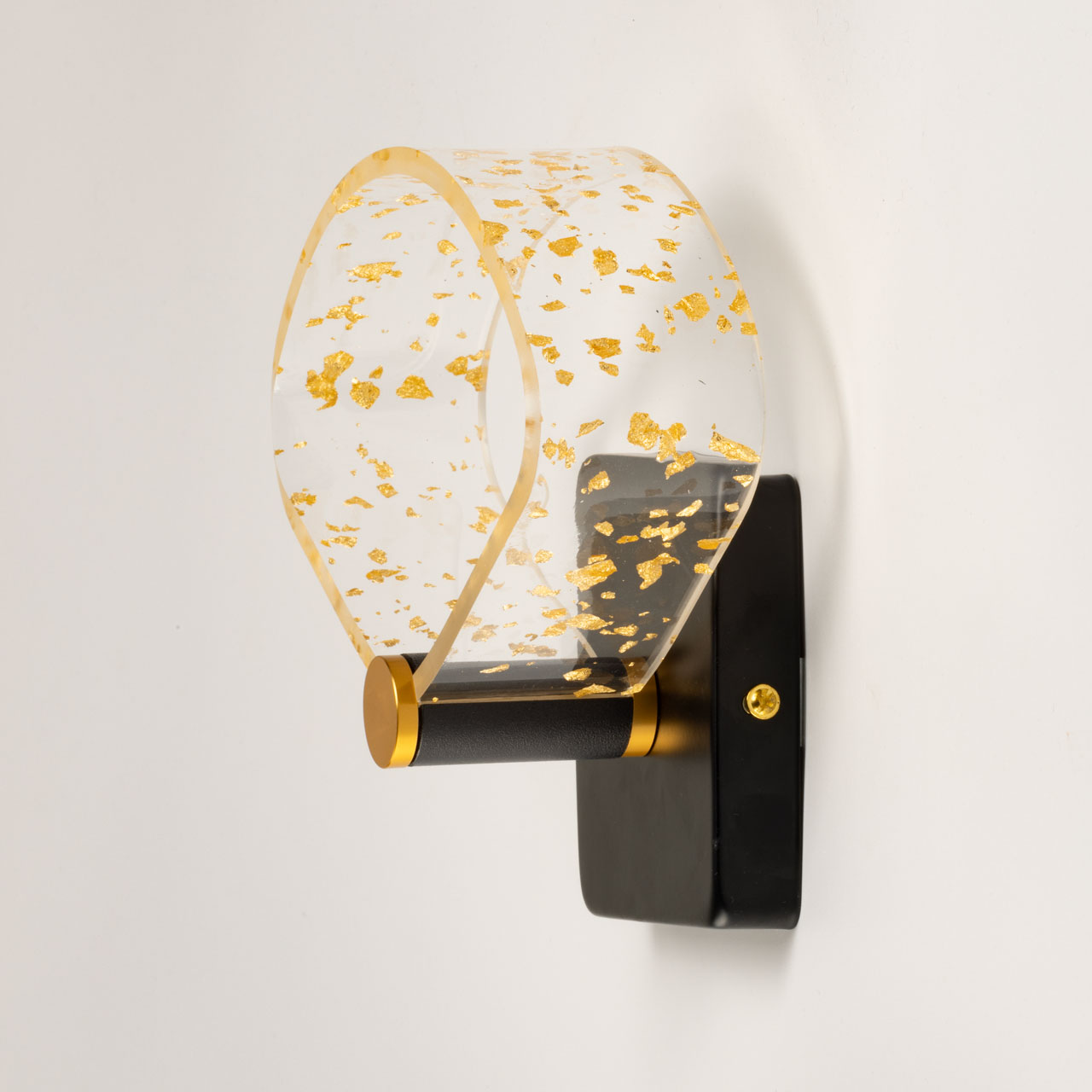 Металлическое основание настенного бра окрашено в черный цвет. Корпус плафона выполнен из сплава алюминия и окрашен в цвет основания. Отдельные элементы плафона гальванизированы в цвет золота. Настенное бра декорировано прозрачным акрилом с вкраплениями золотого цвета.