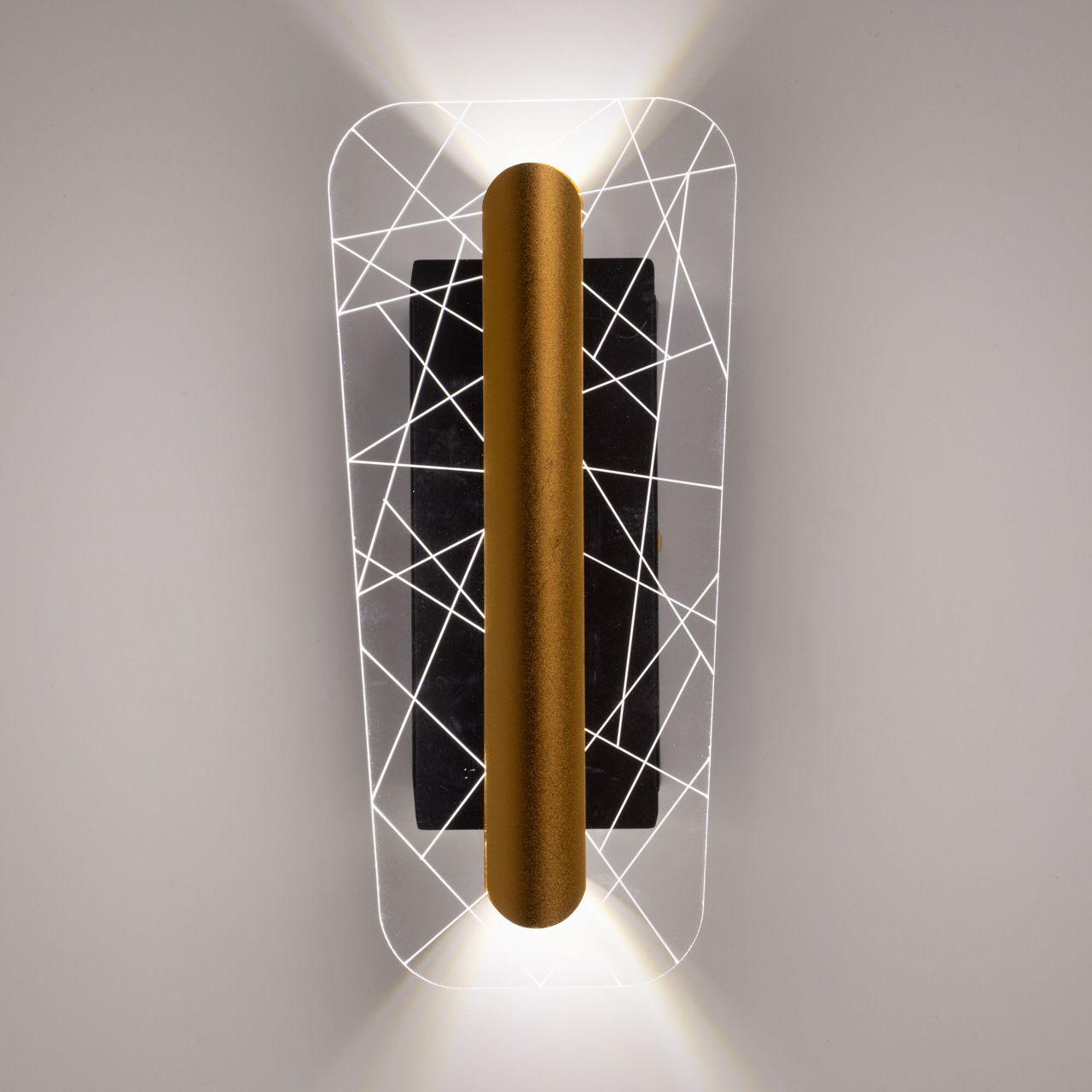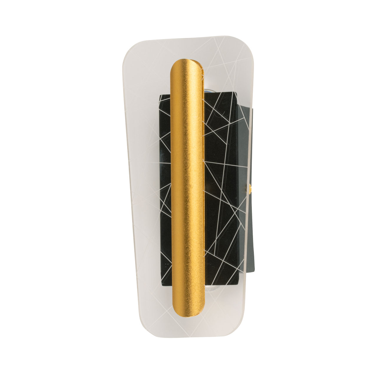 Металлическое основание настенного бра окрашено в черный цвет. Корпус плафона выполнен из сплава алюминия и окрашен в цвет золота. Плафон декорирован прозрачным акрилом с линейным рисунком.