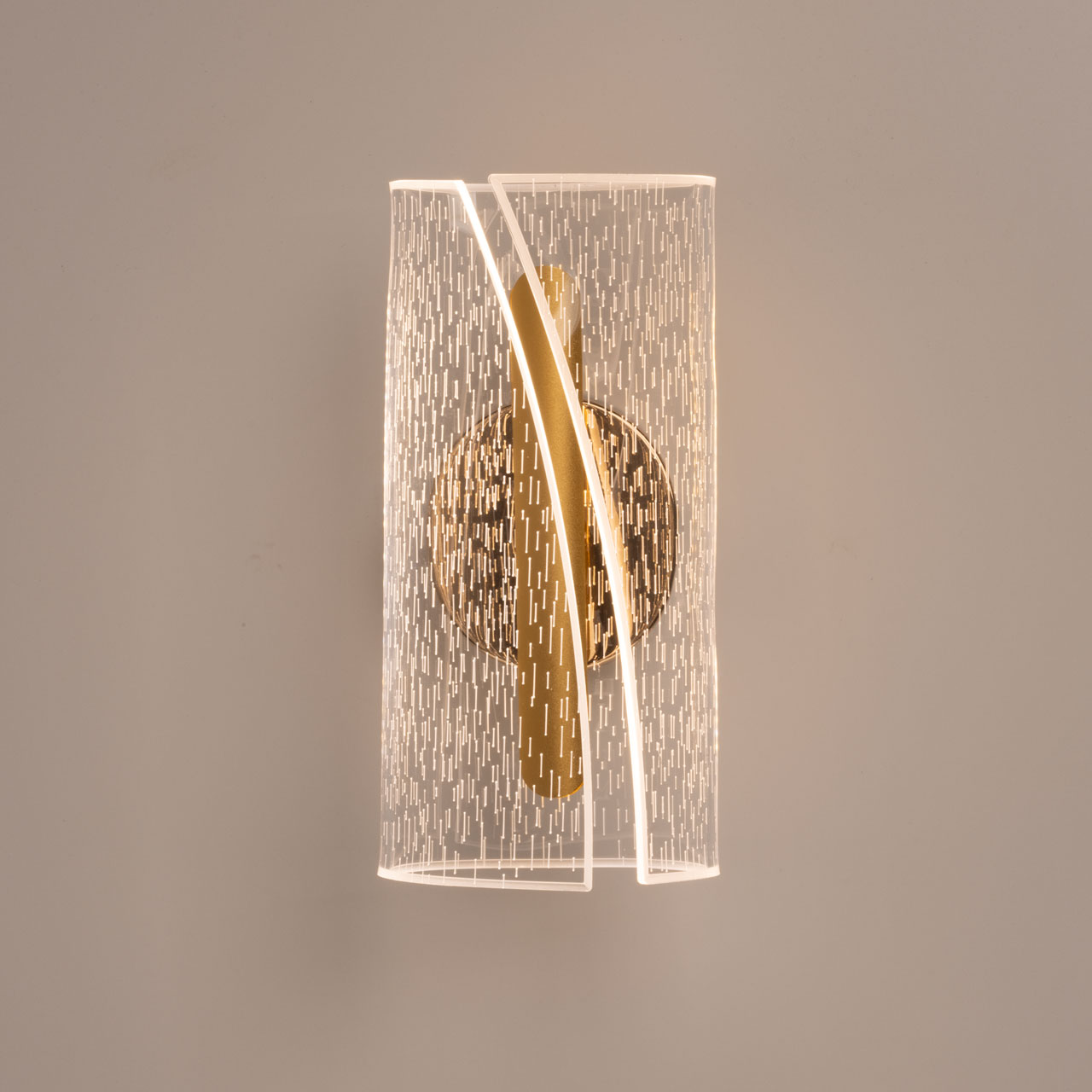 Металлический корпус настенного бра гальванизирован в цвет золота. Корпус плафона выполнен из сплава алюминия и окрашен в цвет золота. Настенное бра декорировано изящным элементом из прозрачного акрила с графичным рисунком.