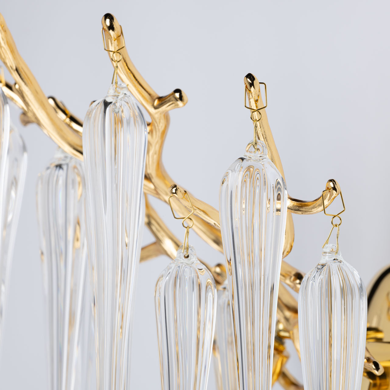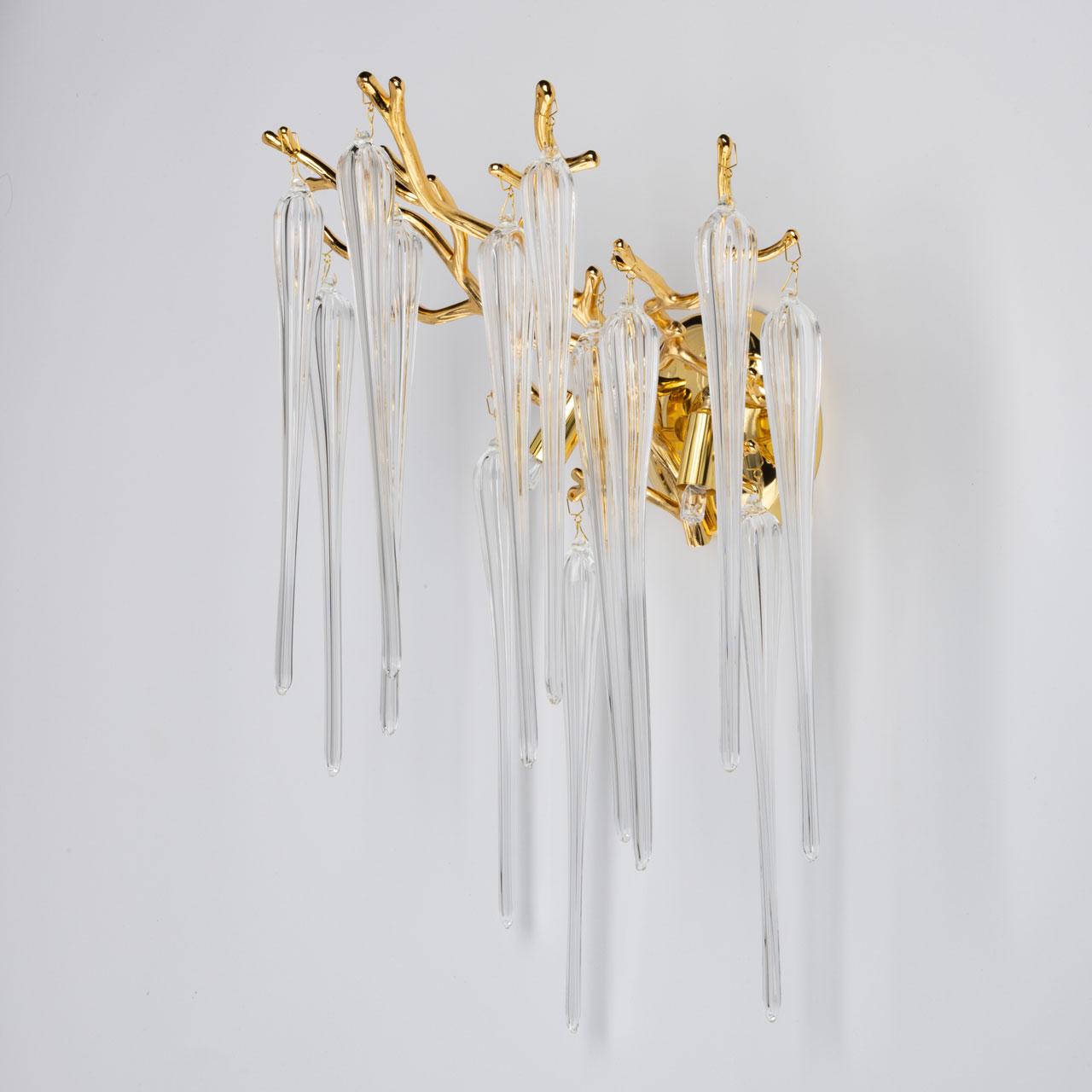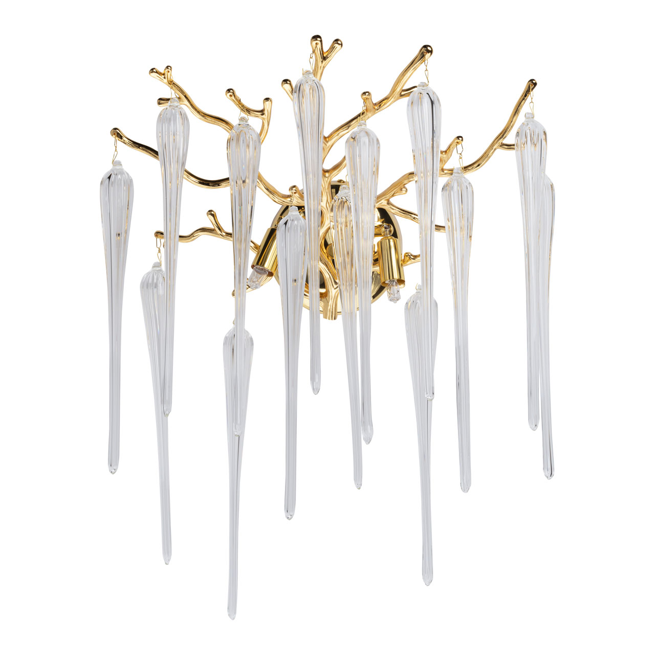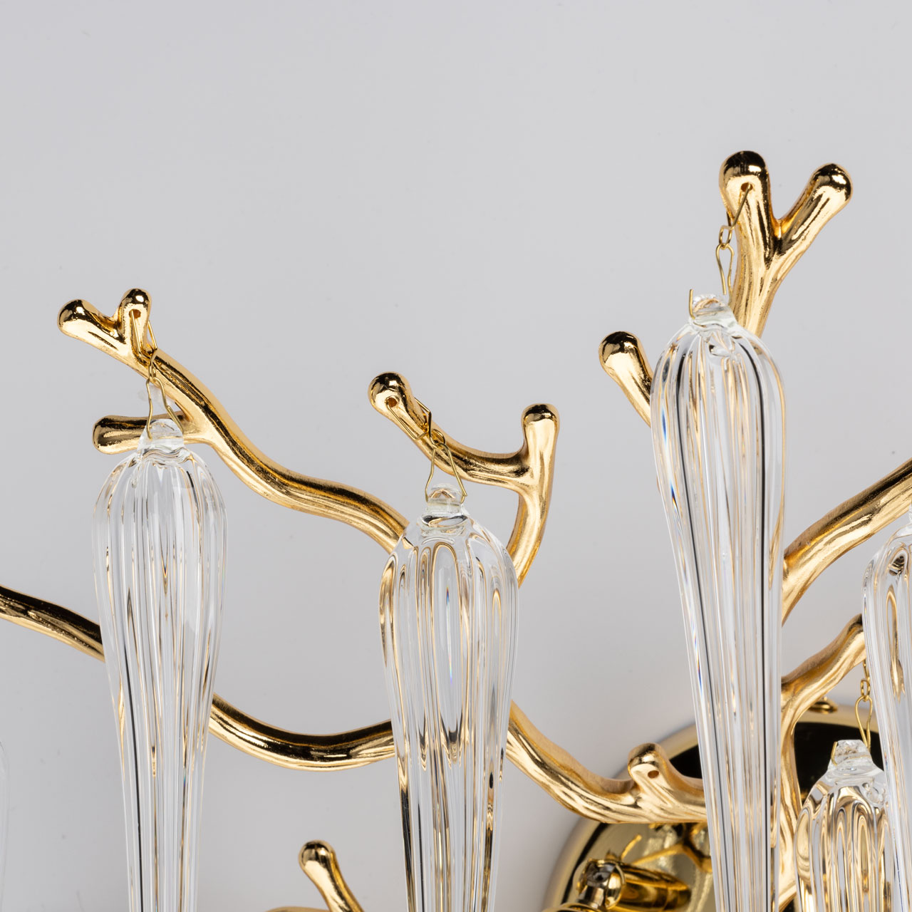 Основание настенного бра выполнено по технологии художественного литья из сплава алюминия с цинком и гальванизировано в цвет золота. Настенное бра декорировано прозрачным стеклом вытянутой формы.