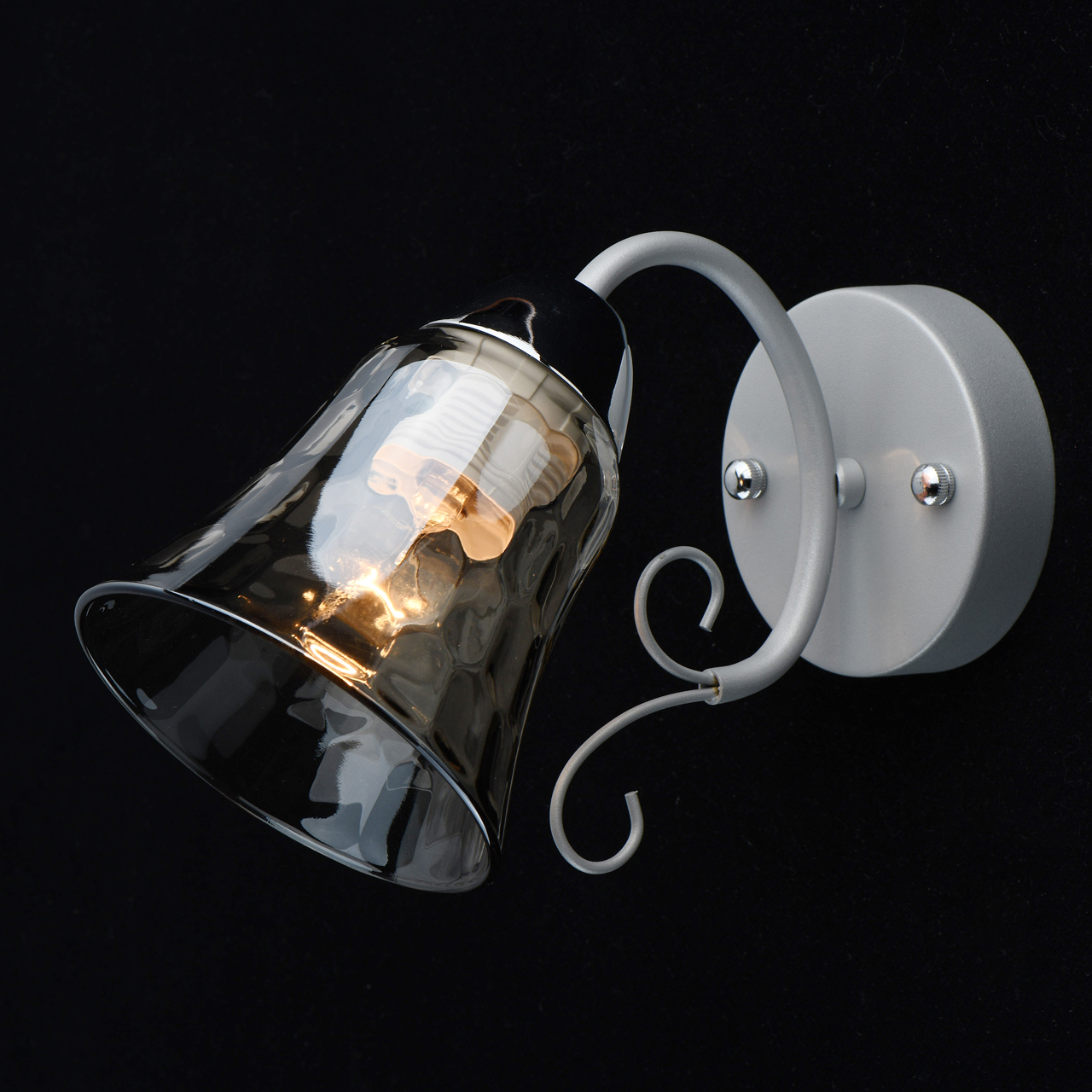 Металлическое основание бра обработано по технологии порошкового окрашивания в серебряный цвет. Отдельные элементы основания гальванизированы в цвет хрома. Рельефный стеклянный плафон отлит в сложную форму и гальванизирован в дымчатый цвет.