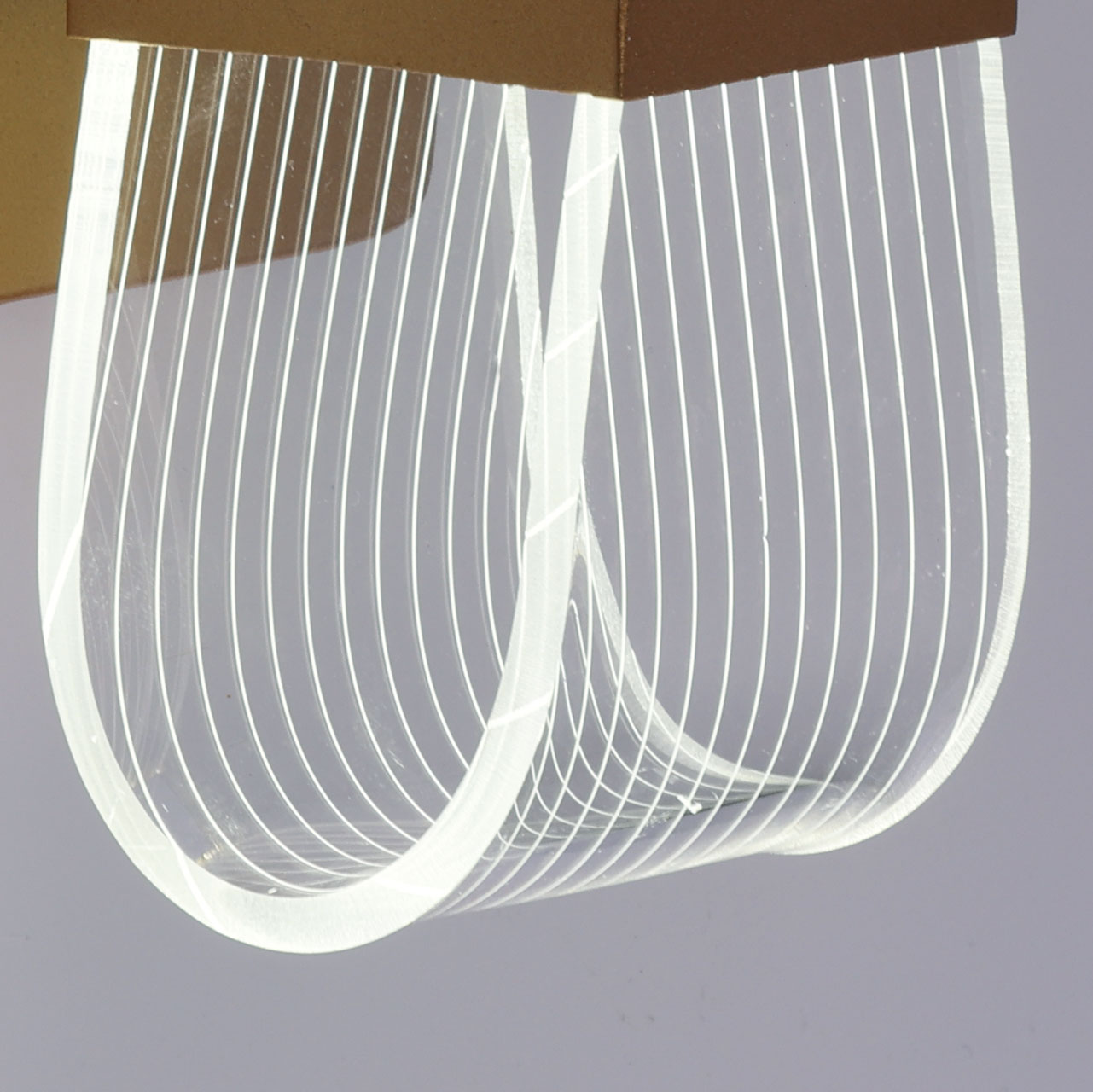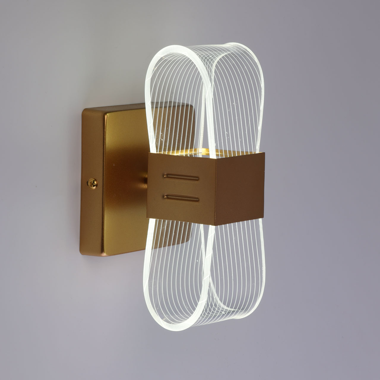 Металлическое основание настенного бра окрашено в матовое золото. Светодиодные источники света закрыты прозрачным акрилом.