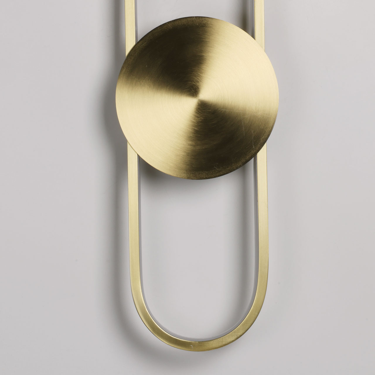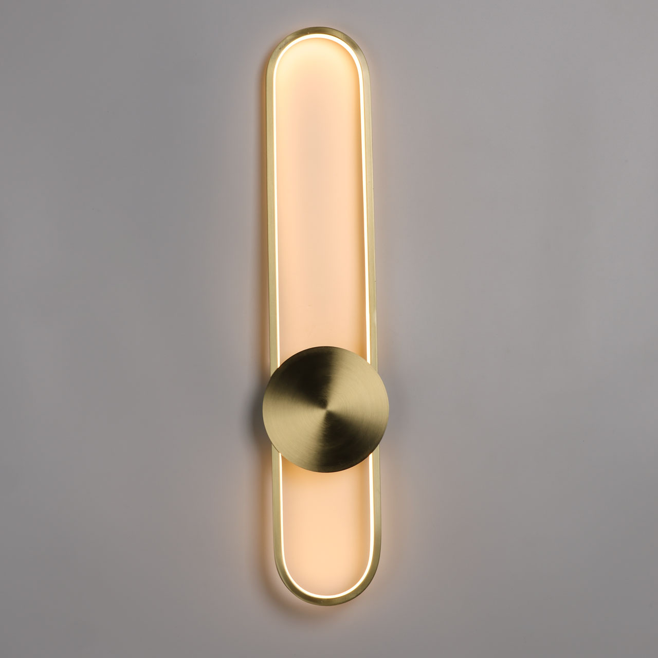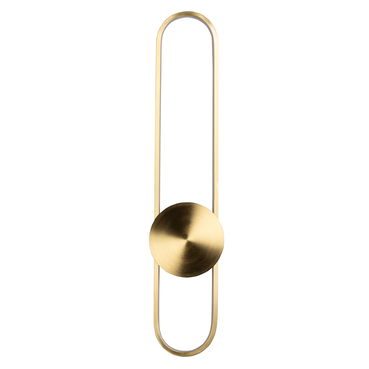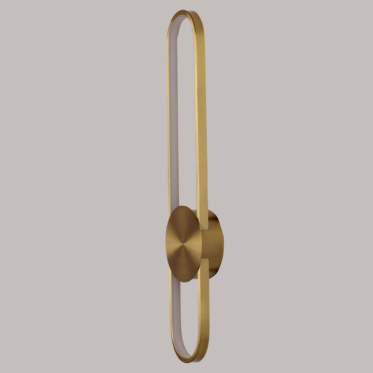 Металлическое основание вертикального бра гальванизировано в цвет латуни. Корпус плафона выполнен из сплава алюминия и гальванизирован в цвет основания. Светодиодный источник света закрыт силиконом белого цвета.
