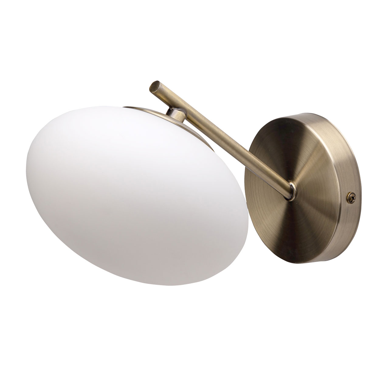 Металлический корпус настенного бра гальванизирован в цвет античной бронзы. Бра декорировано стеклянным плафоном белого цвета в форме продолговатой сферы.