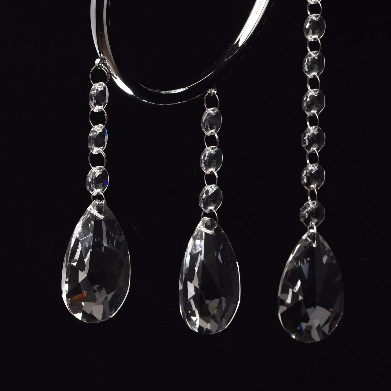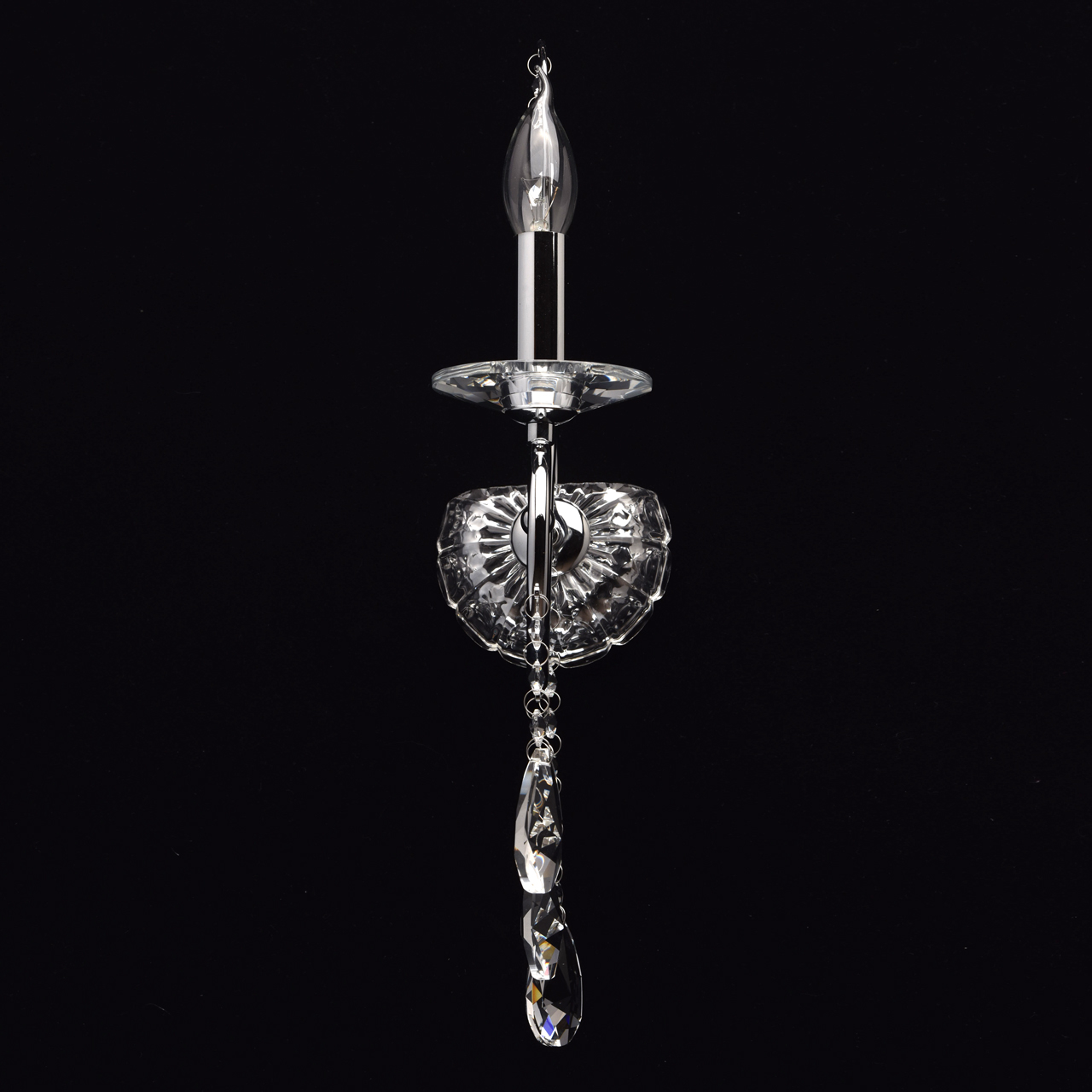 Основание бра: металл, гальванизировано в цвет хрома. Рожок и декоративный элемент выполнены по технологии проката на роликовом станке. Декоративная розетка выполнена из массива хрусталя. Основание закрыто декоративной розеткой из стекла, отлитого в сложную форму. Светильник декорирован подвесками из хрусталя высокого качества формы октагон и миндаль.