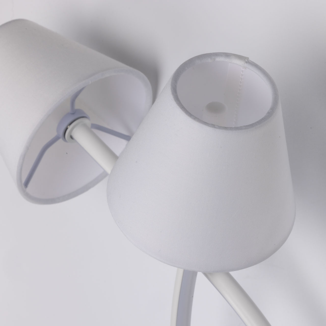 Металлическое основание настенного бра окрашено в белый цвет. Корпус плафонов изогнутой формы выполнен из сплава алюминия с цинком и окрашен в цвет основания. Двухслойные абажуры состоят из текстиля белого цвета и термостойкого акрила с внутренней стороны. Абажуры прошиты. Светодиодные источники света закрыты белым силиконом.