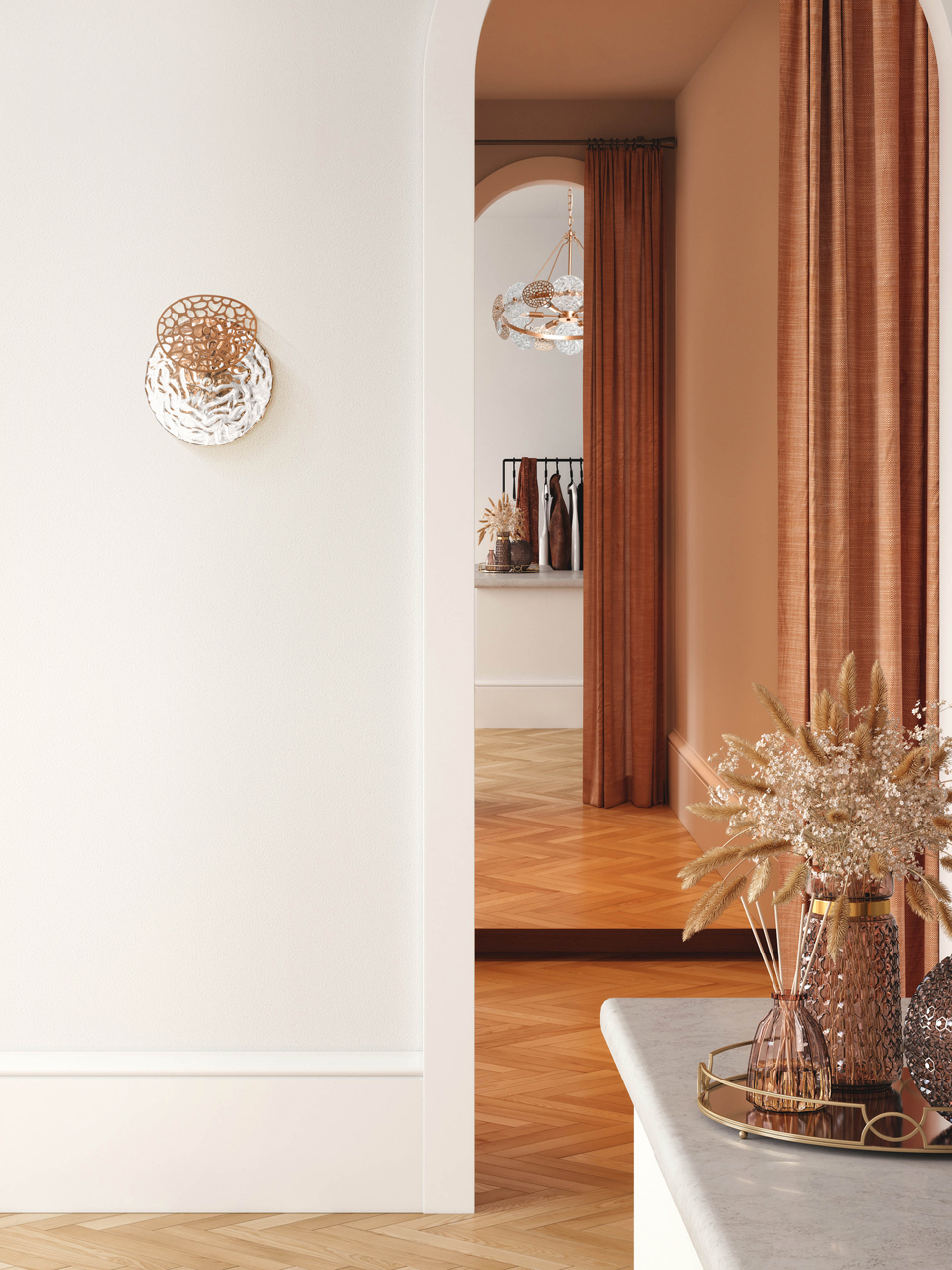 Металлическое основание настенного бра окрашено в матовый золотой цвет. Вертикальное бра декорировано округлыми элементами неправильной формы из фактурного прозрачного стекли и из металла, окрашенного в цвет основания.