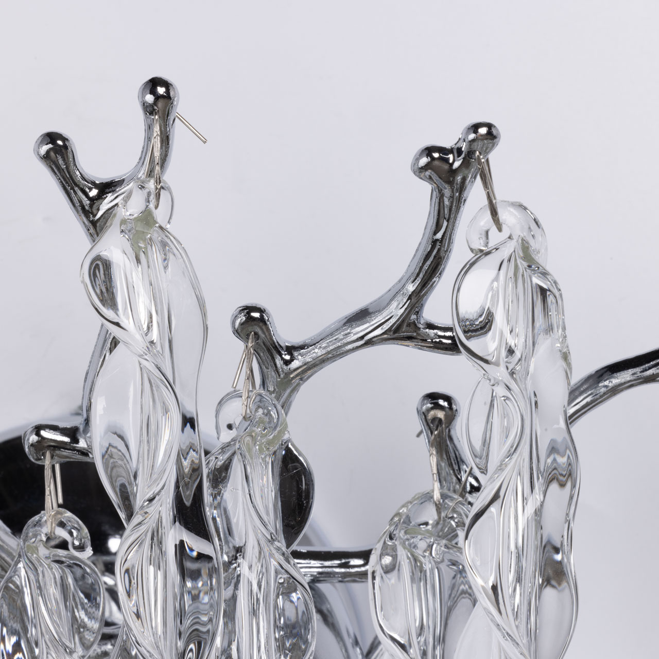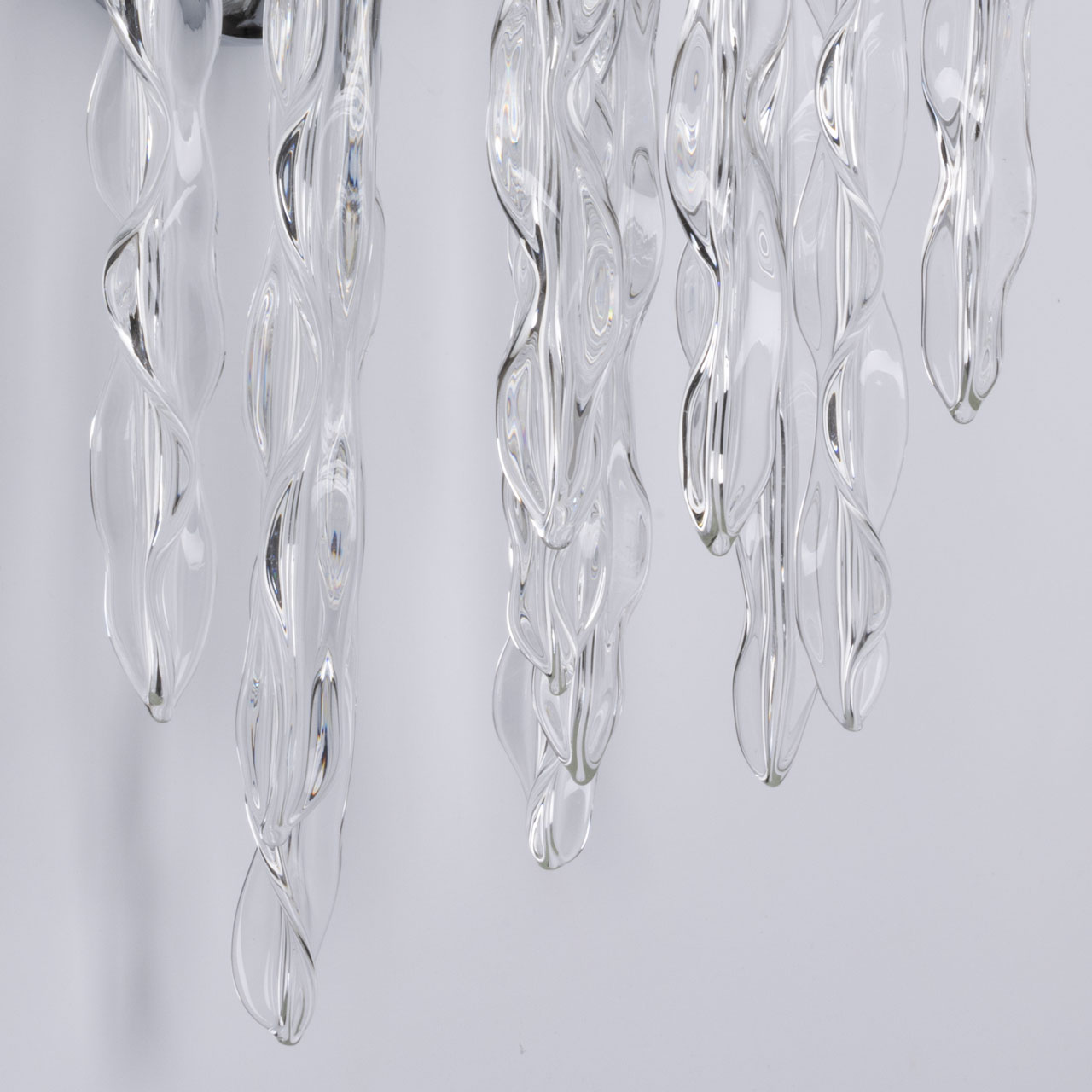 Основание настенного бра выполнено по технологии художественного литья из сплава алюминия с цинком и гальванизировано в цвет хрома. Настенное бра декорировано подвесами из прозрачного стекла оригинальной формы.