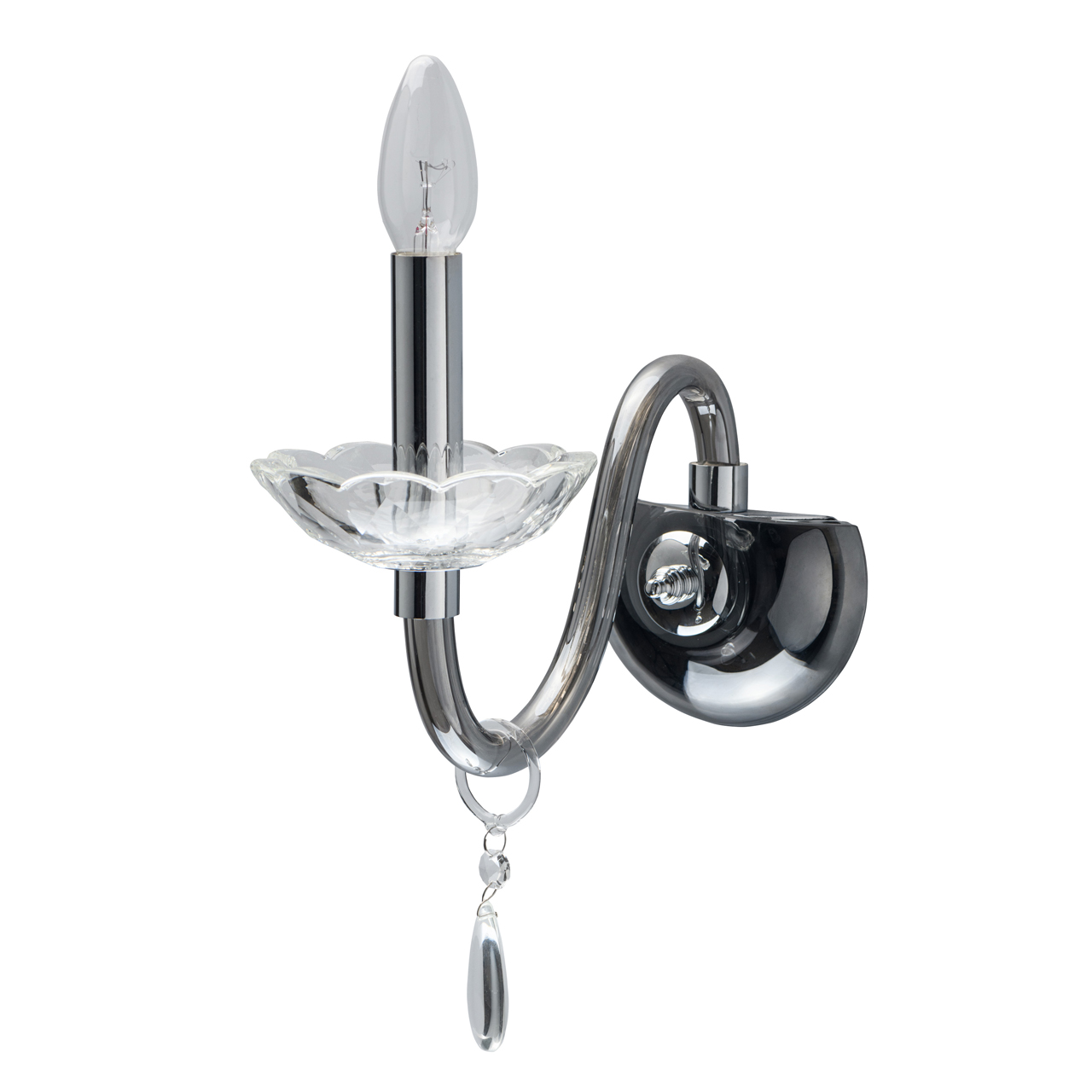 Металлическое основание гальванизировано в цвет хрома и закрыто стеклом ручной работы, гальванизированным в дымчатый цвет. Декоративная розетка отлита из прозрачного стекла в сложную форму. Светильник декорирован прозрачным хрусталем формы октагон и стеклом формы миндаля.