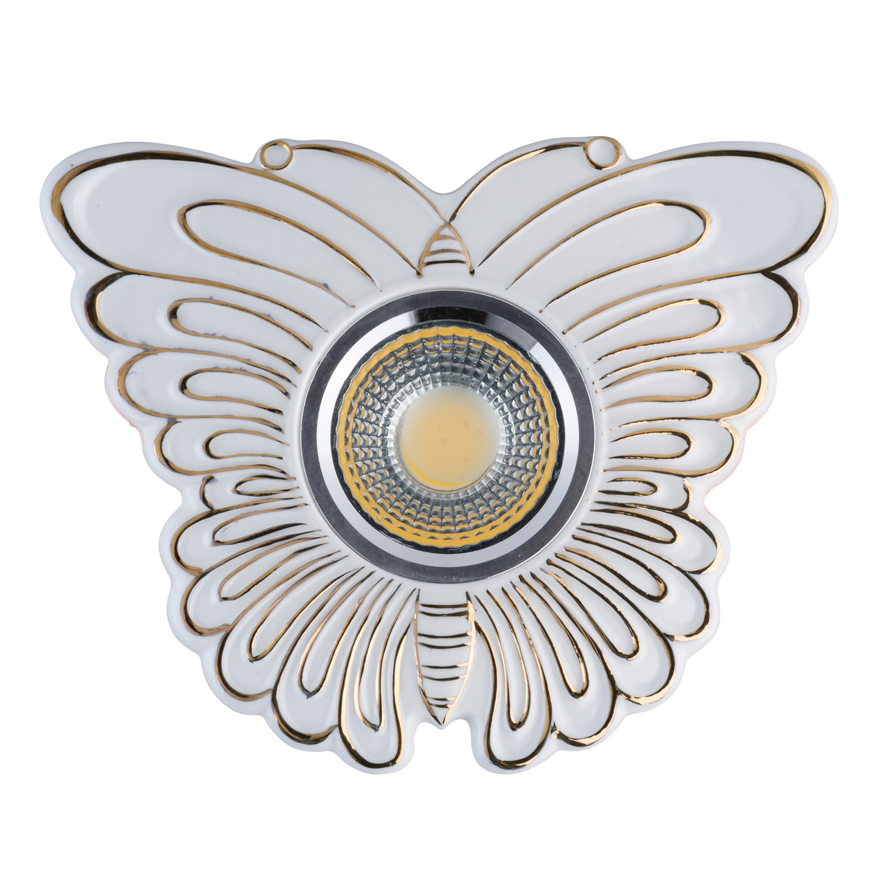Корпус выполнен из глазурированного фарфора белого цвета с надглазурной росписью в цвет золота.Радиатор выполнен из сплава алюминия, окрашен в черный цвет. Светодиоды типа COB закрыты прозрачным стеклом, напротив светодиодов стекло обработано по технологии пескоструйного матирования.