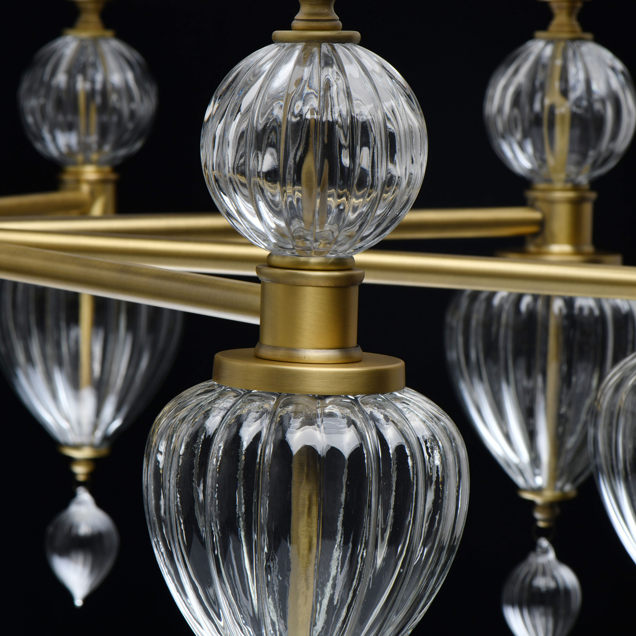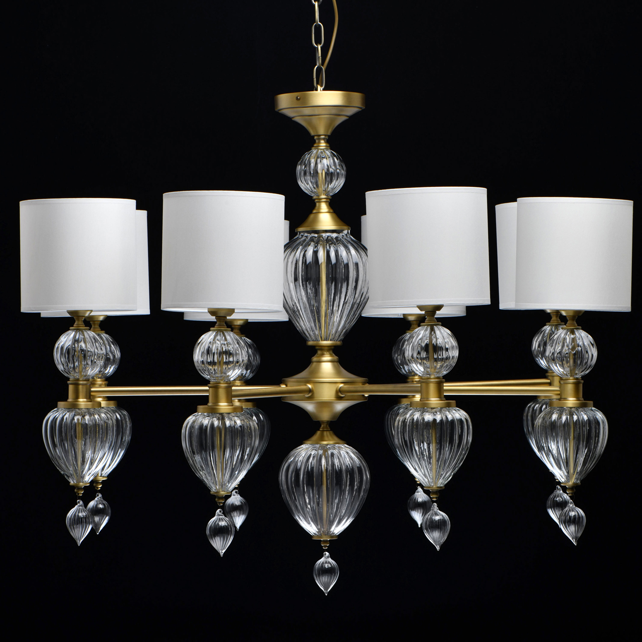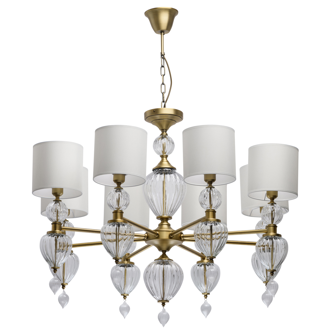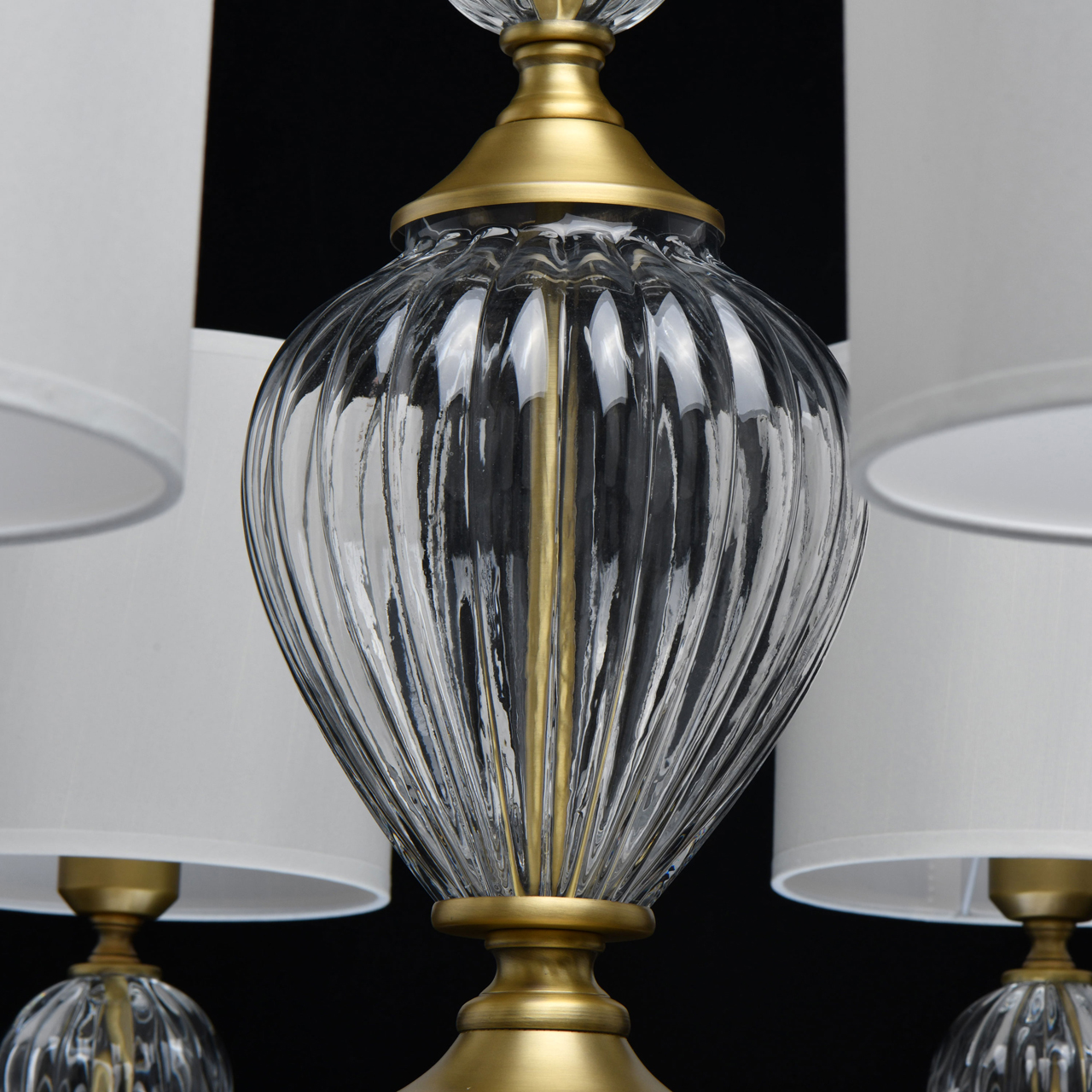 Основание светильника выполнено из металла и гальванизировано в цвет латуни. Светильник декорирован выдувным стеклом ручной работы. Текстильные абажуры белого цвета с термостойким акрилом внутри, отделаны кантом и прошиты.