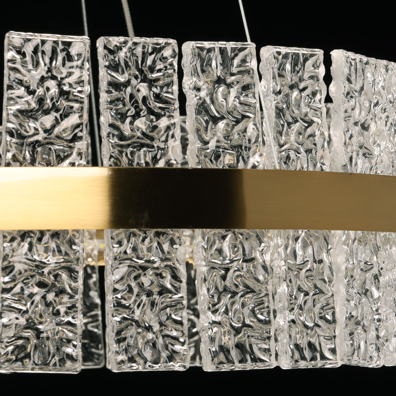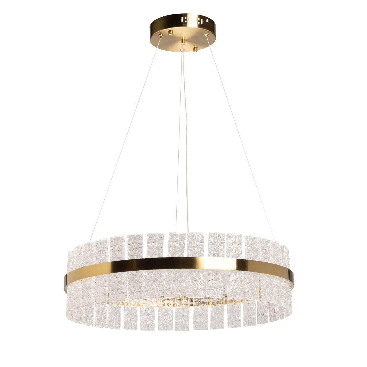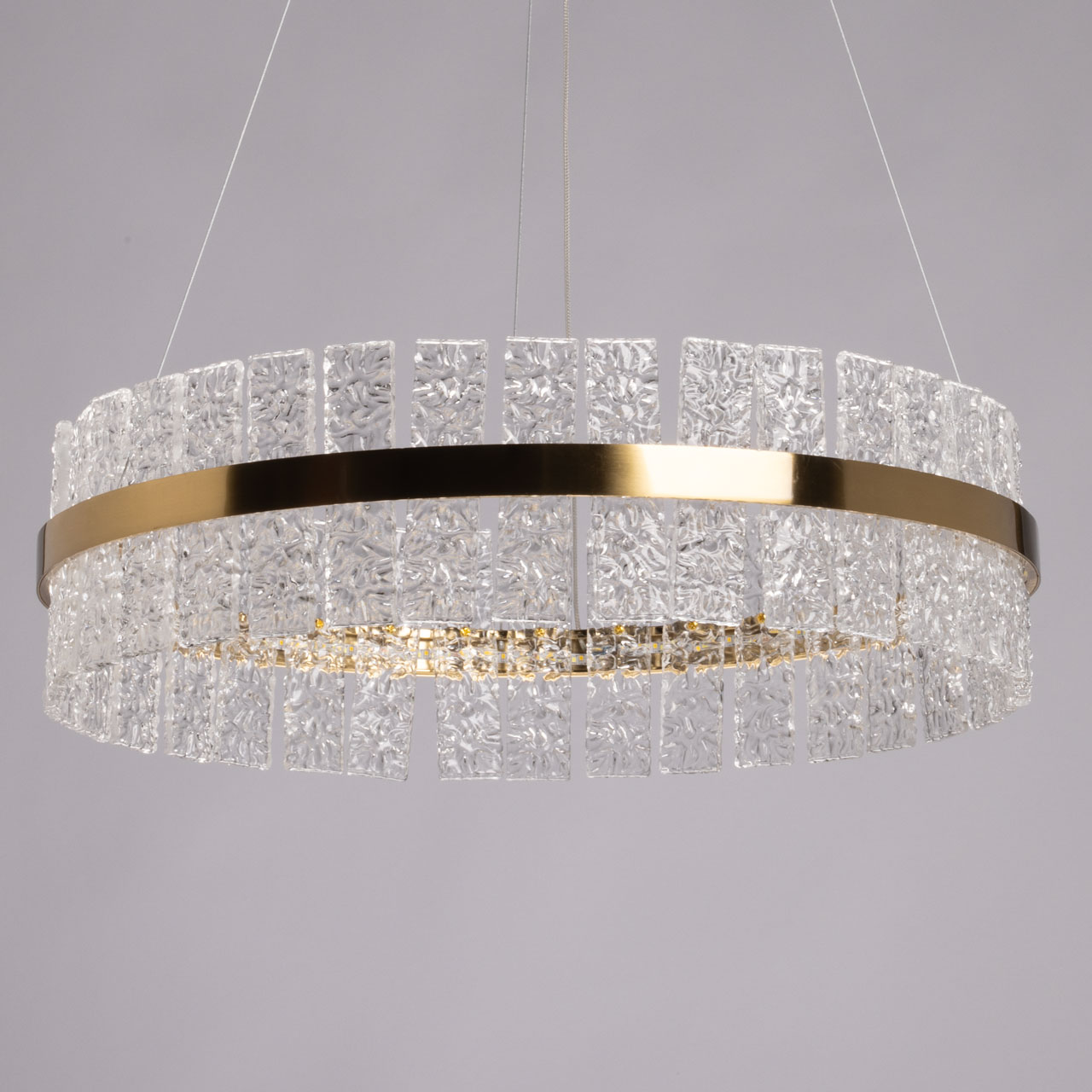 Металлическое основание светильника гальванизировано в цвет латуни. Люстра декорирована пластинами из полупрозрачного фактурного стекла.