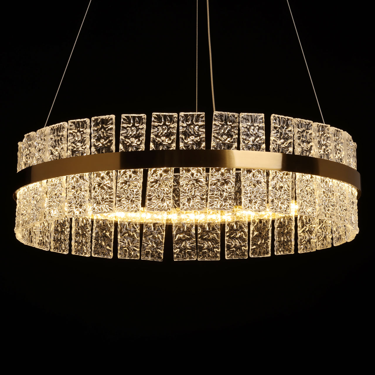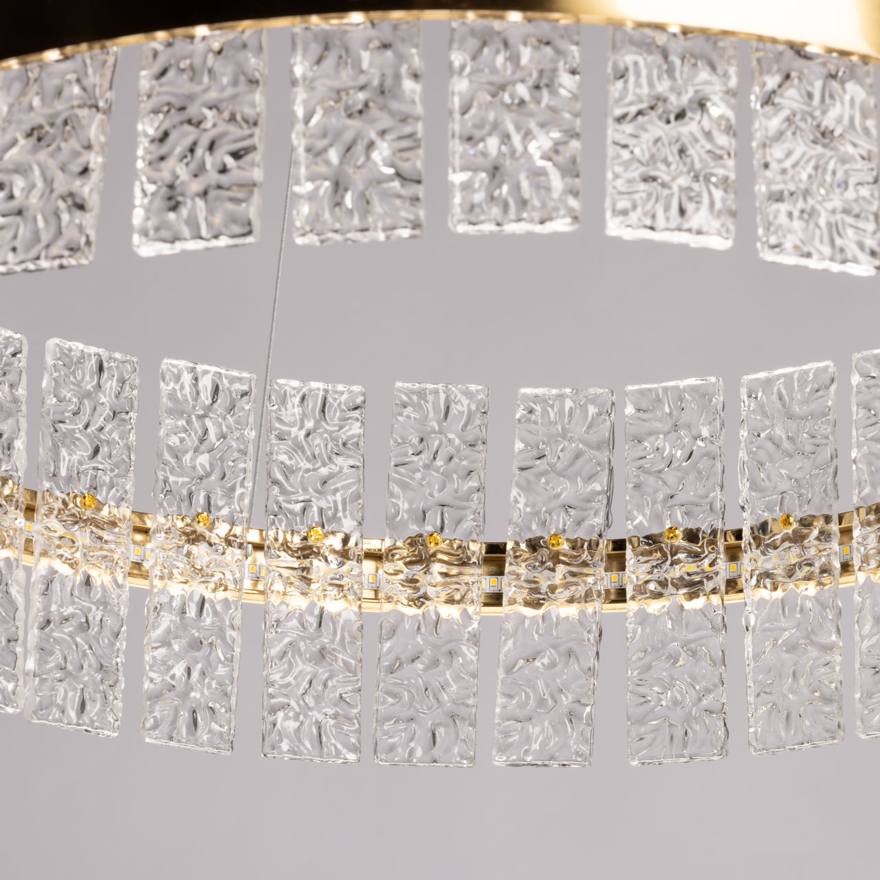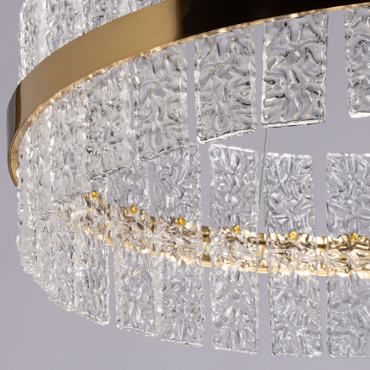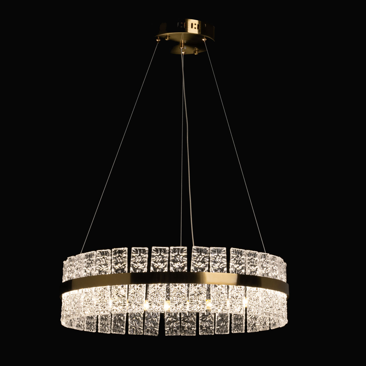 Металлическое основание светильника гальванизировано в цвет латуни. Люстра декорирована пластинами из полупрозрачного фактурного стекла.