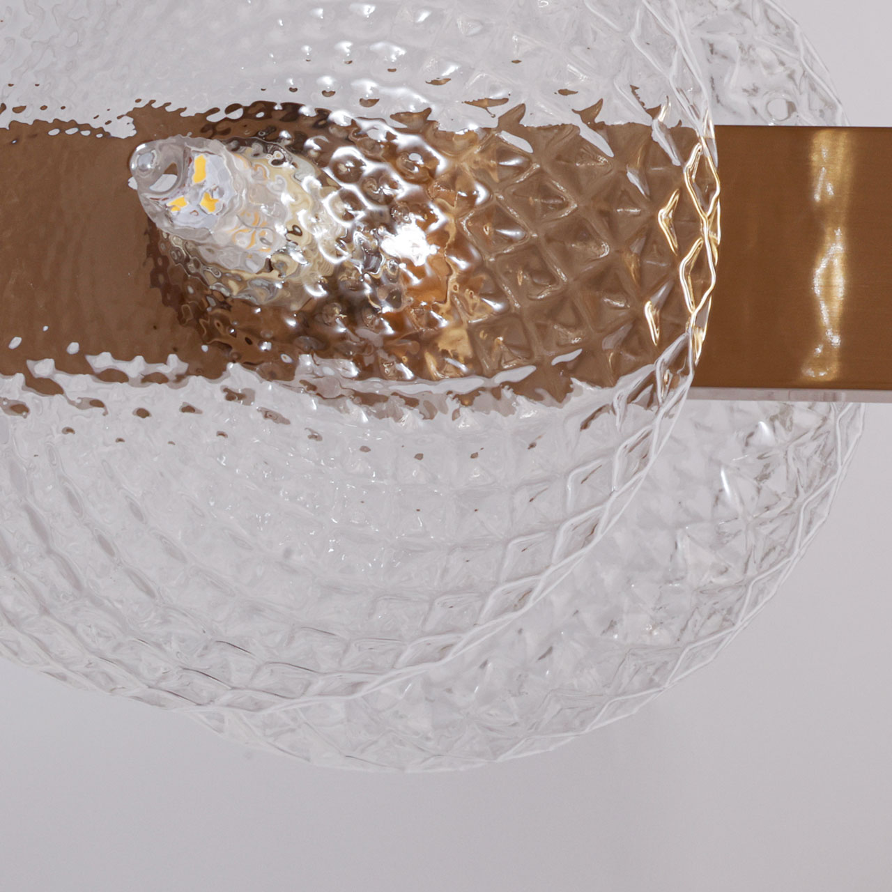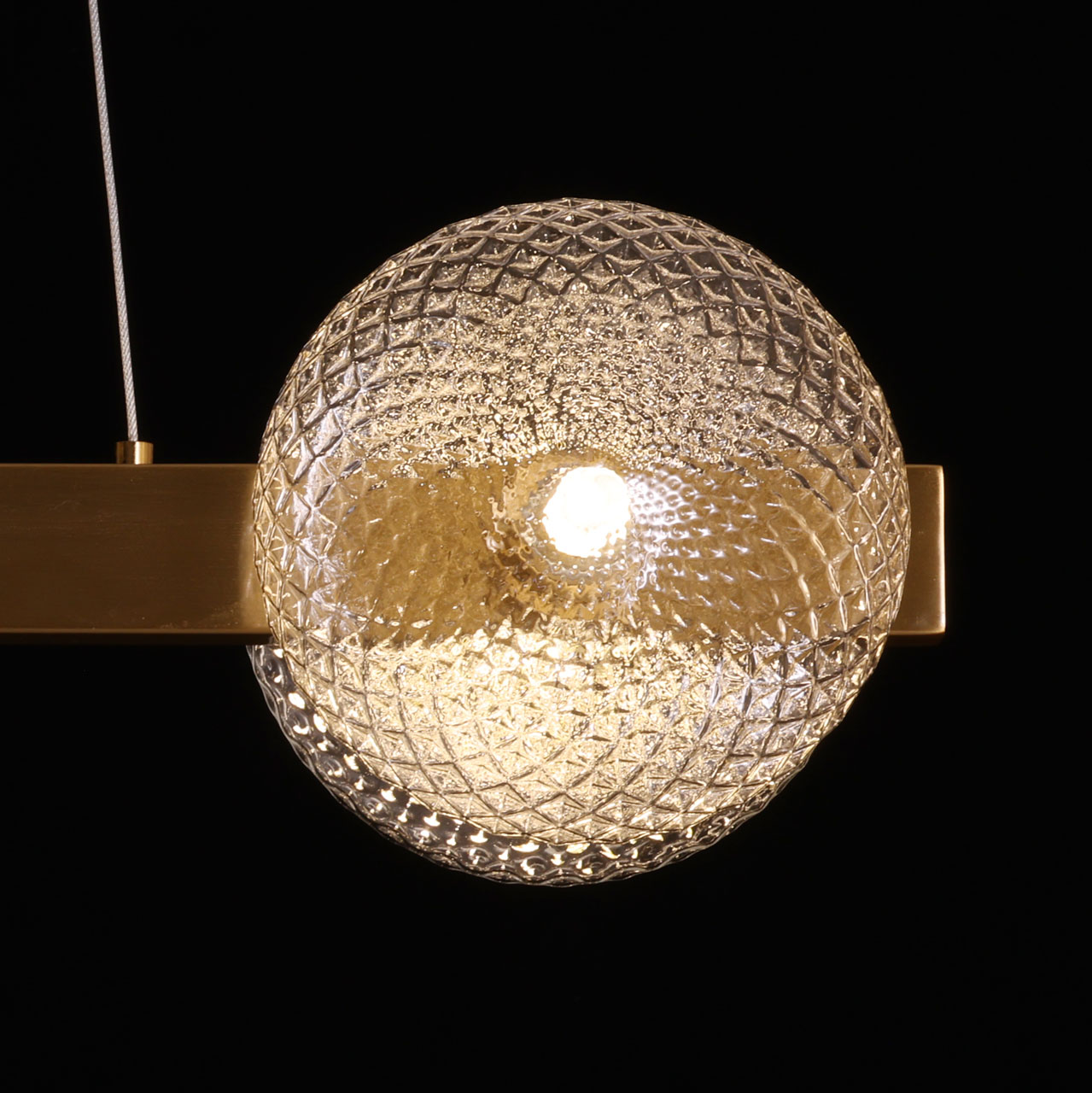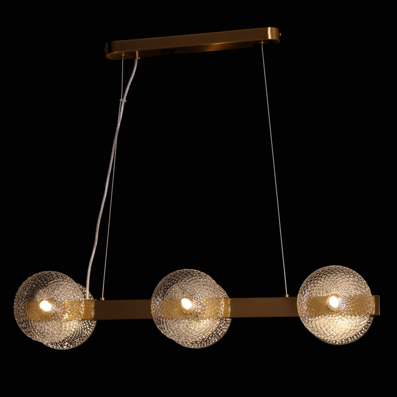 Металлическое основание подвесной люстры гальванизировано в цвет латуни. Светильник декорирован полусферами из прозрачного фактурного стекла.