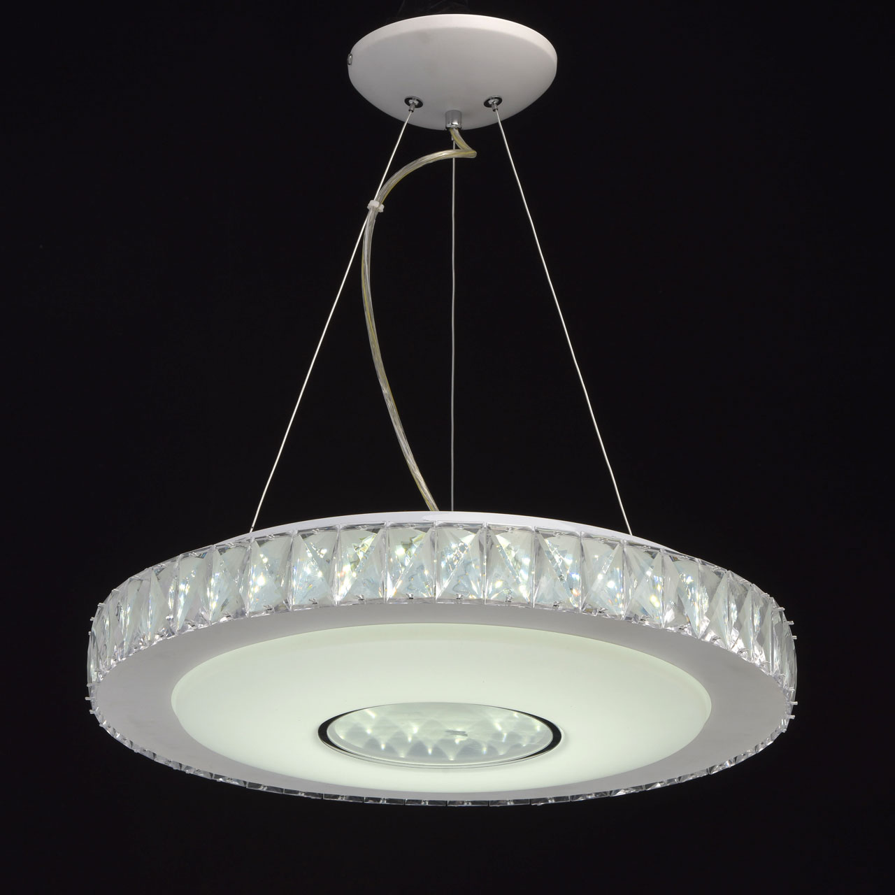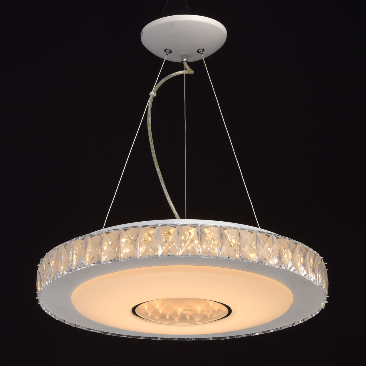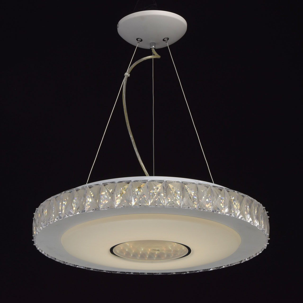 Основание: металл, окрашено в белый цвет. Потолочная чаша: металл, обработка на токарном станке. Плафон: из акрила белого цвета. Декор: хрусталь.