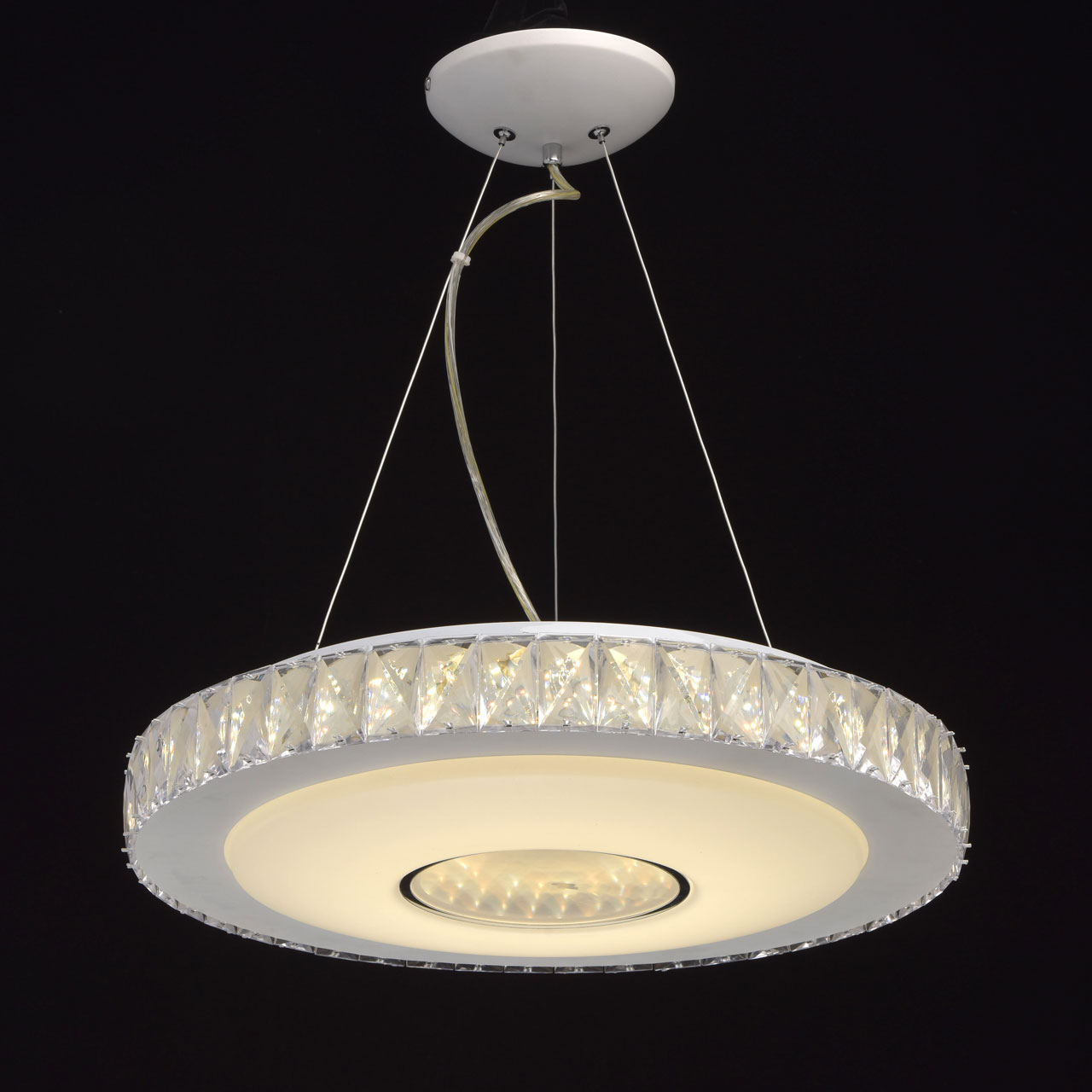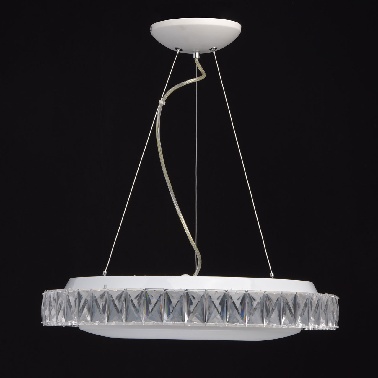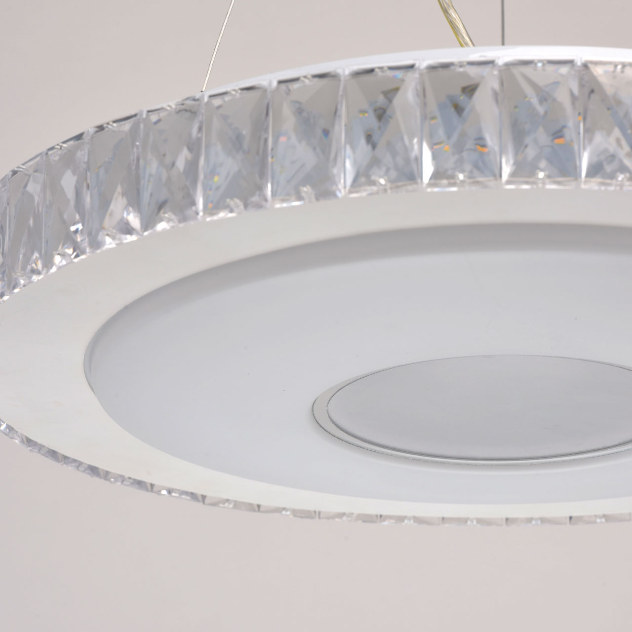 Основание: металл, окрашено в белый цвет. Потолочная чаша: металл, обработка на токарном станке. Плафон: из акрила белого цвета. Декор: хрусталь.