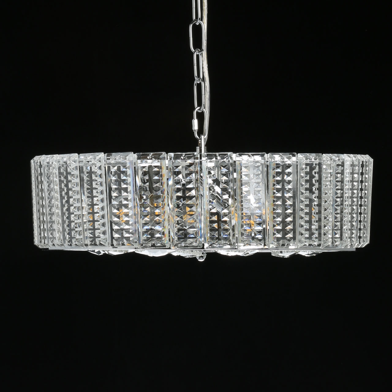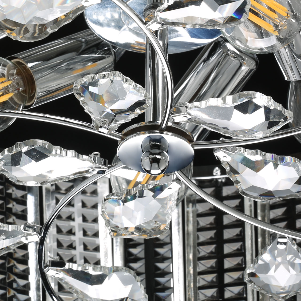 Металлическое основание светильника гальванизировано в цвет хрома. Светильник декорирован прозрачным фактурным стеклом и хрустальными элементами в форме дубового листа.