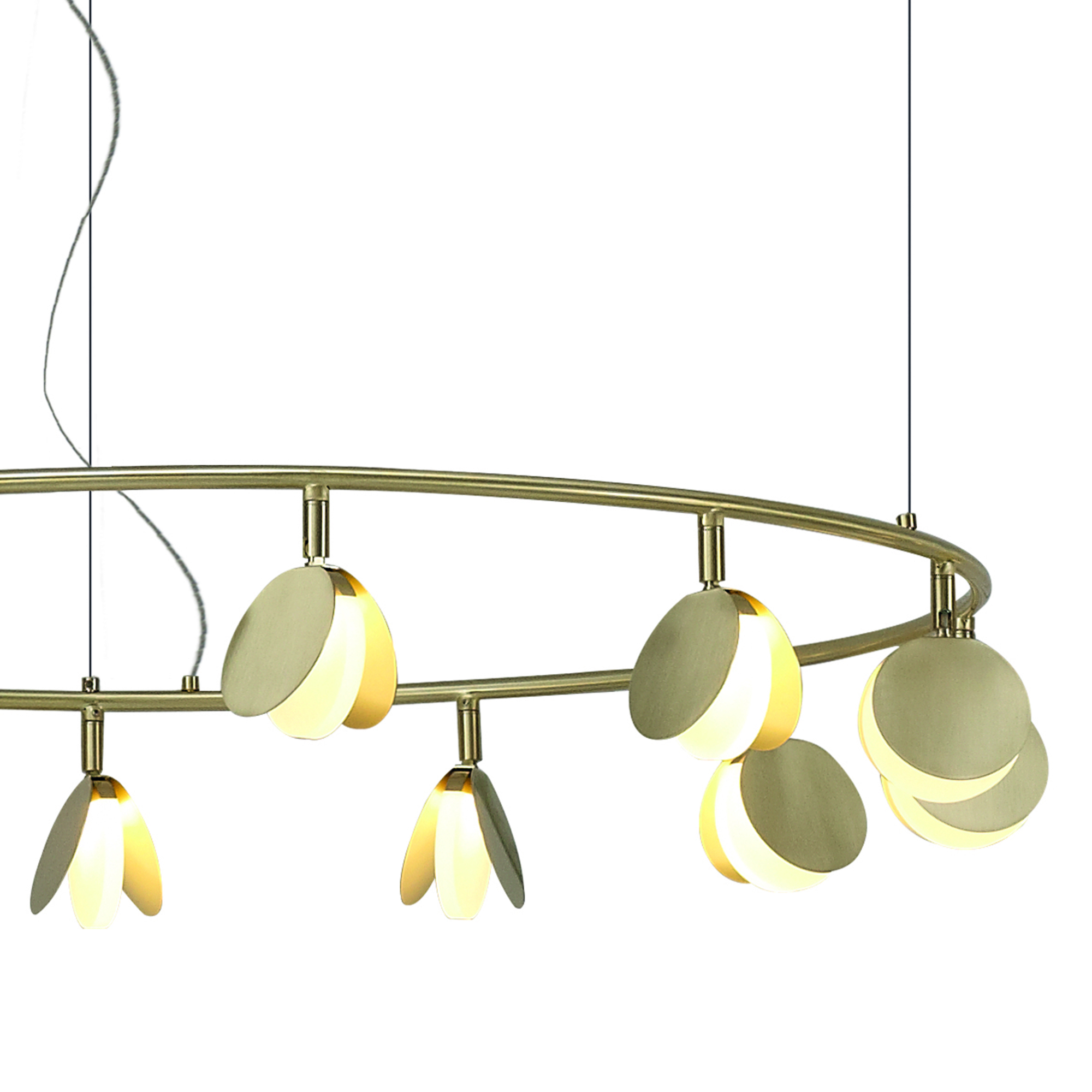 SHELL является крайне изящной коллекцией. Она несет в себе образы вдохновения дизайнера, напоминая форму раскрывающихся ракушек или порхание стаи мотыльков. Тонкие золотые пластины распахнулись, чтобы выпустить мягкий светодиодный свет из основания формы. Множество маленьких ракушек закреплено на широком обруче. Он словно парит в воздухе, благодаря едва заметной системе подвески.