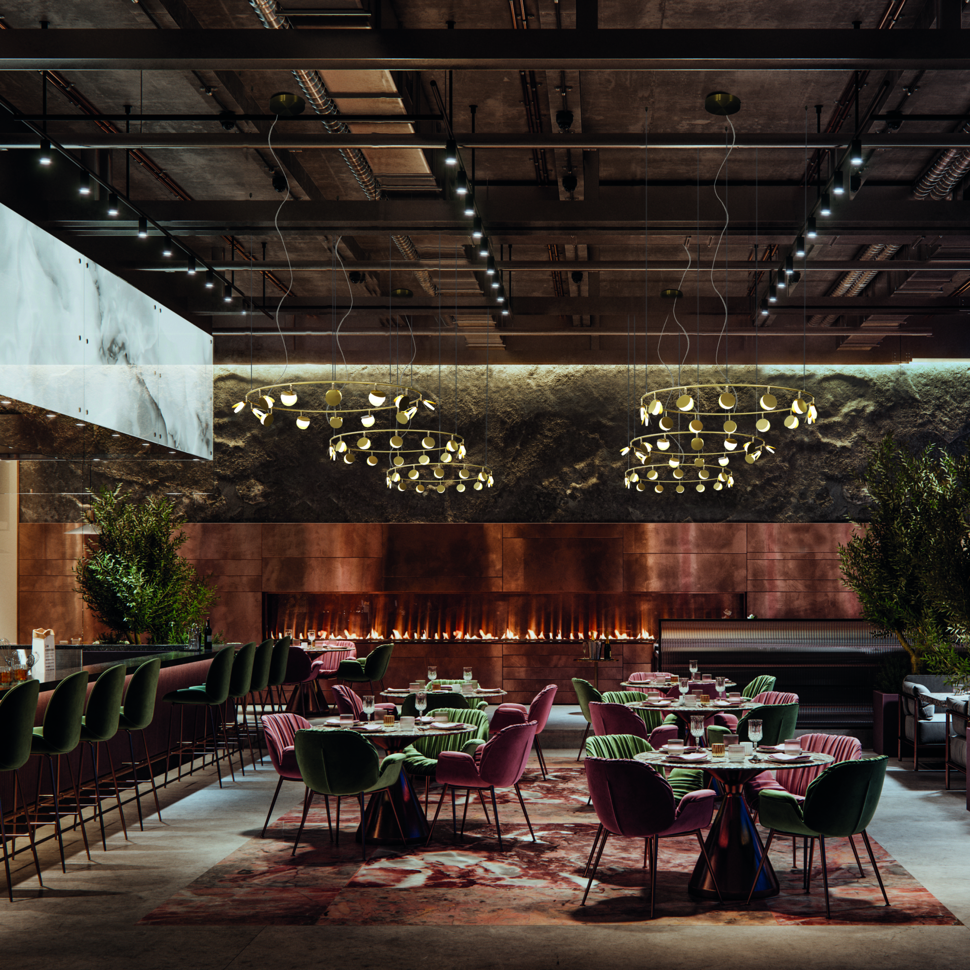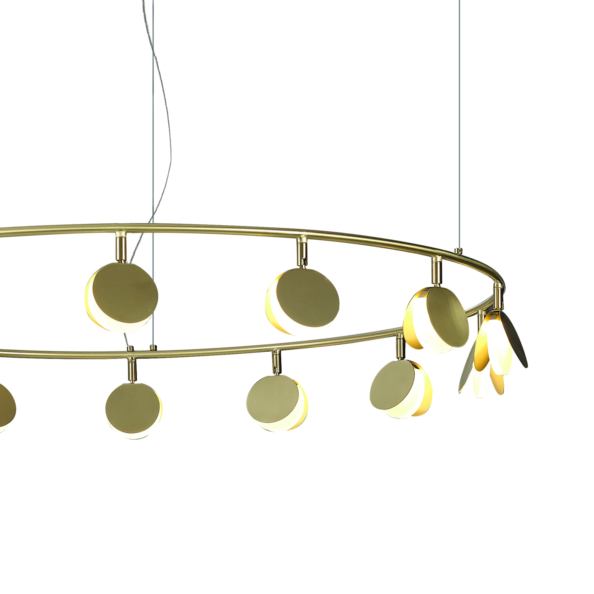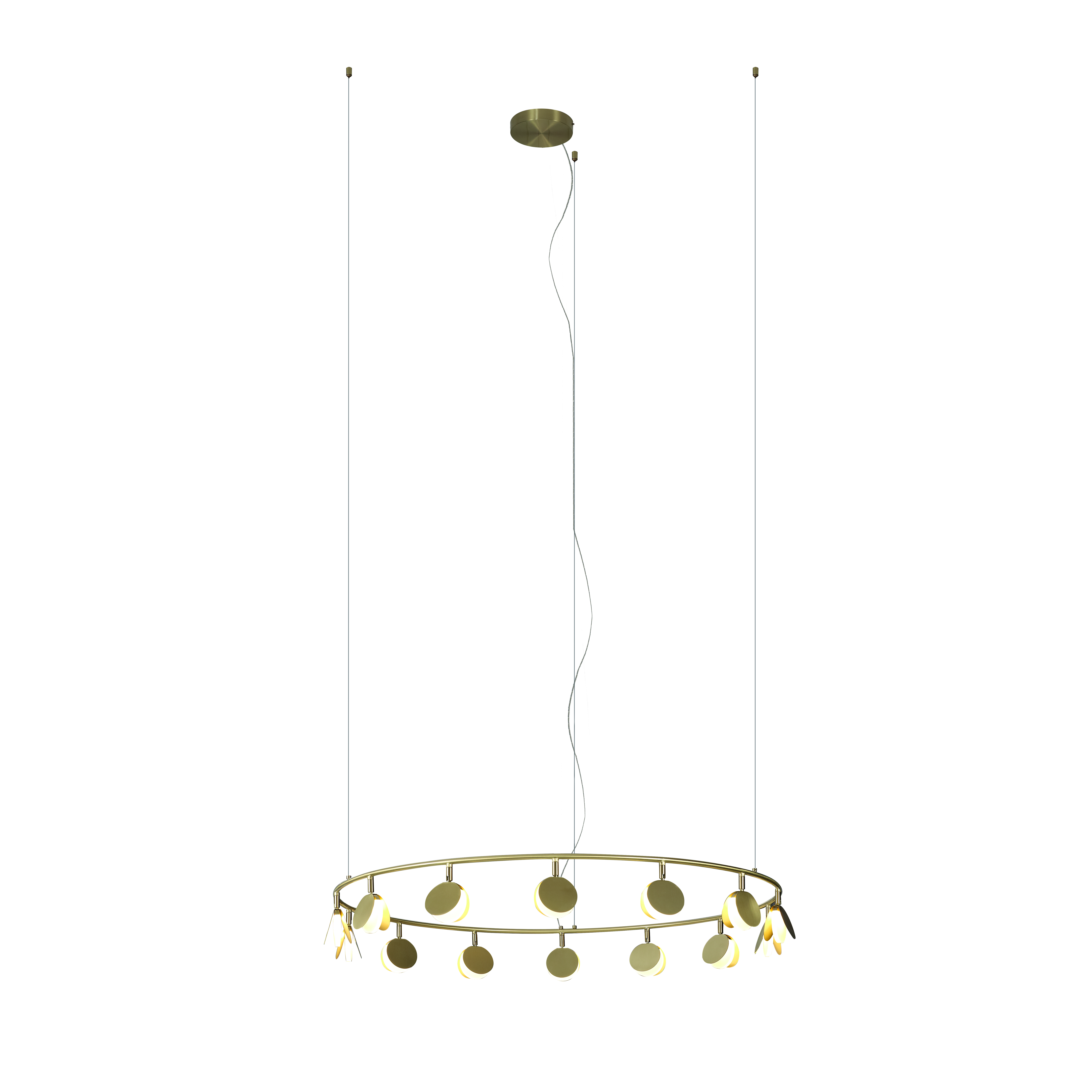Коллекция выполнена в золотой отделке и доступна в нескольких размерах. Разные системы подвесок позволяют адаптировать светильник под задачи вашего интерьера. Самая большая трехъярусная композиция коллекции представляет собой три кольца разного диаметра с разным количеством светодиодов на каждом ярусе.