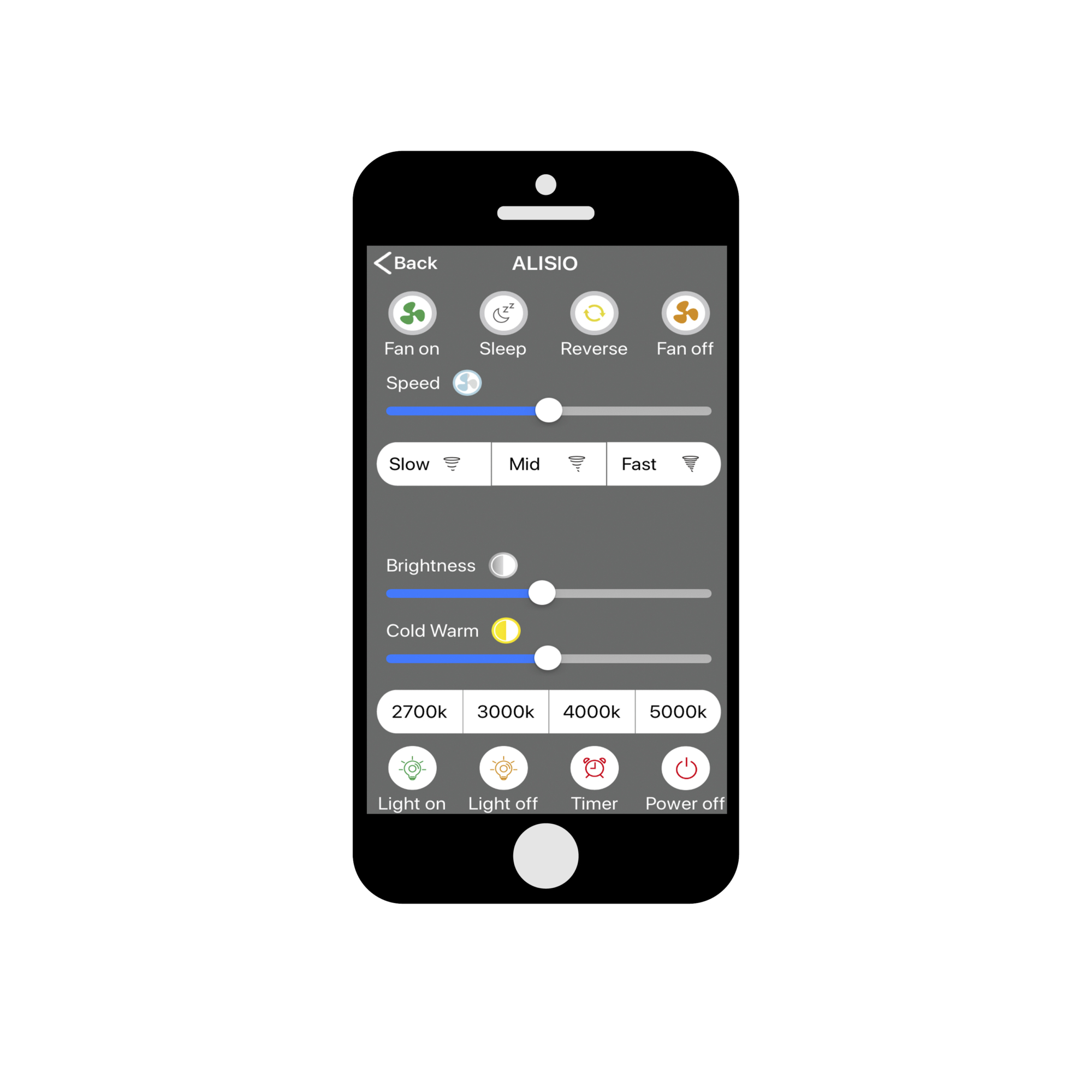 Вентилятором и встроенными светодиодами можно управлять с помощью пульта дистанционного управления, который входит в комплект или с помощью мобильного приложения. Металлический каркас представлен в белой и