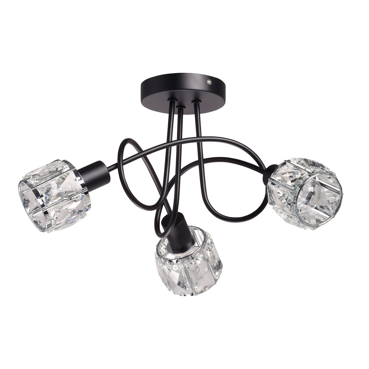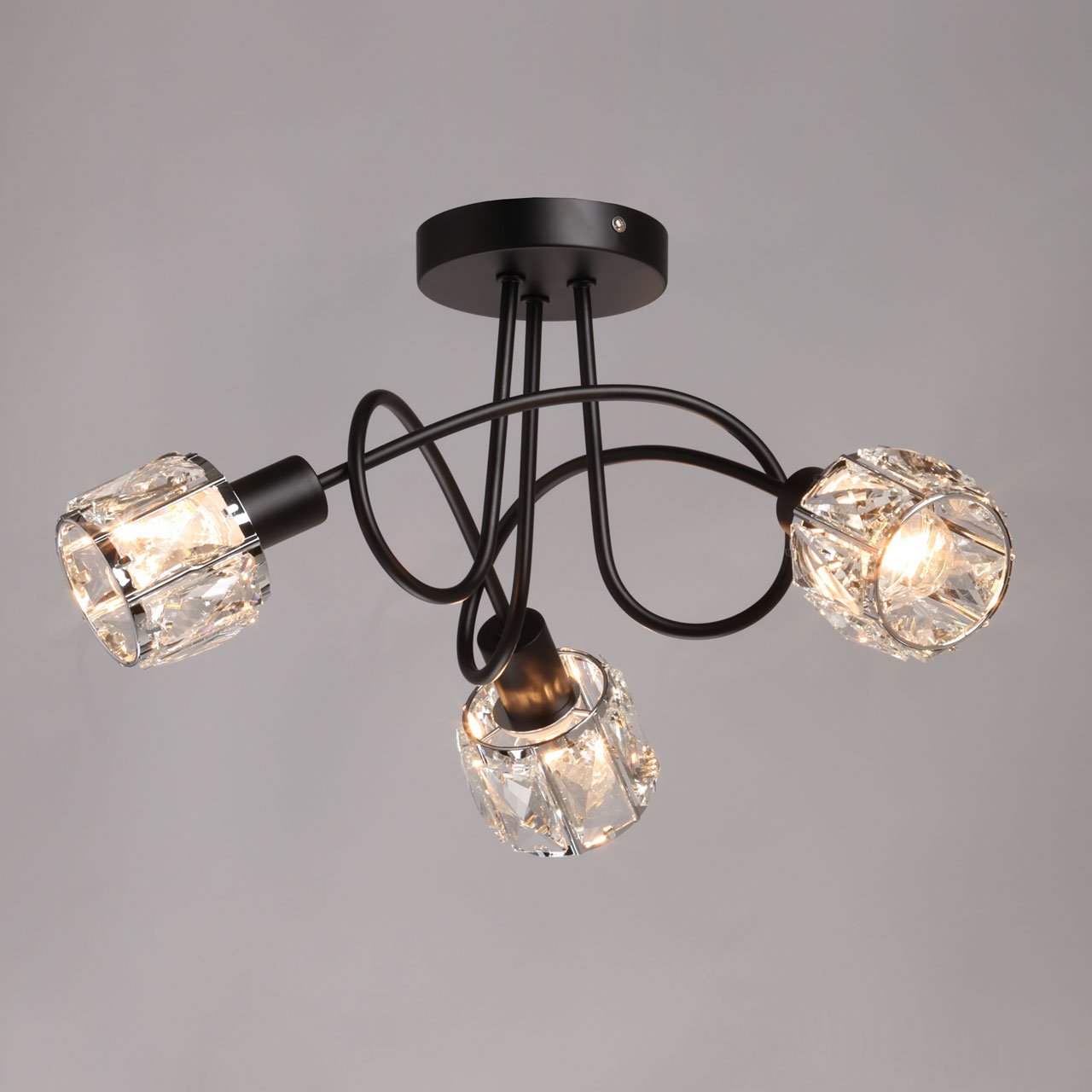 Металлическое основание потолочной люстры окрашено в черный цвет. Плафоны декорированы прозрачным хрусталем прямоугольной формы.