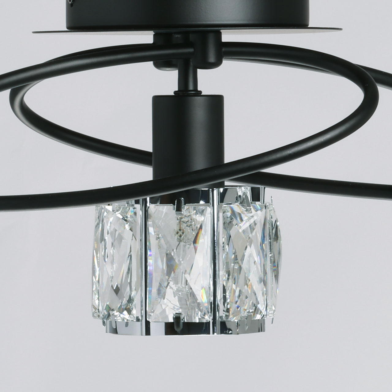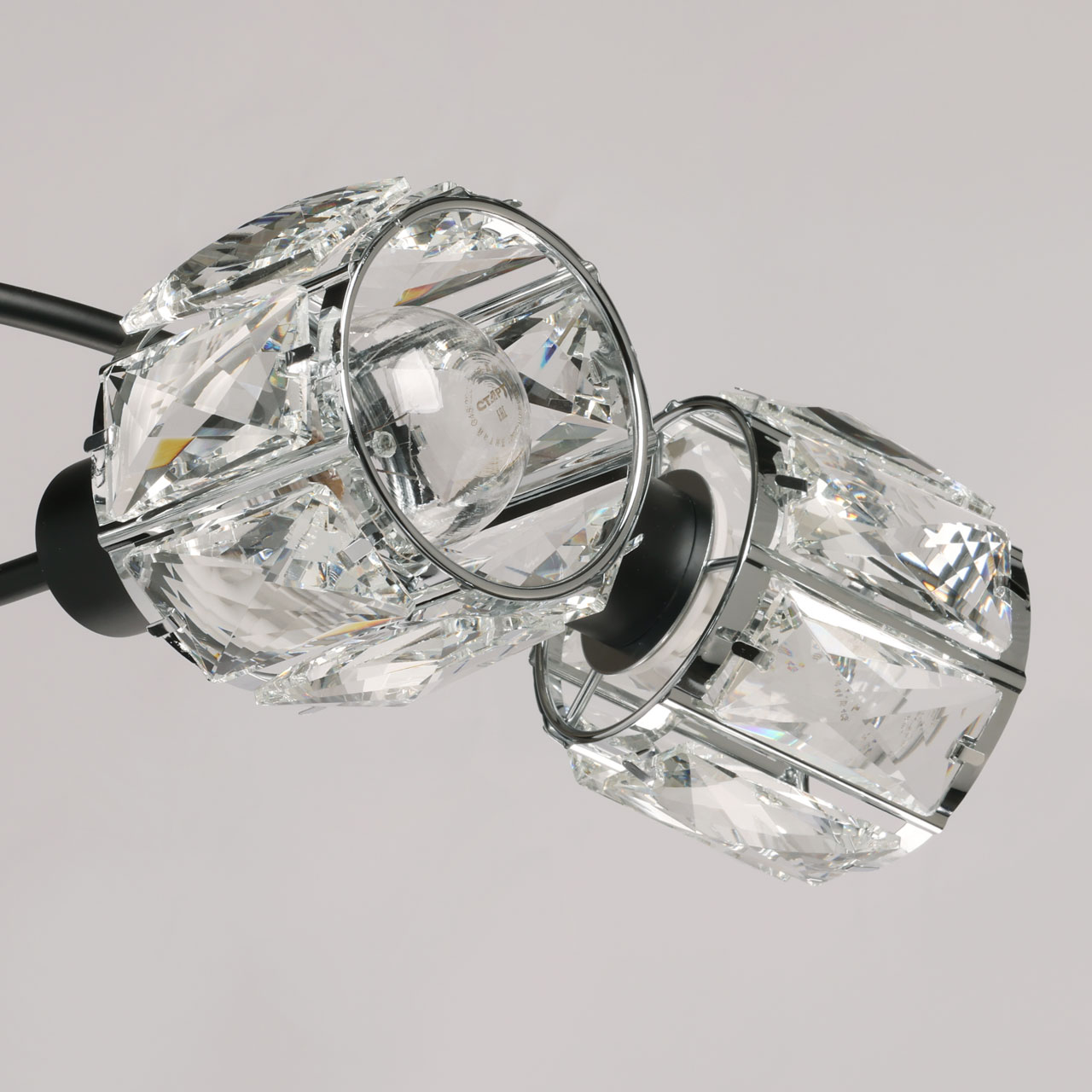 Металлическое основание потолочной люстры окрашено в черный цвет. Плафоны декорированы прозрачным хрусталем прямоугольной формы.