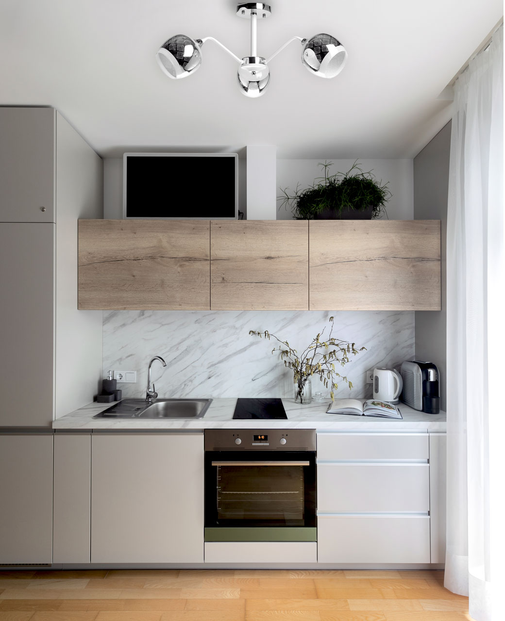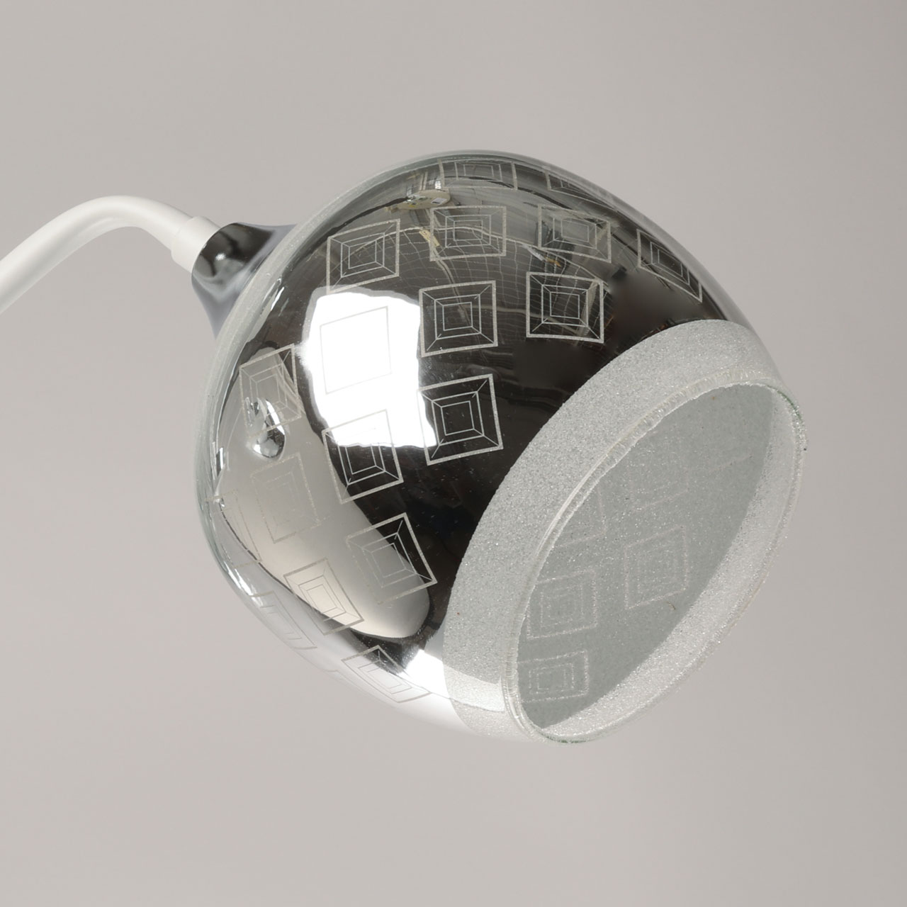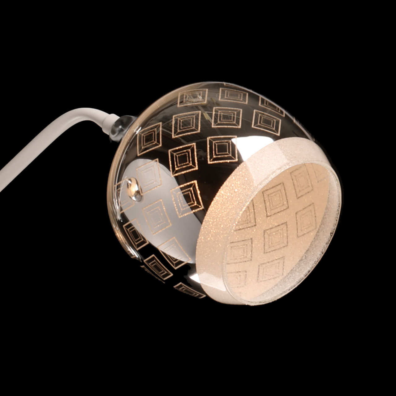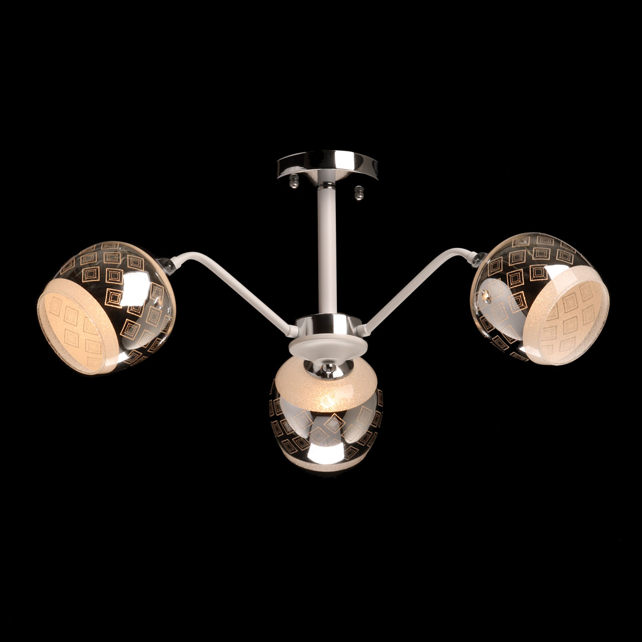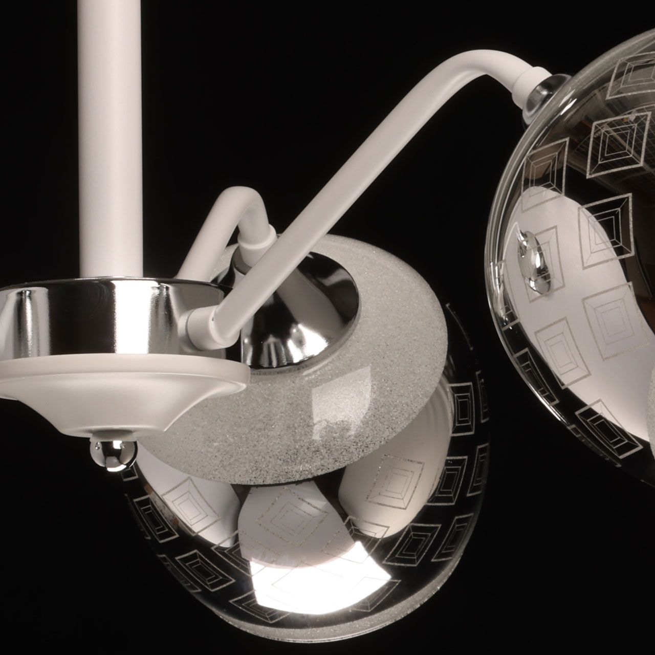 Металлическое основание потолочной люстры окрашено в белый цвет. Отдельные элементы основания гальванизированы в цвет хрома. Выдувные вручную стеклянные плафоны гальванизированы в дымчатый цвет и окрашены в белый цвет по трафарету. Край плафонов оплавлен. С внутренней стороны плафоны декорированы белой стеклянной крошкой.