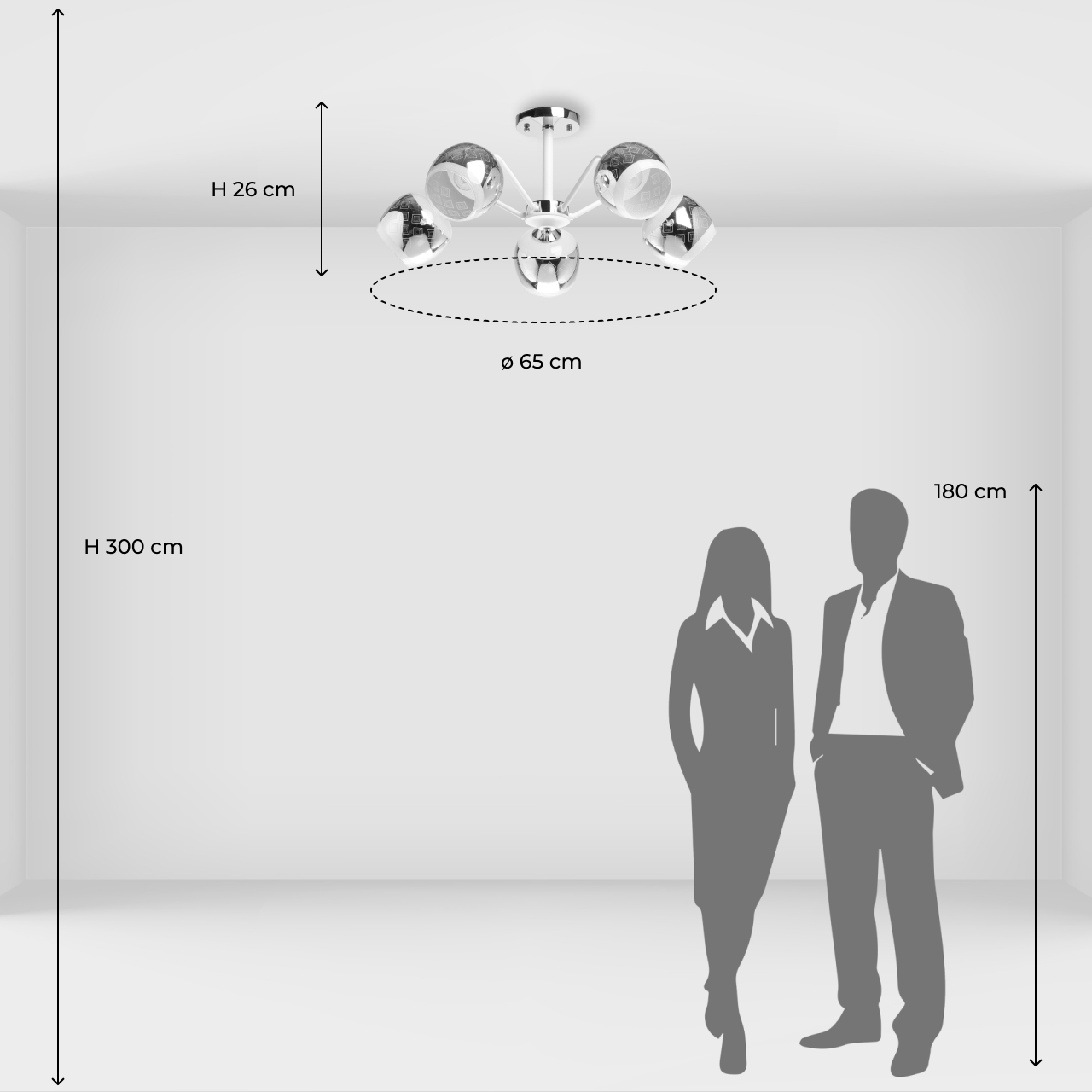 Металлическое основание потолочной люстры окрашено в белый цвет. Отдельные элементы основания гальванизированы в цвет хрома. Выдувные вручную стеклянные плафоны гальванизированы в дымчатый цвет и окрашены в белый цвет по трафарету. Край плафонов оплавлен. С внутренней стороны плафоны декорированы белой стеклянной крошкой.