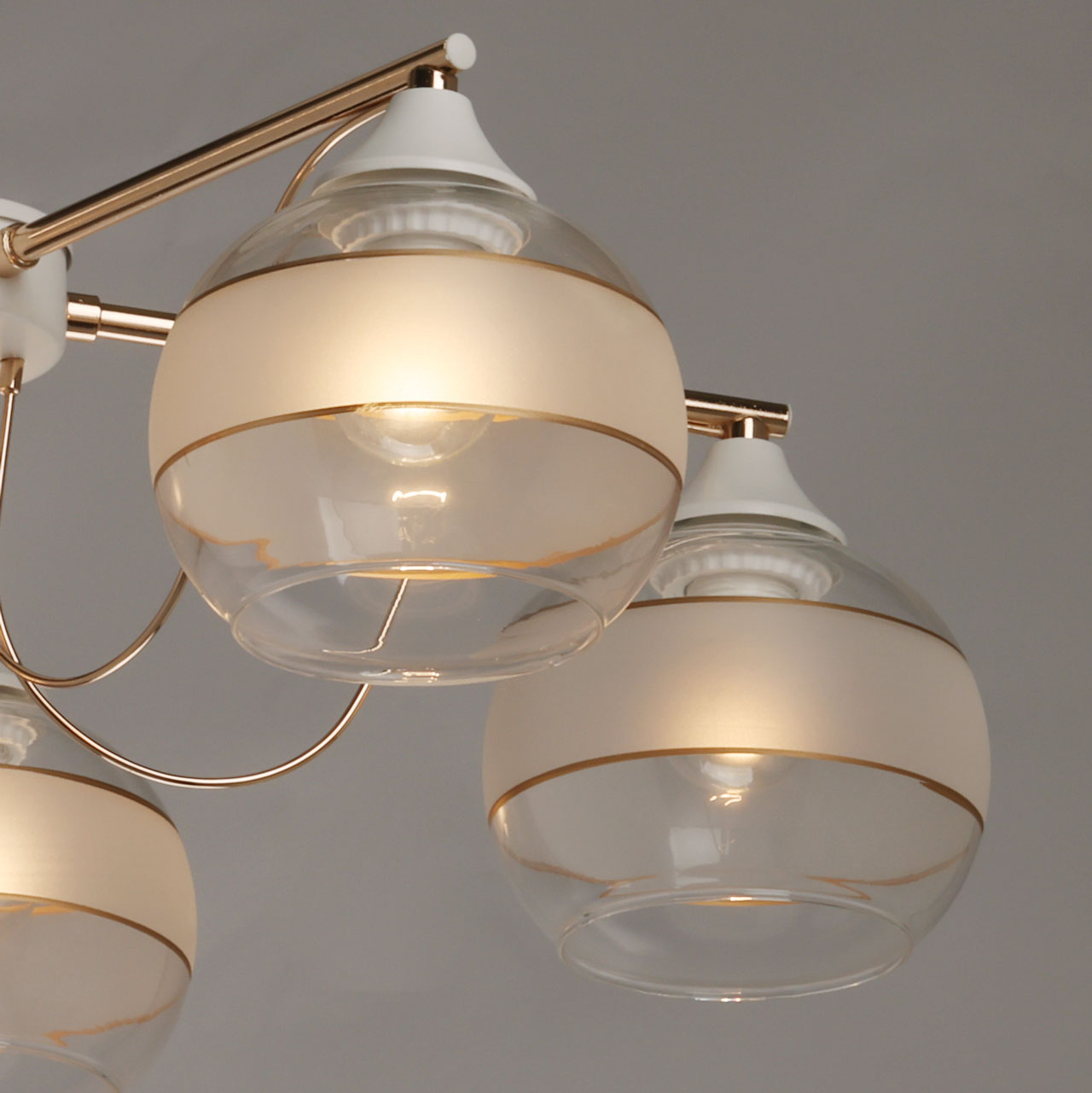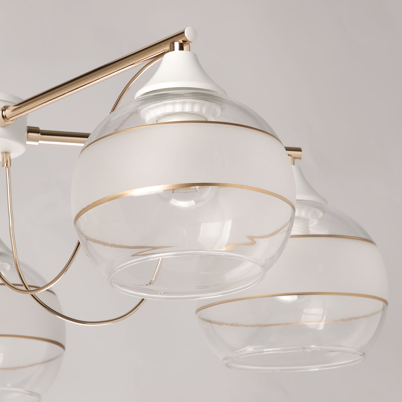 Металлическое основание потолочной люстры окрашено в белый цвет. Отдельные элементы основания гальванизированы в цвет золота. Выдувные вручную стеклянные плафоны матированы по трафарету. Матированная часть плафонов выделена золотым кантом.