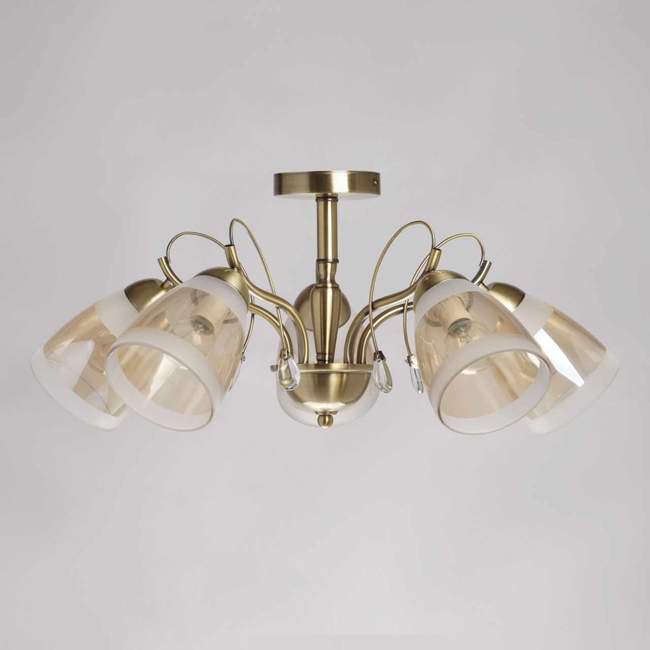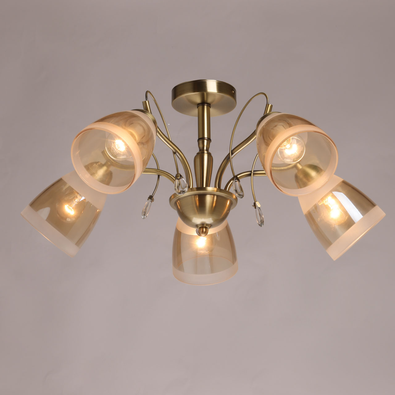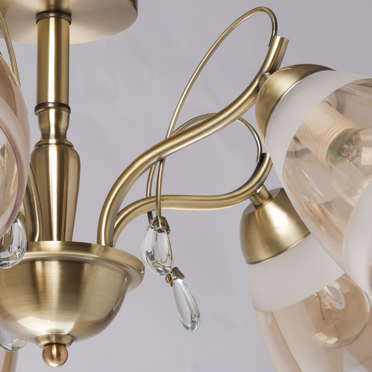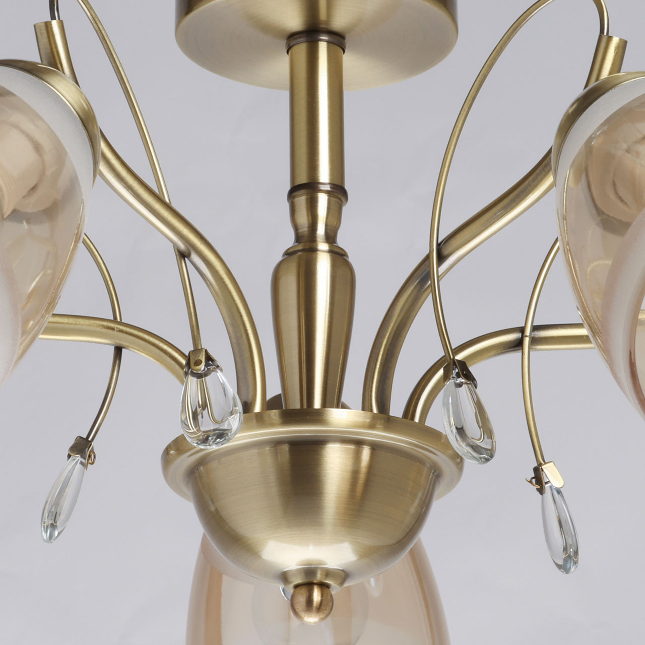Металлическое основание потолочной люстры гальванизировано в цвет античной бронзы. Стеклянные плафоны матированы по трафарету и гальванизированы в цвет шампань. Люстра декорирована подвесками из прозрачного хрустального стекла.