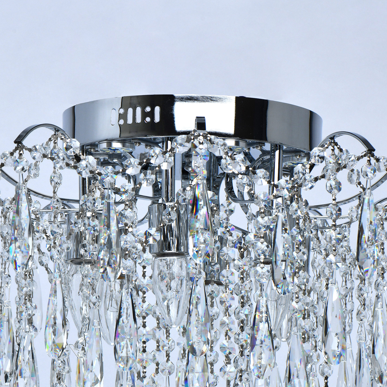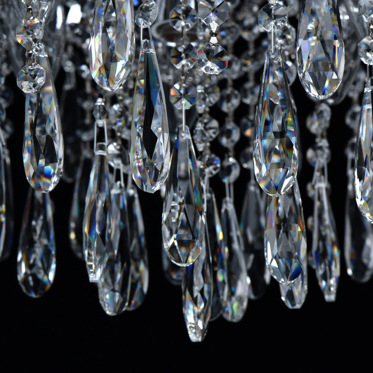 Основание светильника выполнено из металла и гальванизировано в цвет хрома. Светильник декорирован прозрачным хрусталем формы октагон и капля.