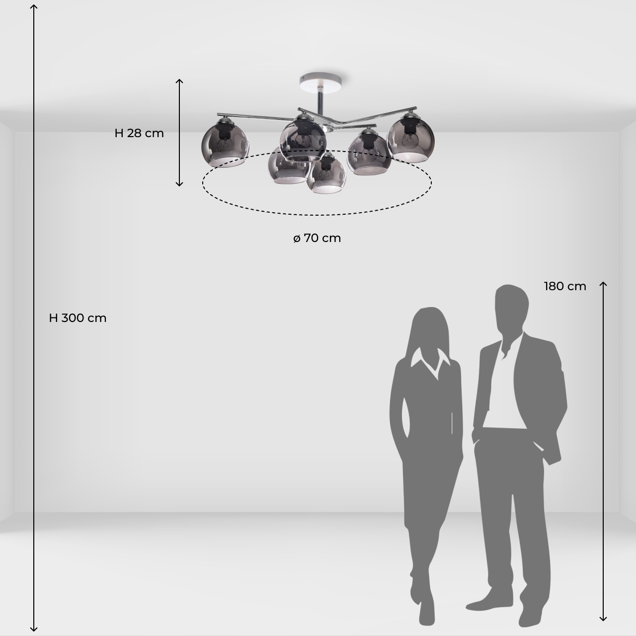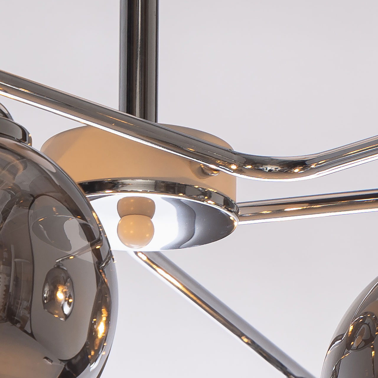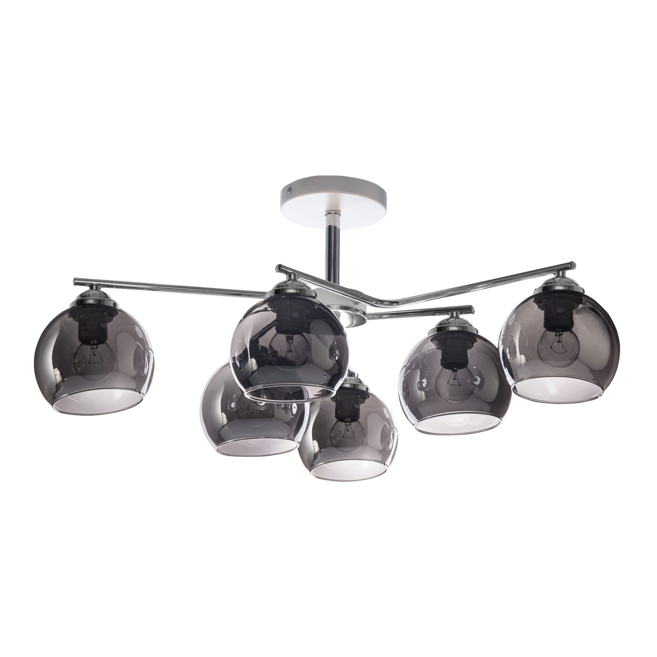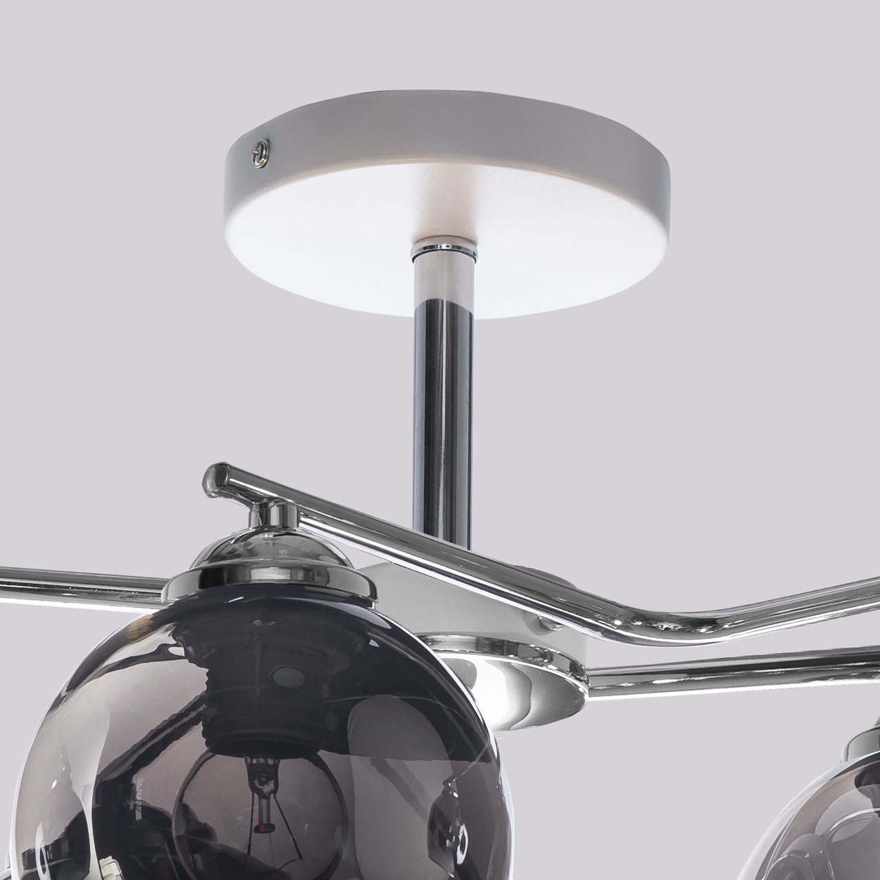 Металлическое основание светильника гальванизировано в цвет хрома. Отдельные элементы основания окрашены в белый цвет. Светильник декорирован стеклянными плафонами, гальванизированными в дымчатый цвет.