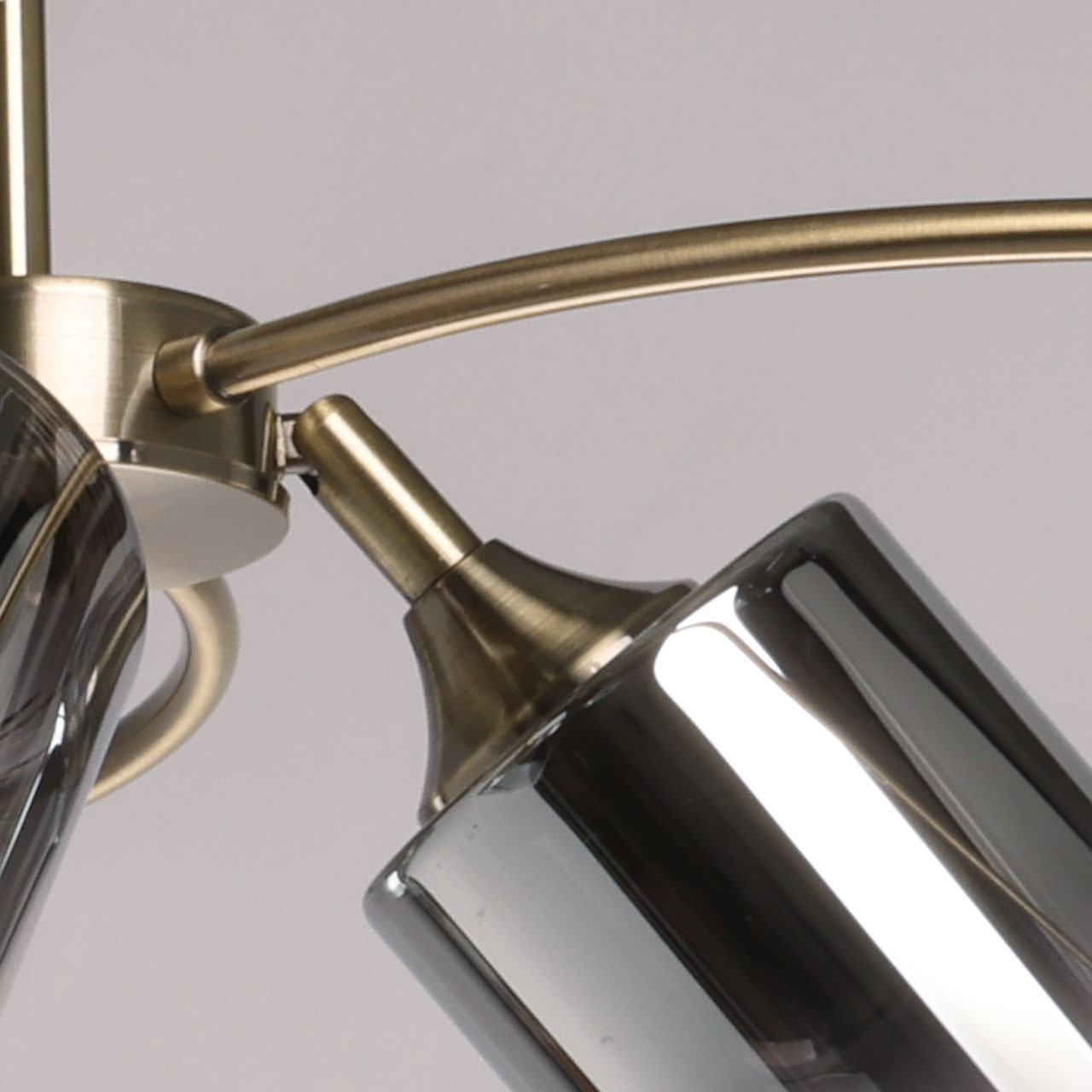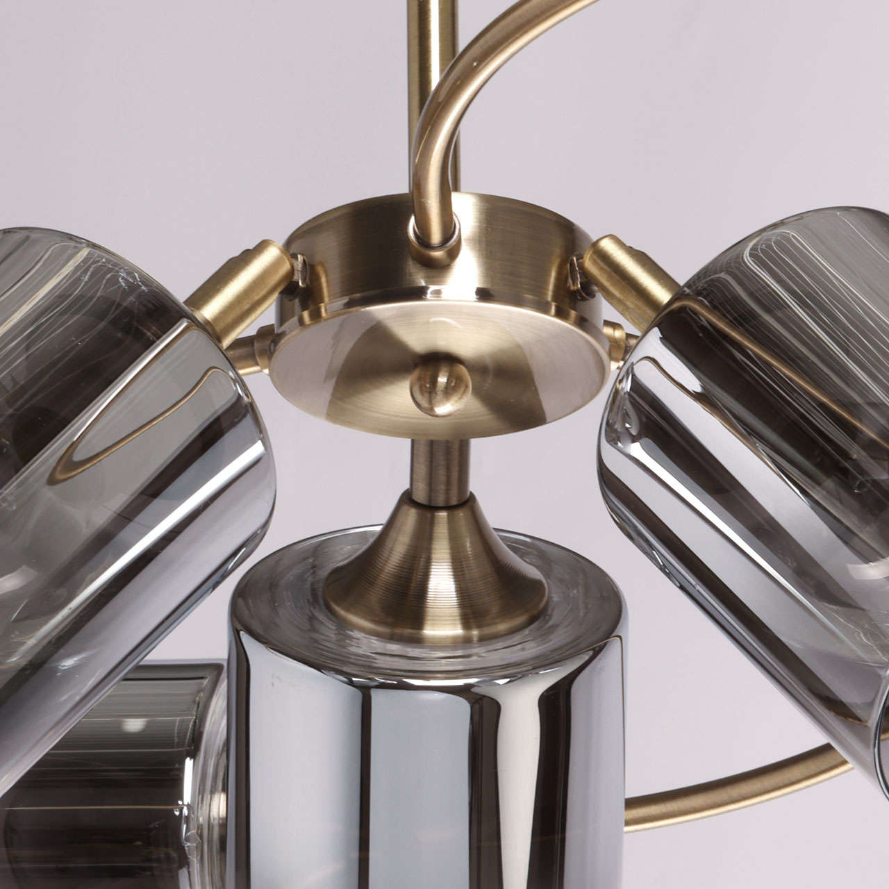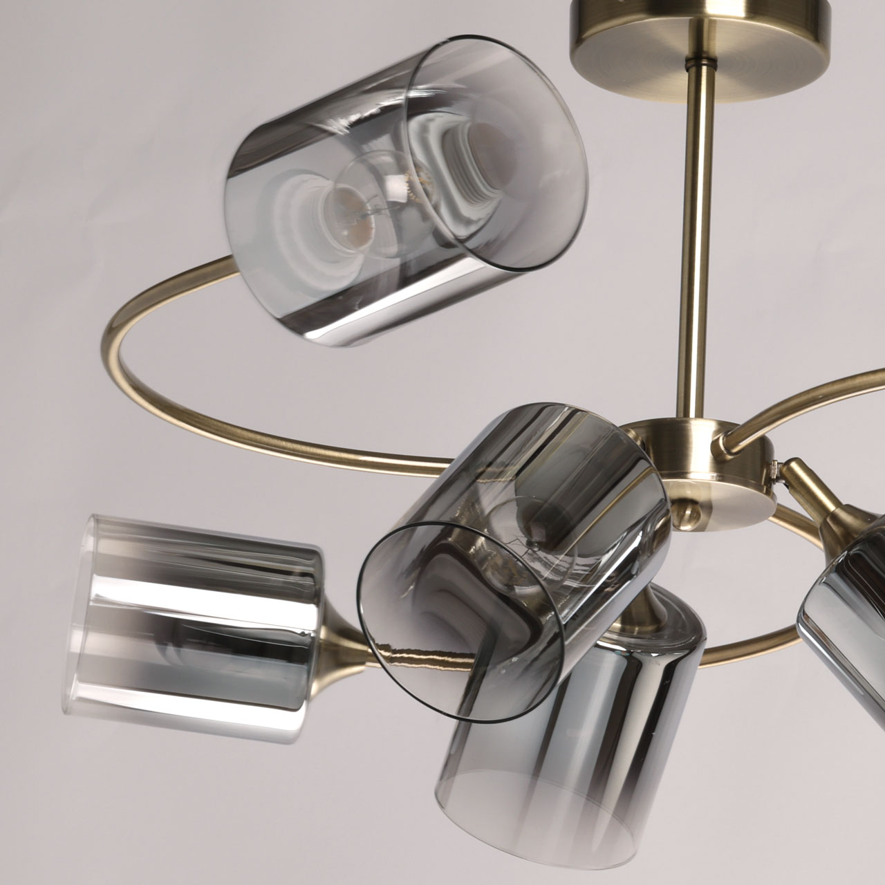 Металлическое основание потолочной люстры гальванизировано в цвет античной бронзы. Люстра декорирована стеклянными плафонами вытянутой формы, гальванизированными в дымчатый цвет.