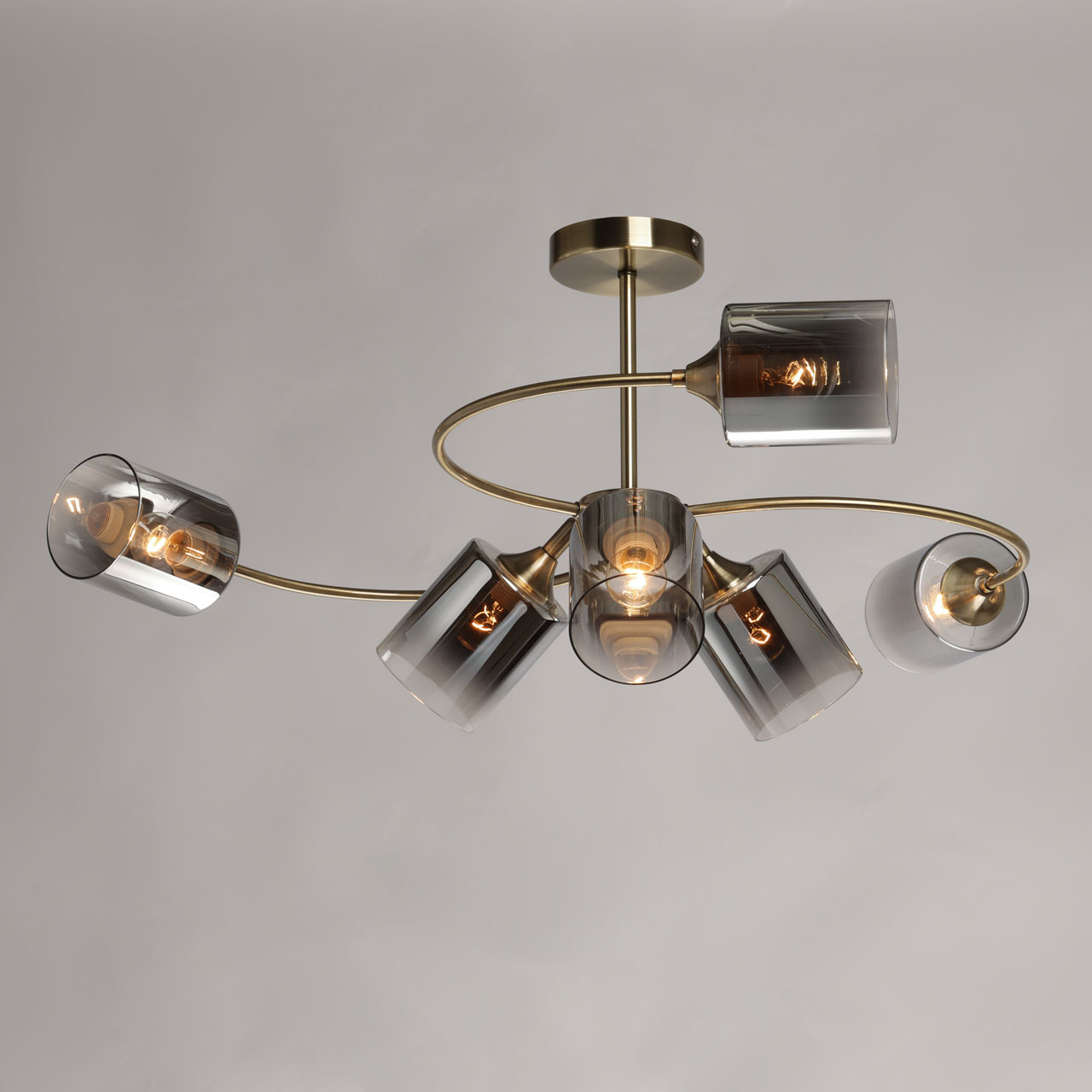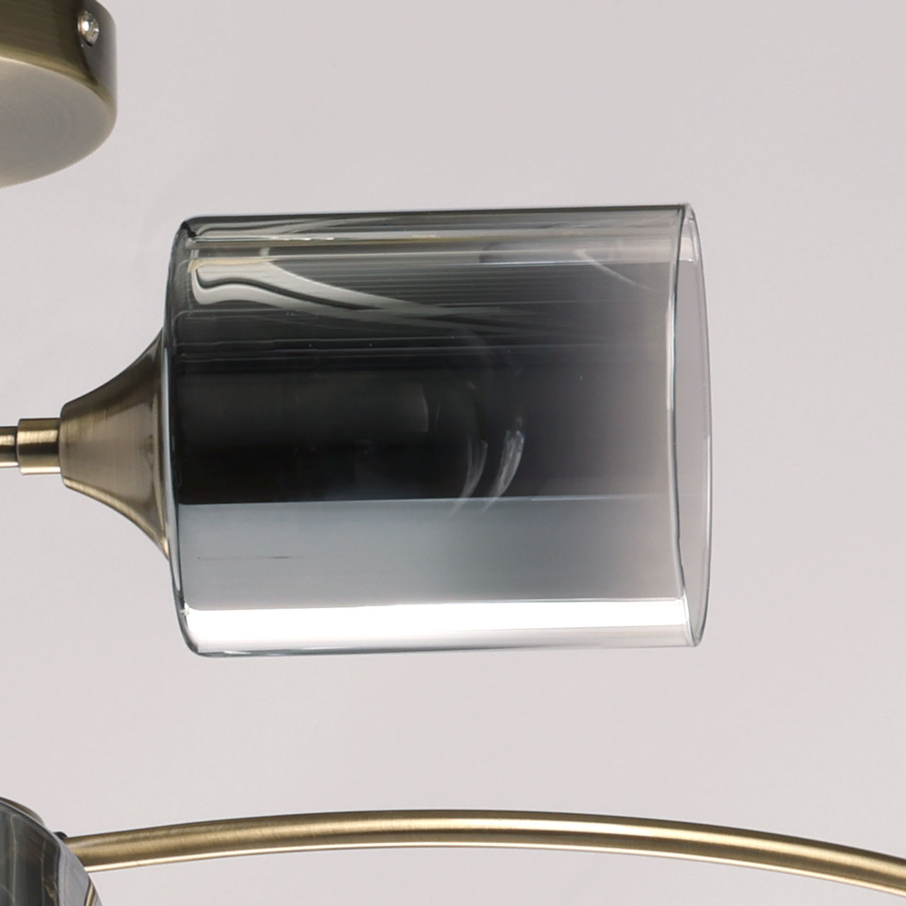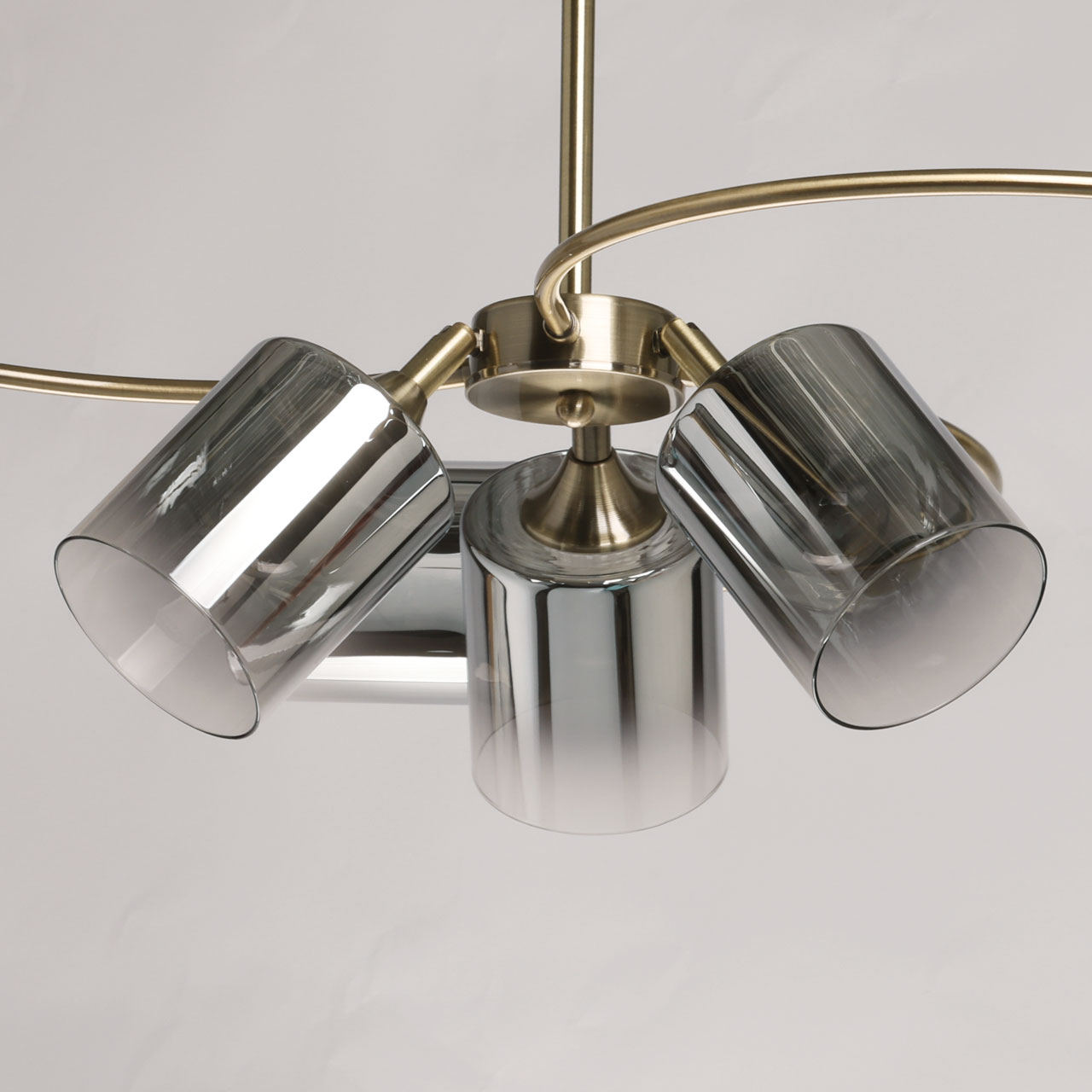 Металлическое основание потолочной люстры гальванизировано в цвет античной бронзы. Люстра декорирована стеклянными плафонами вытянутой формы, гальванизированными в дымчатый цвет.
