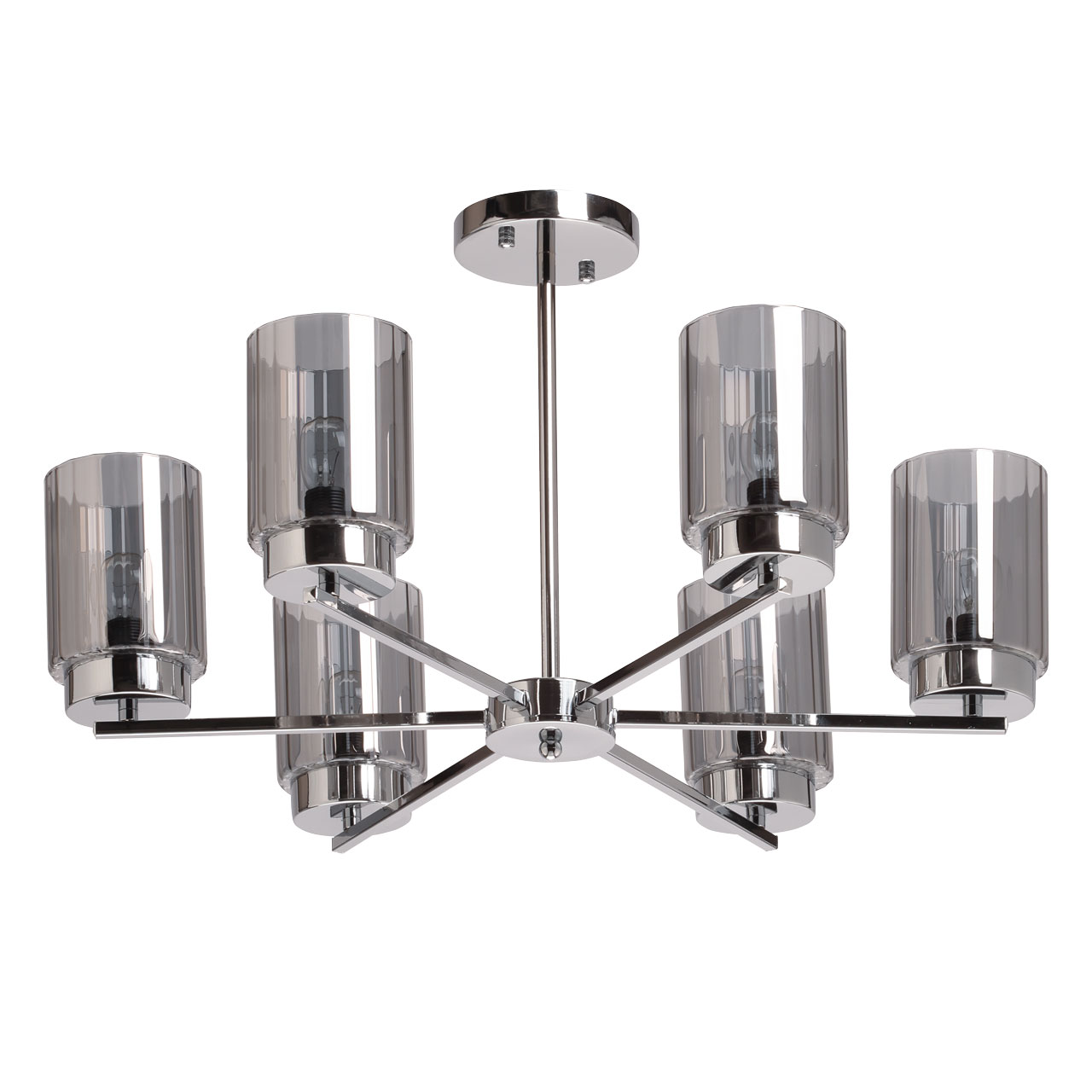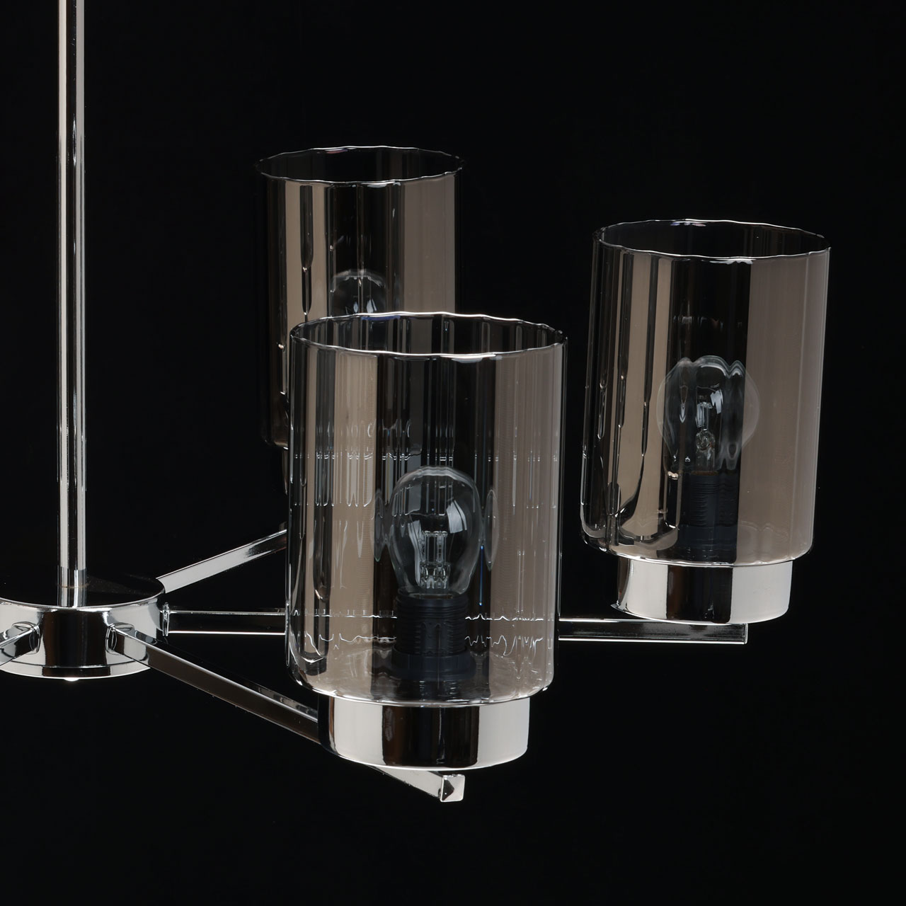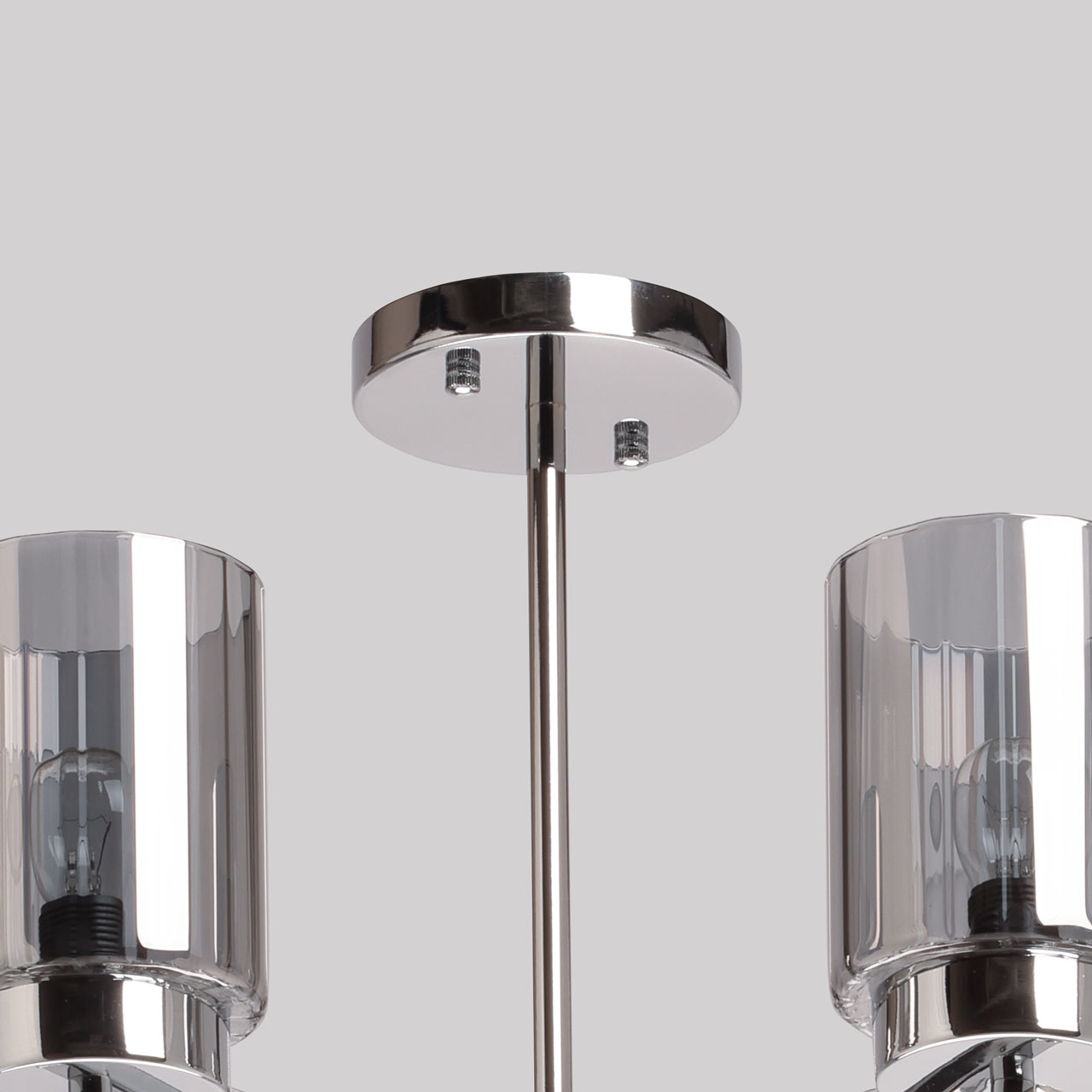 Металлическое основание потолочной люстры гальванизировано в цвет хрома. Стеклянные плафоны гальванизированы в дымчатый цвет.