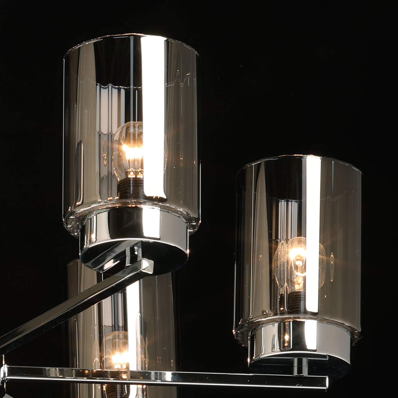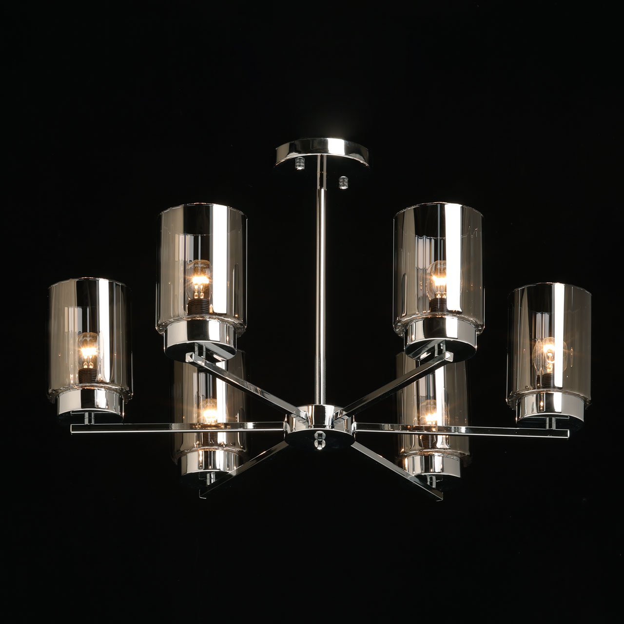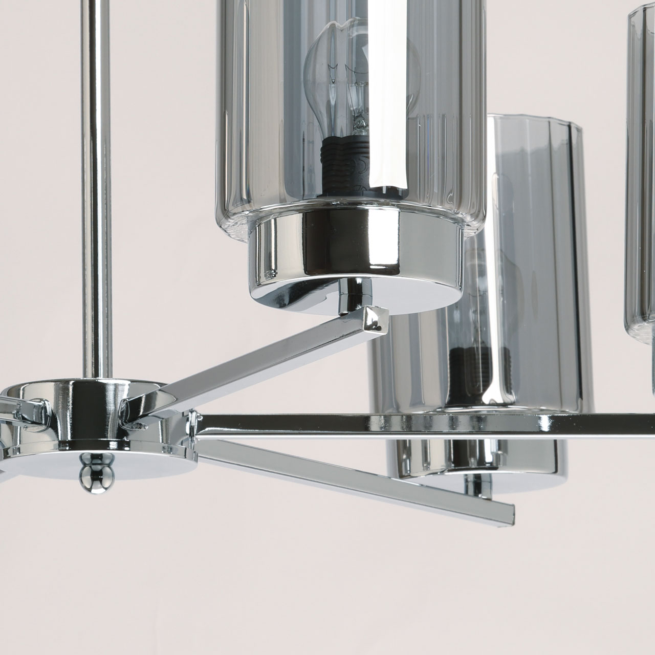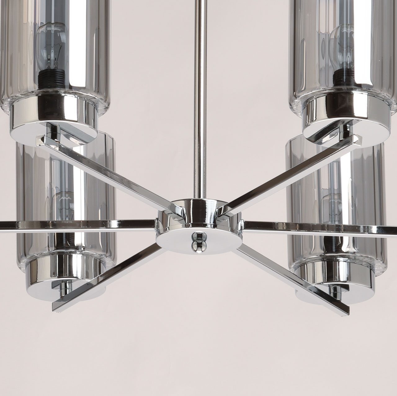 Металлическое основание потолочной люстры гальванизировано в цвет хрома. Стеклянные плафоны гальванизированы в дымчатый цвет.