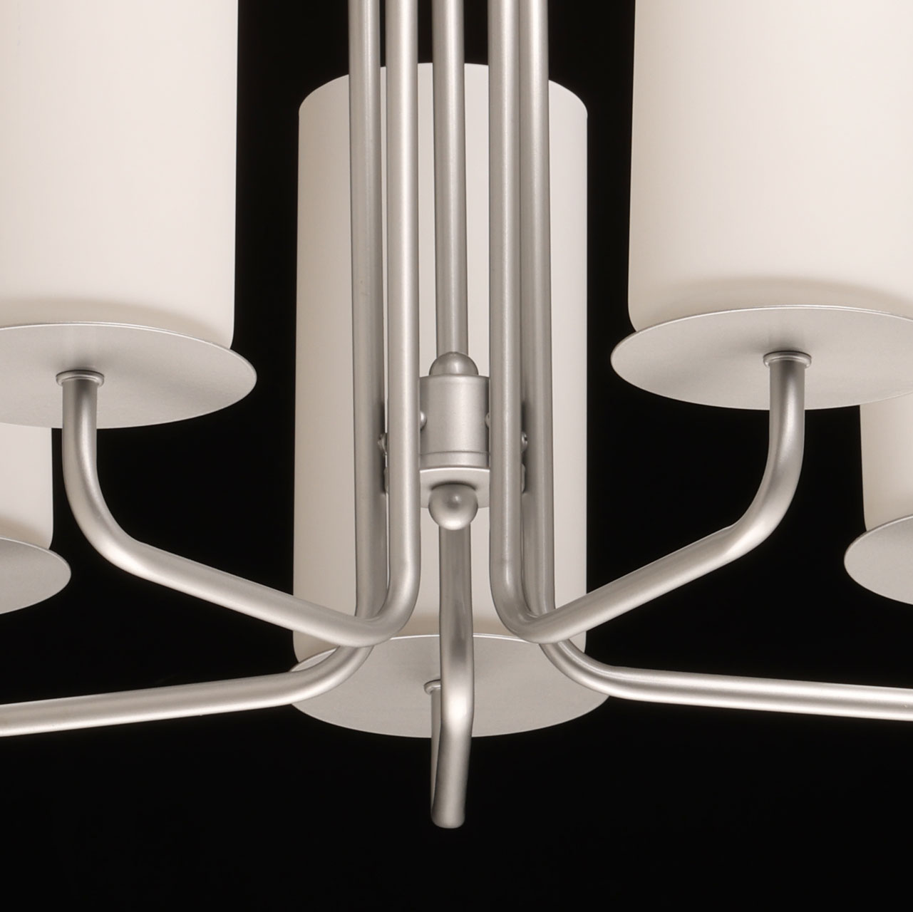 Металлическое основание люстры окрашено в цвет перламутрового серебра. Стеклянные плафоны окрашены в белый цвет.