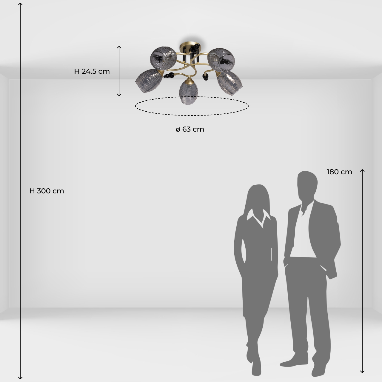 Металлическое основание потолочной люстры гальванизировано в цвет матового золота. Отдельные элементы основания окрашены в черный цвет. Стеклянные фактурные плафоны выдуваются в сложную форму вручную и гальванизированы в дымчатый цвет.