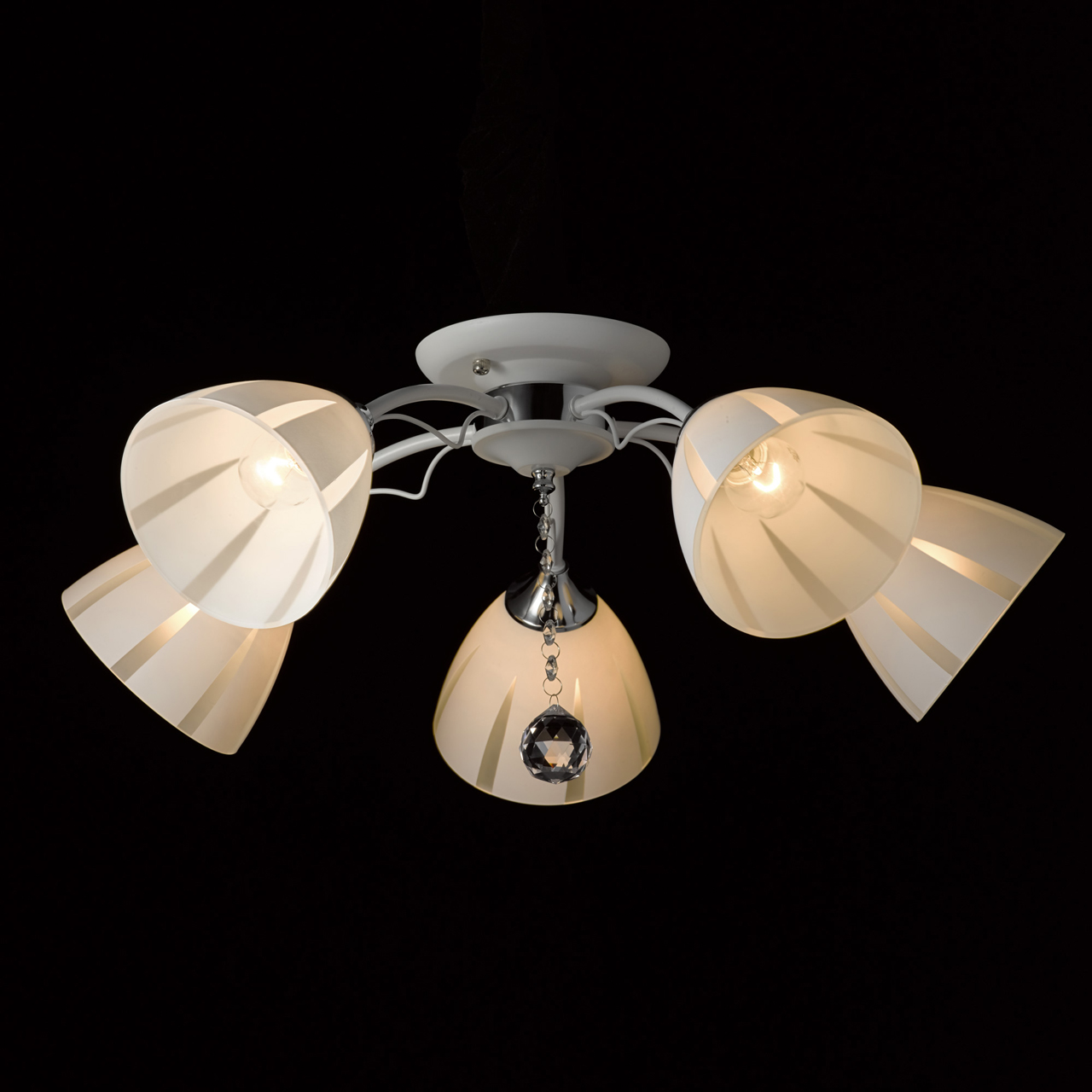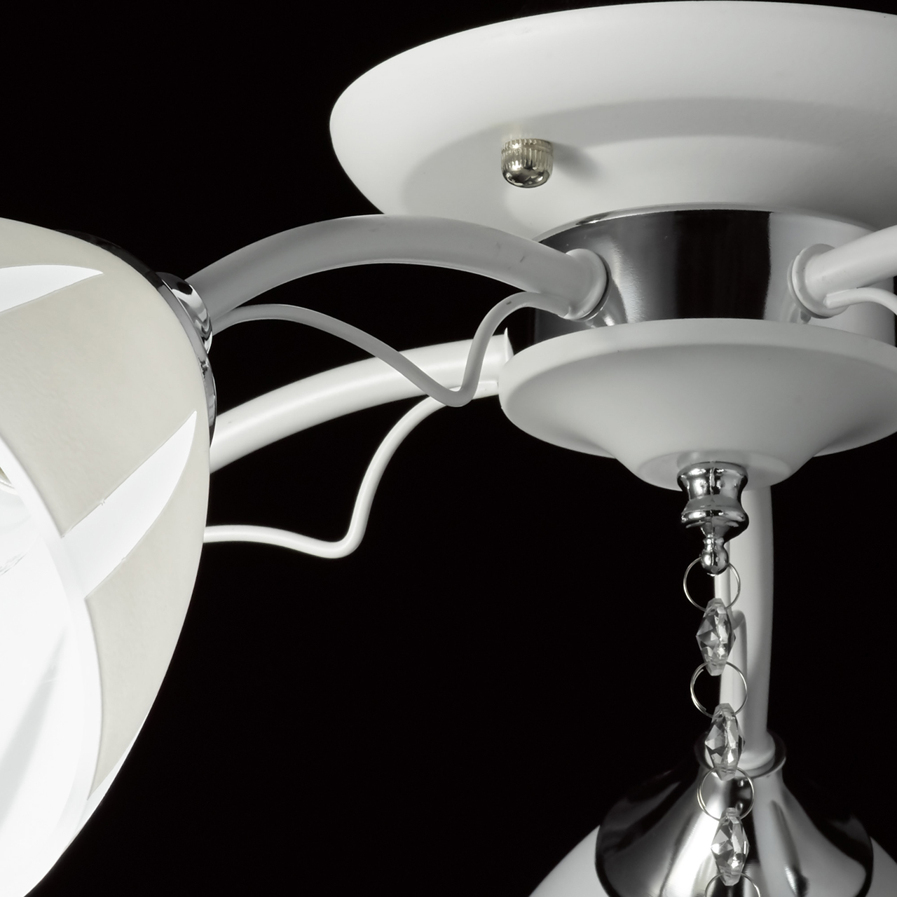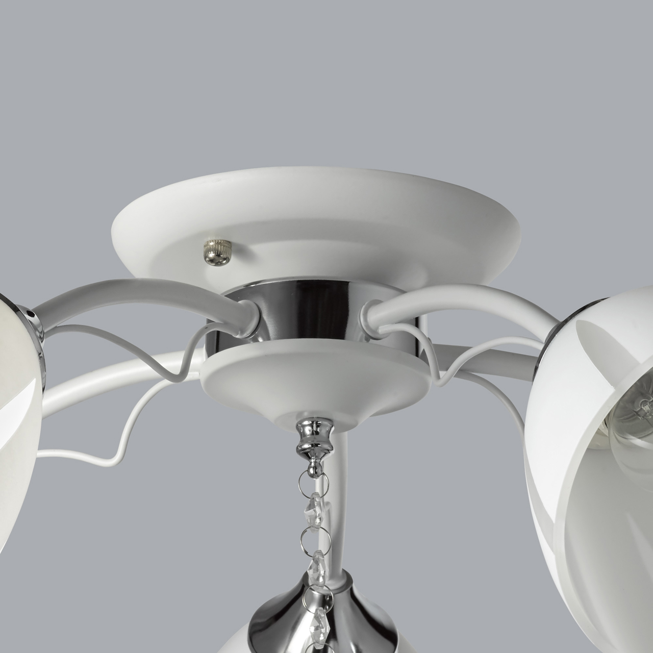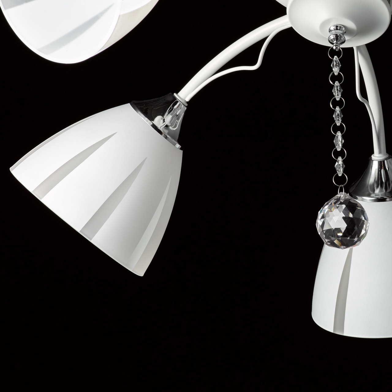 Основание светильника выполнено из металла и окрашено в белый цвет. Отдельные элементы основания гальванизированы в цвет хрома. Стеклянные матированные плафоны окрашены в белый цвет по трафарету. Светильник декорирован прозрачным хрусталем в форме шара.
