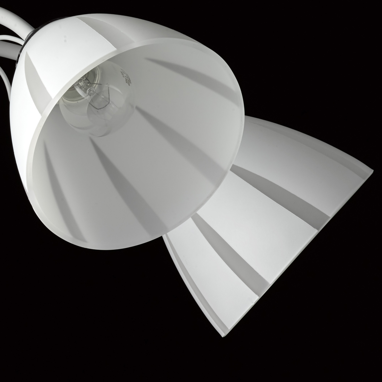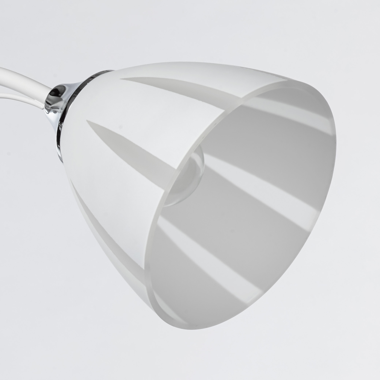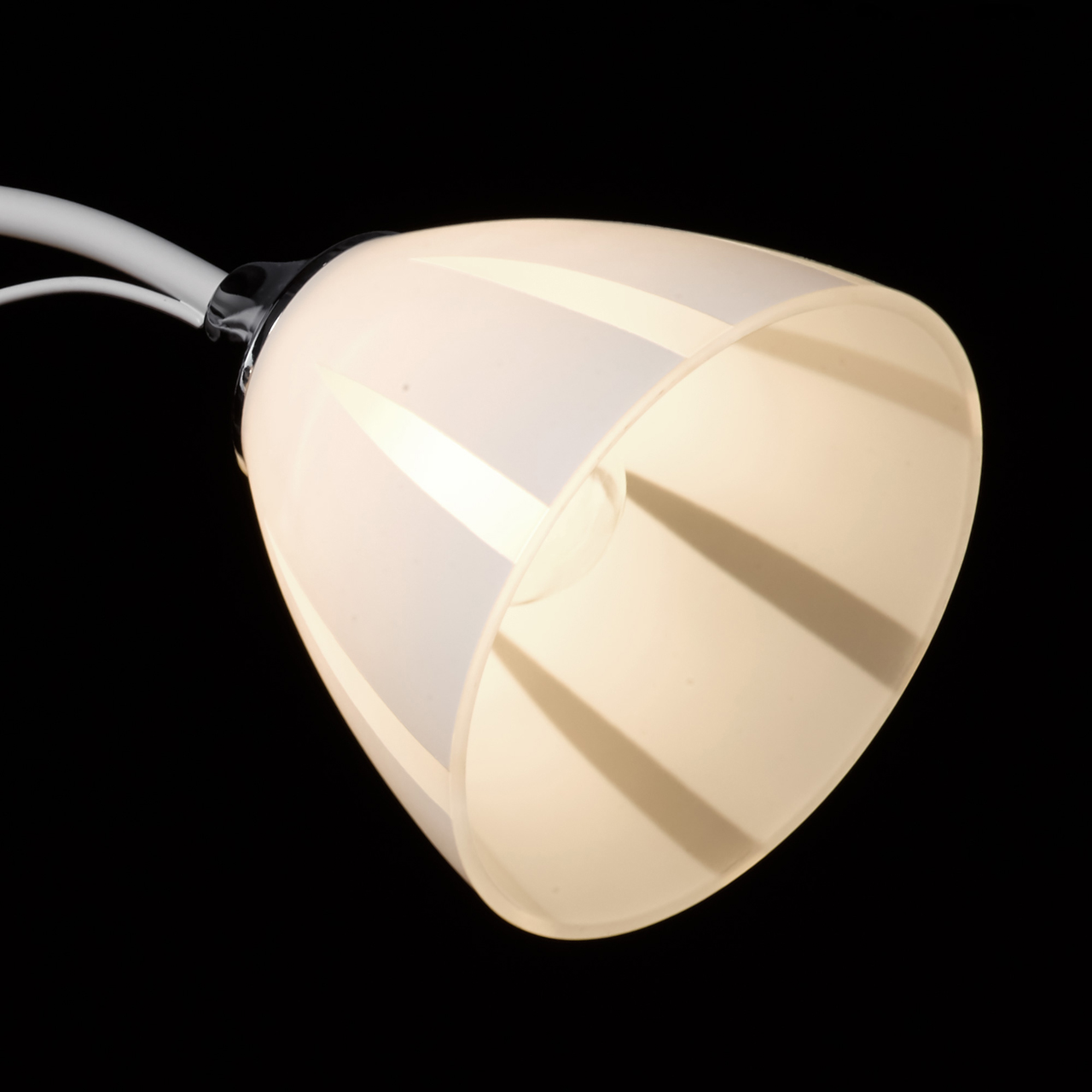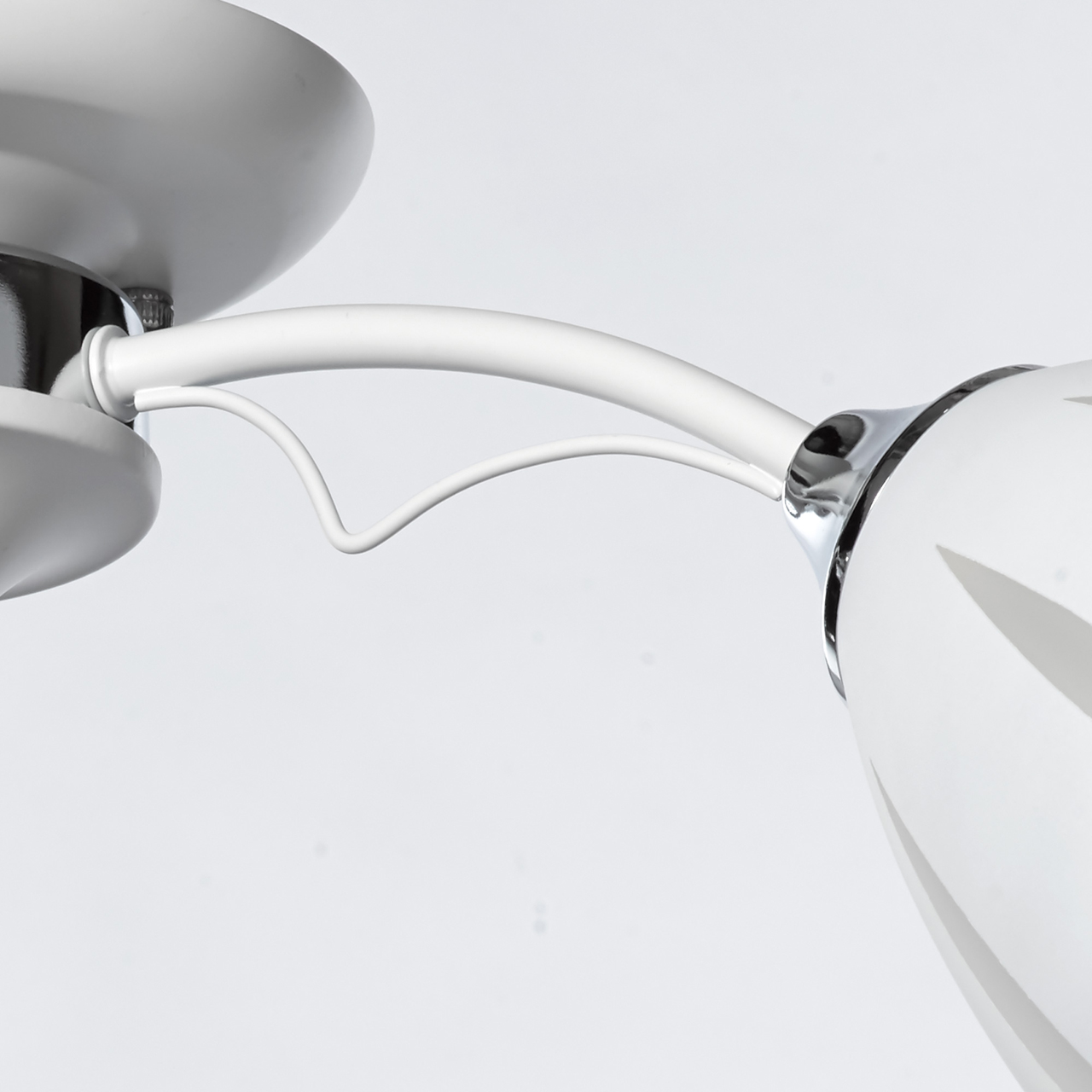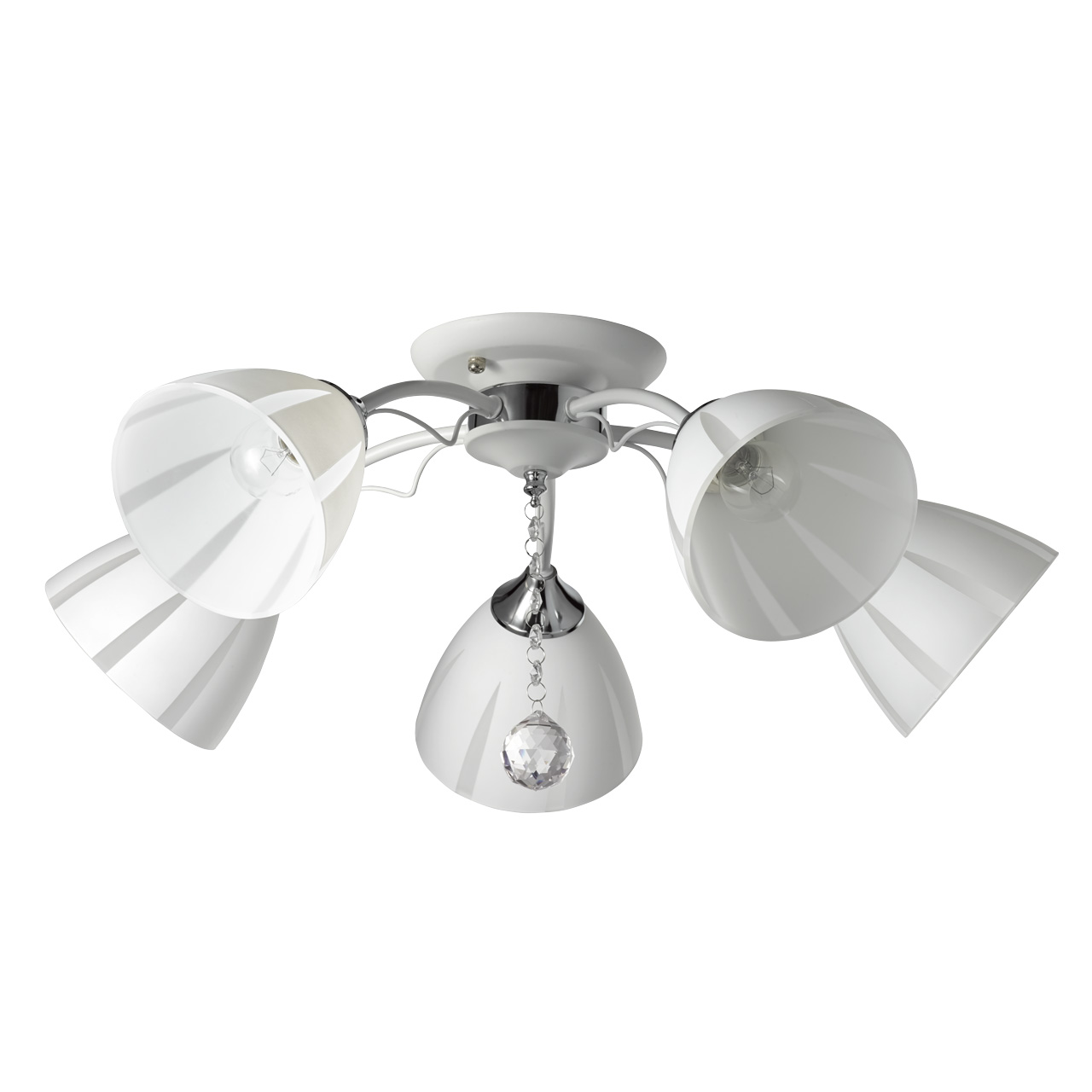 Основание светильника выполнено из металла и окрашено в белый цвет. Отдельные элементы основания гальванизированы в цвет хрома. Стеклянные матированные плафоны окрашены в белый цвет по трафарету. Светильник декорирован прозрачным хрусталем в форме шара.