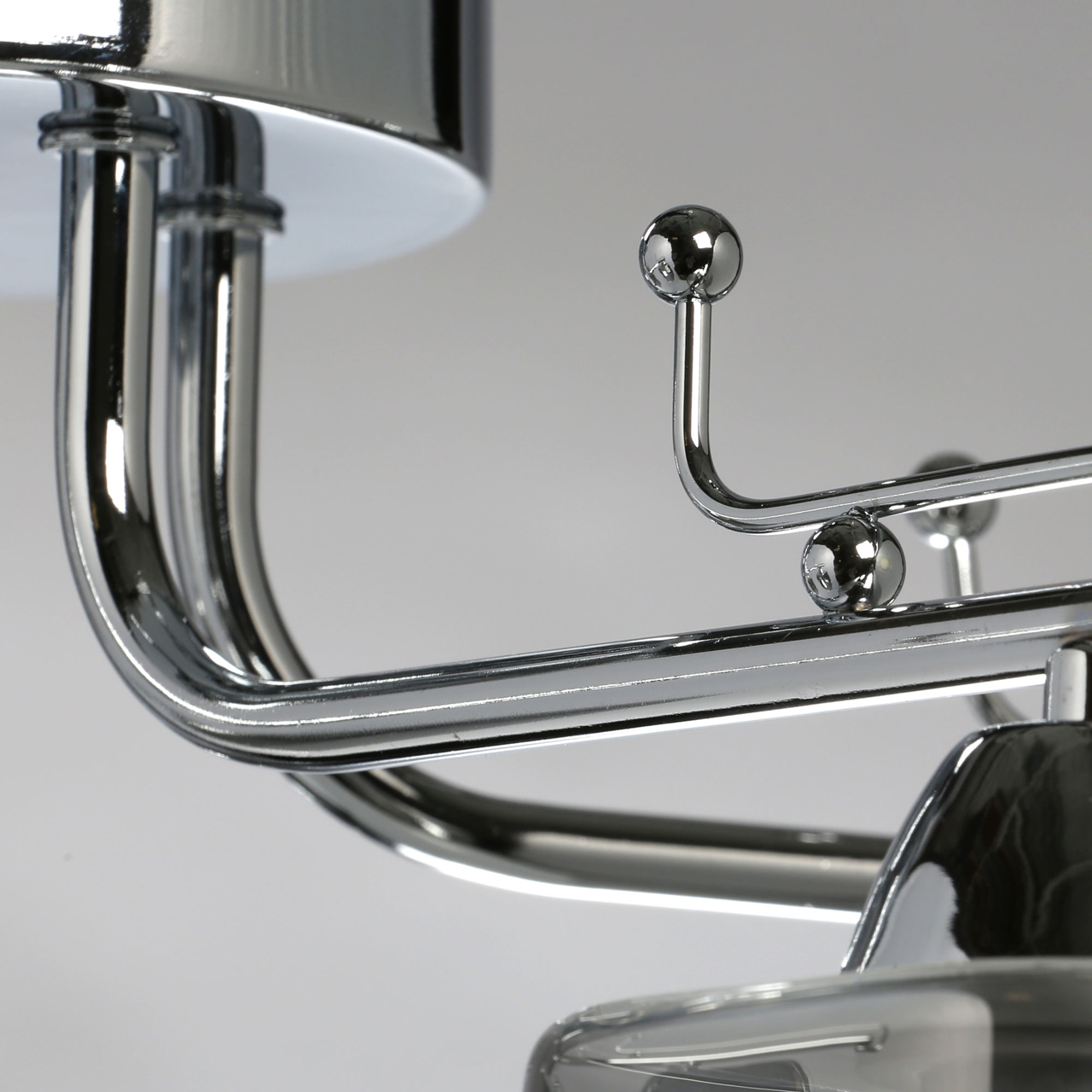 Основание светильника выполнено из металла и гальванизировано в цвет хрома. Стеклянные плафоны гальванизированы в дымчатый цвет.