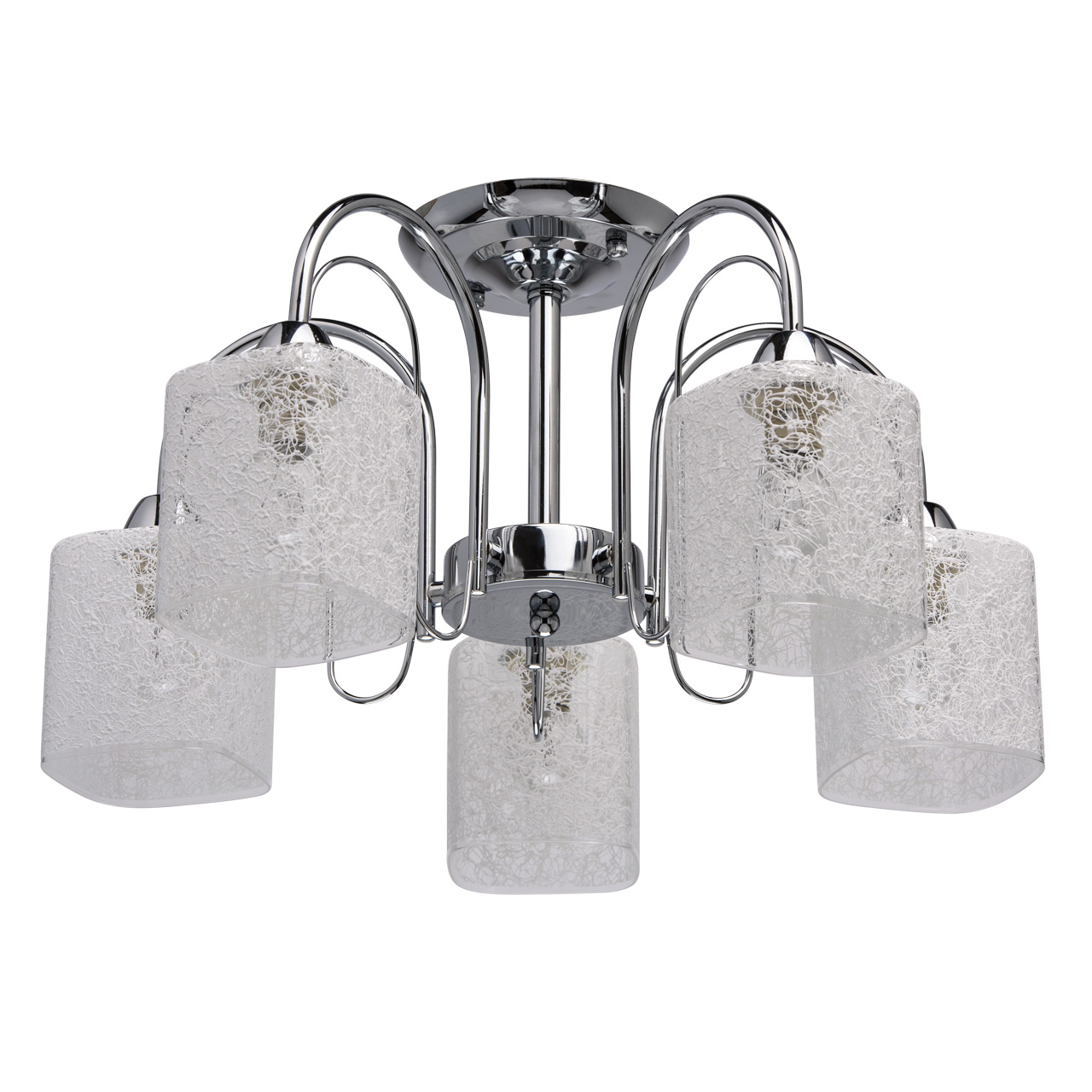 Основание: сплав металла, гальванизировано в цвет хрома. Потолочная чаша, декоративные розетки, корпус: обработка на токарном станке.Рожки, декоративные элементы: прокат на роликовом станке.Плафоны: прозрачное стекло, на стекло нанесен вручную хаотичный рисунок белой краской.