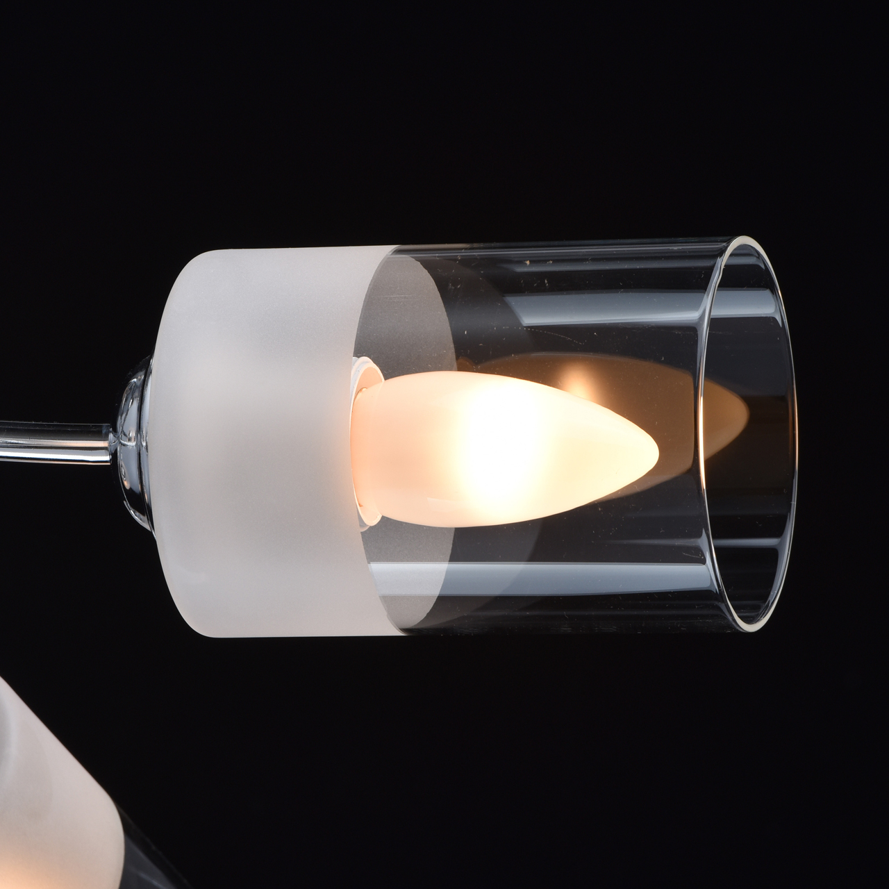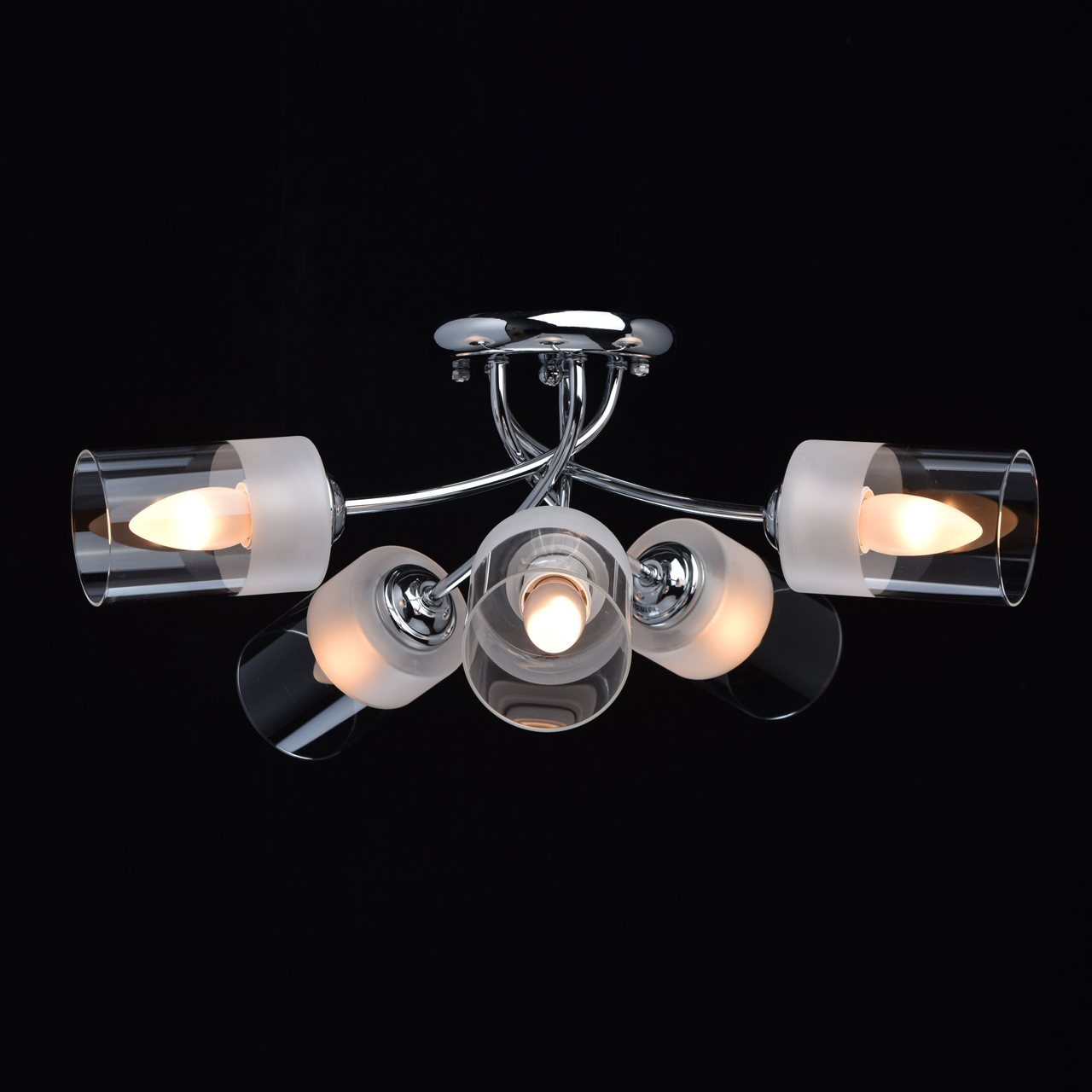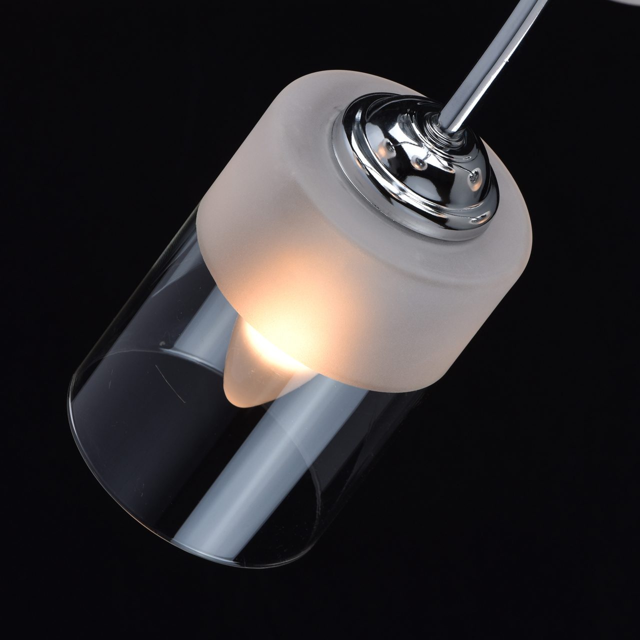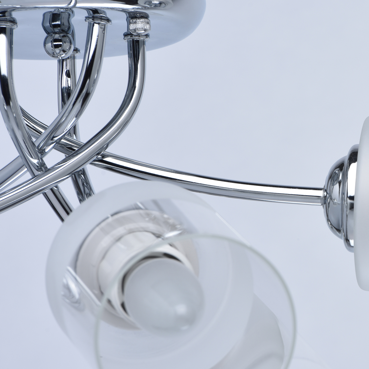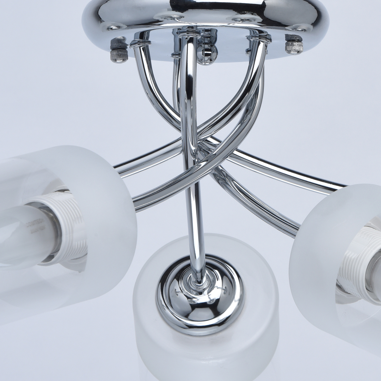 Основание светильника выполнено из металла и гальванизировано в цвет хрома. Стеклянные плафоны отлиты в форму и наполовину матированы .